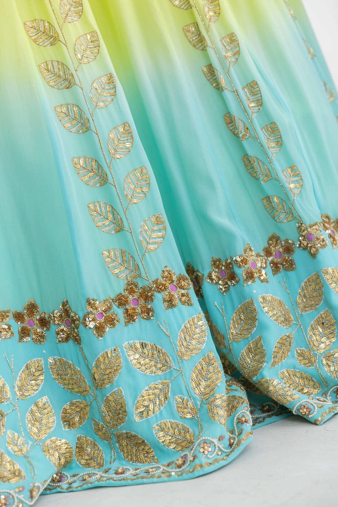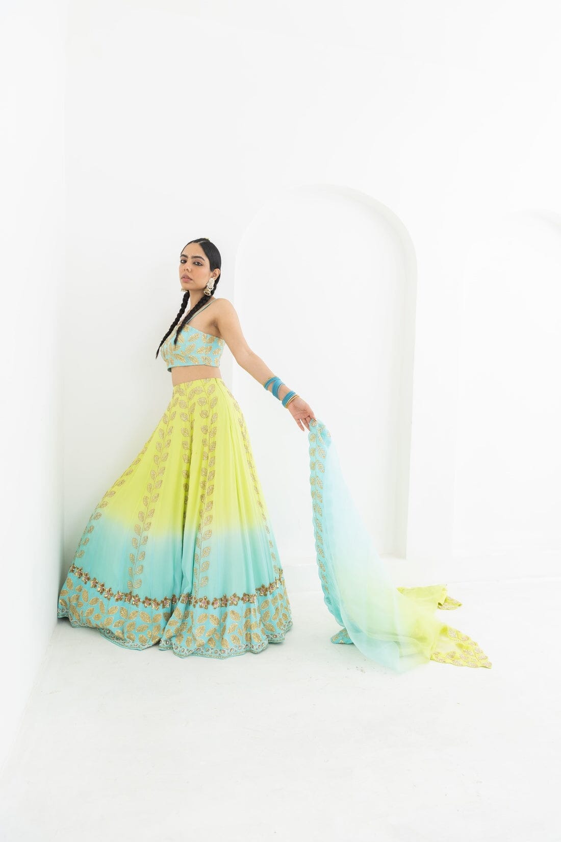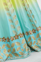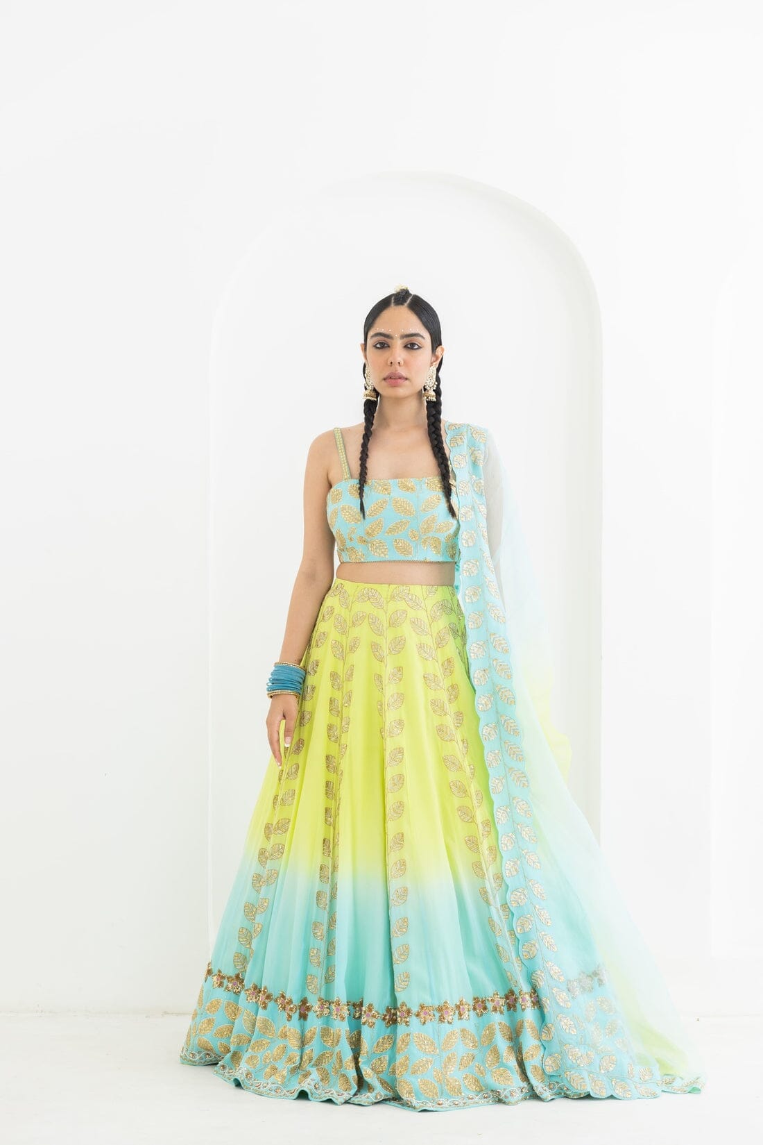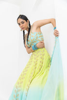 This lehnga is dyed in a beautiful lime to aqua ombre , has leaf motifs encrusted with gold sequin embroidery. Its combined with a gold embroidered blouse and scalloped hand embroidered dupatta in organza.