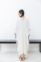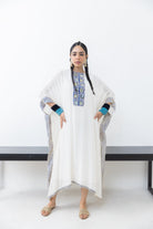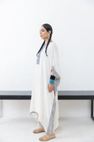 This ivory kaftaan made in crepe has a mirror and sequin work placket detail . The sides are printed in navy with rectangular sequin hand embroidery all around . The skirt has can-can and can be removed at request. The blouse is padded.