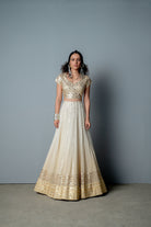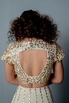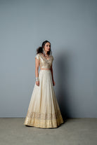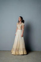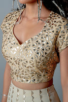 Our signature Georgette lehnga made with foiling and block printing techniques ,then hand embroidered with geometric sequins at the hem and kalis. The blouse is fully hand embroidered using interesting matt and glossy sequins giving a mirror mosaic like feel. the dupatta is made in ombre georgette with a broad foil border on all 4 sides , then hand embroidered.