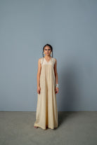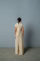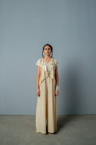 Hand block printed crepe oversized jumpsuit to fit all body types ,paired with structured yet draped hand embroidered jacket with a triangle mesh texture.