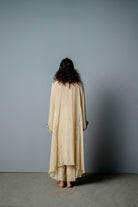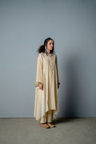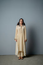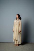 This kurta set is made in cotton satin and georgette with placement printing and intricate cutdana embroidery detail on the pracket. It's combined with cotton cigarette pants.