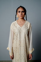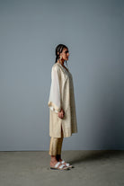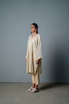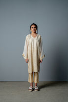 The kurta is cut in kashmiri pheran style , with custom screen print of intricate mosaic jaali in front and stripes at the back. The front of this kurta is intricatly hand embroidered with mirror and cutdana all over . It is teamed with cotton satin cigarette pants.