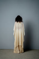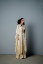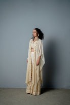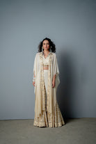 The georgette sharara is made with triangular mesh hand block print all over , hand embroidered with glossy n matt triangular sequins. The haulter croptop has a stripe print detail with intricate cutdana hand emb. on hemm. This comes with a cape with a sheer ivory block print base and placement embroidery. The cape is also detailed with kauri hangings in places.