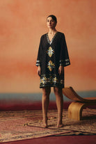 The Dhara Dress is soft denim short dress, featuring timeless Ikat-inspired patterns made in hand emboidered sequins and tassels