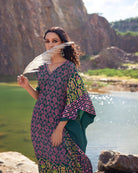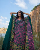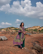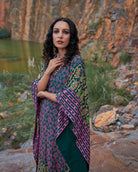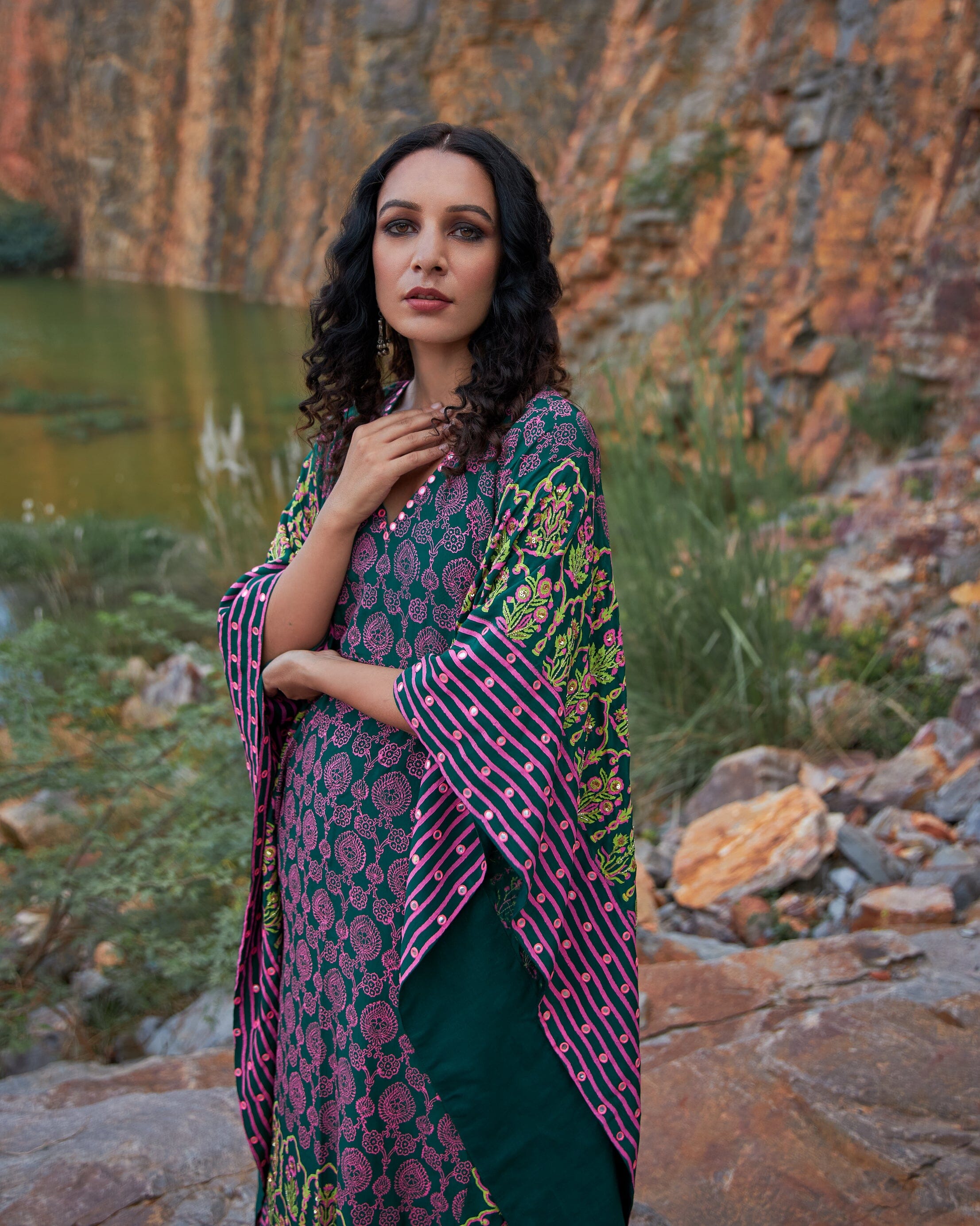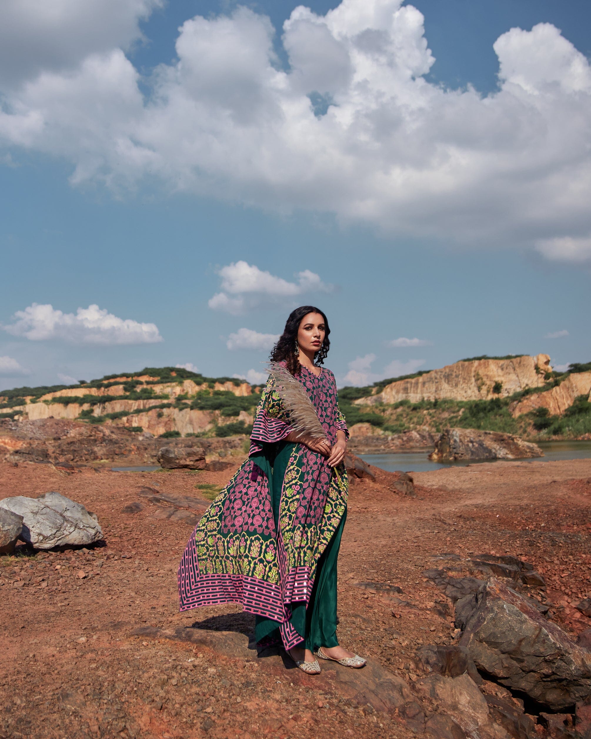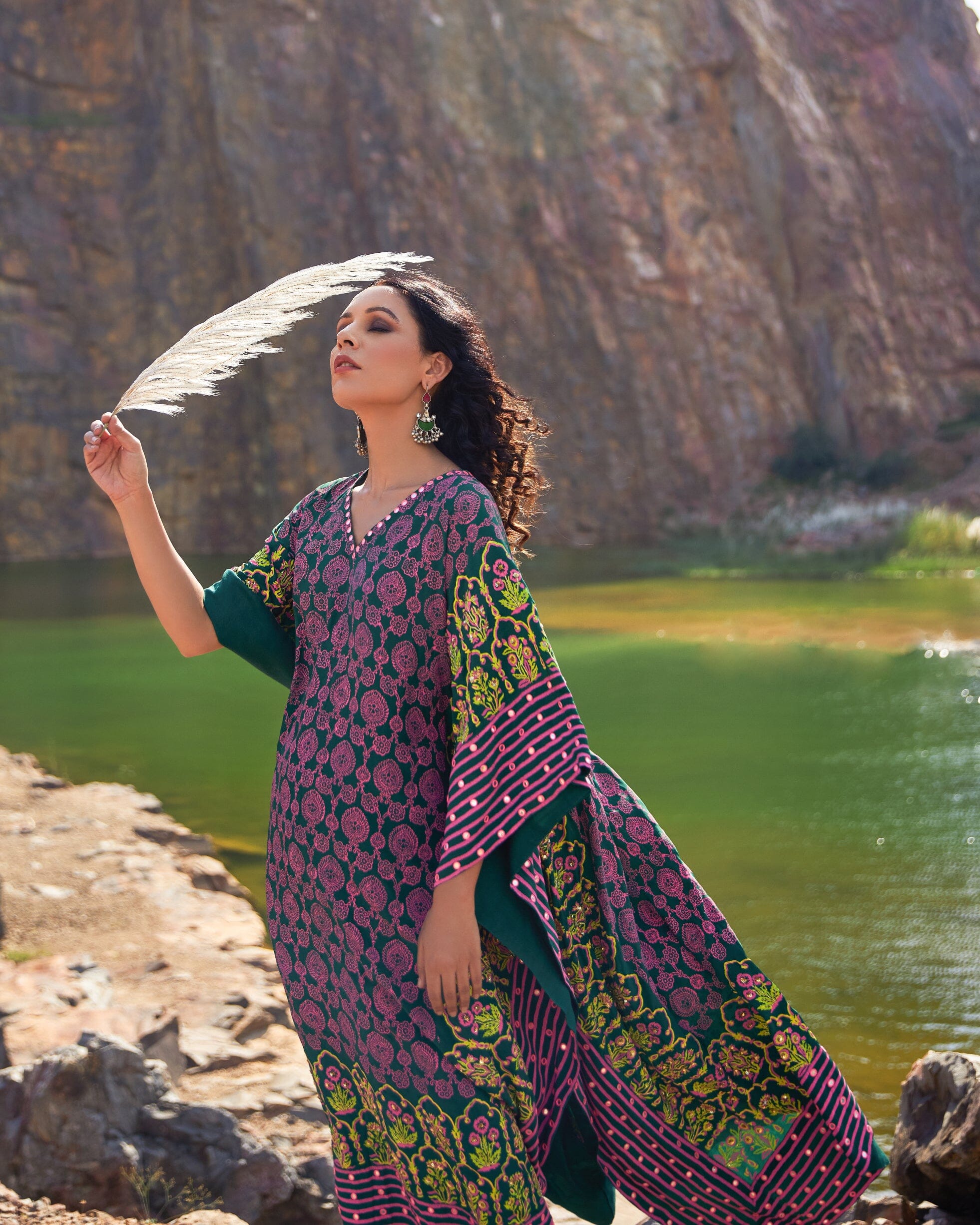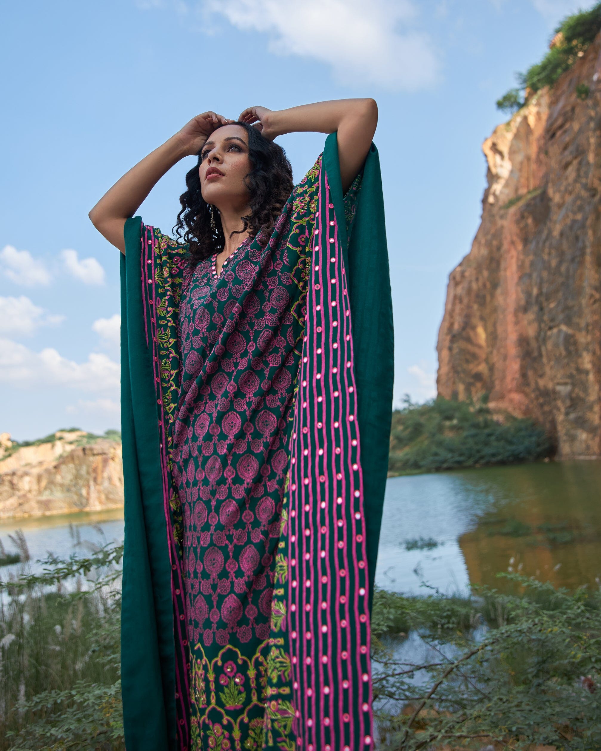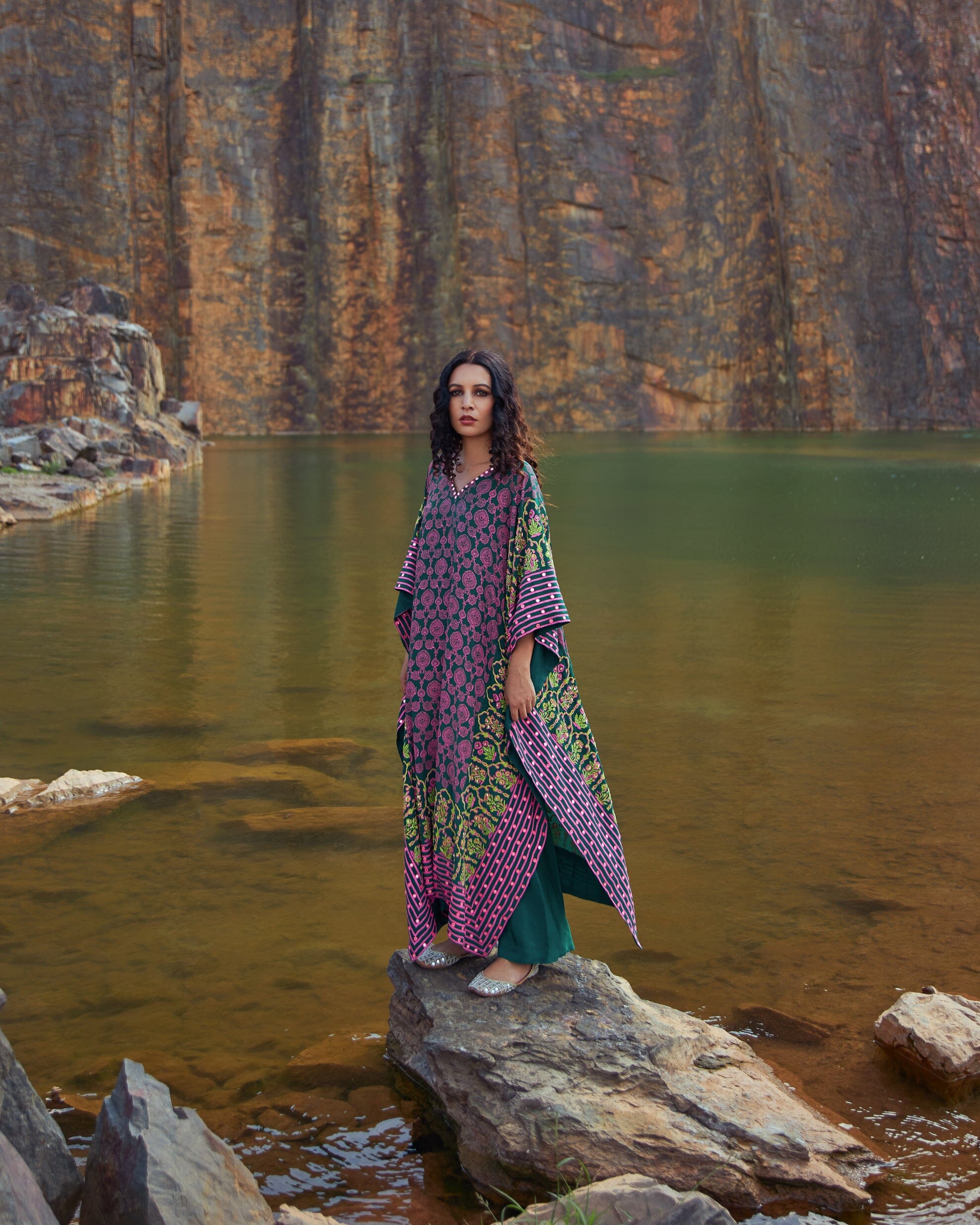 This kaftan set is made in 60 grams pure crepe with a custom print base embellished with geometric sequin and mirror hand embroidery all over front and back. Its teamed with crepe wide pants.