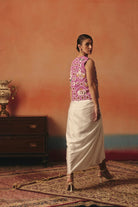 The Hansini Co-ord Set from our new festive edit’25 consists of a satin draped skirt and the traditional Ikat-inspired pattern and our signature sequins detailing on the top.