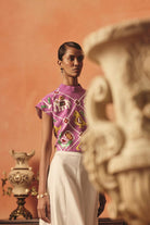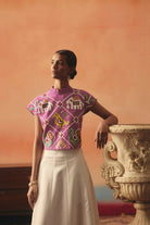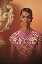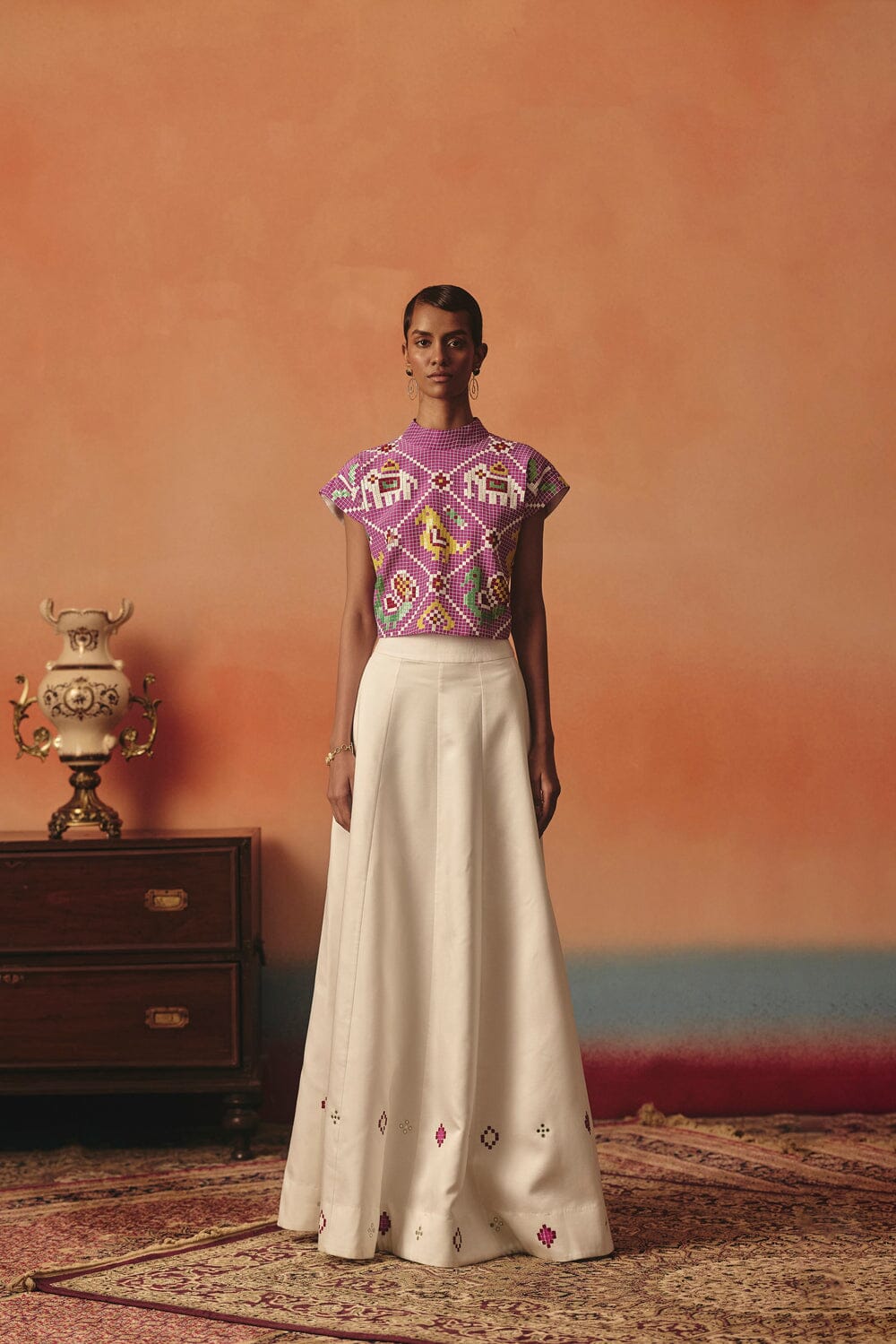 The Hansini Skirt Set is crafted from a luxurious blend of pure crepe and satin, featuring timeless Ikat patterns and our signature sequins detailing on the top.