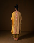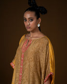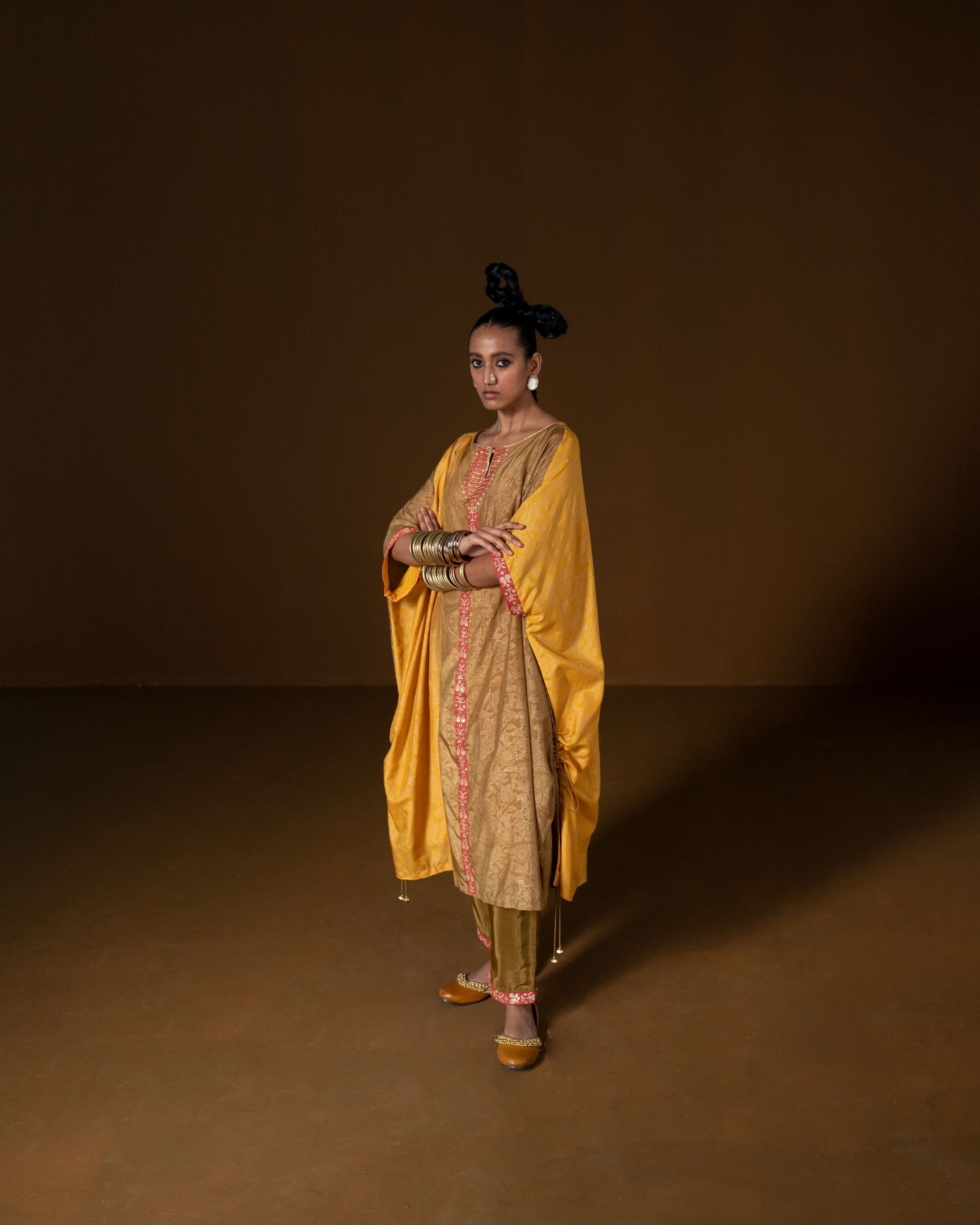 KASUNDI KAFTAAN: this kaftaan is made in summer silk fabric with sequin and mirror embroidery detail on the placket and center front + back. It has a tie up detail on the side hems, to give a fun shape to the oversized silhouette. Its teamed with silk cigarette pants with embroidered hem.