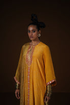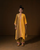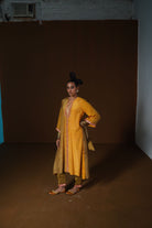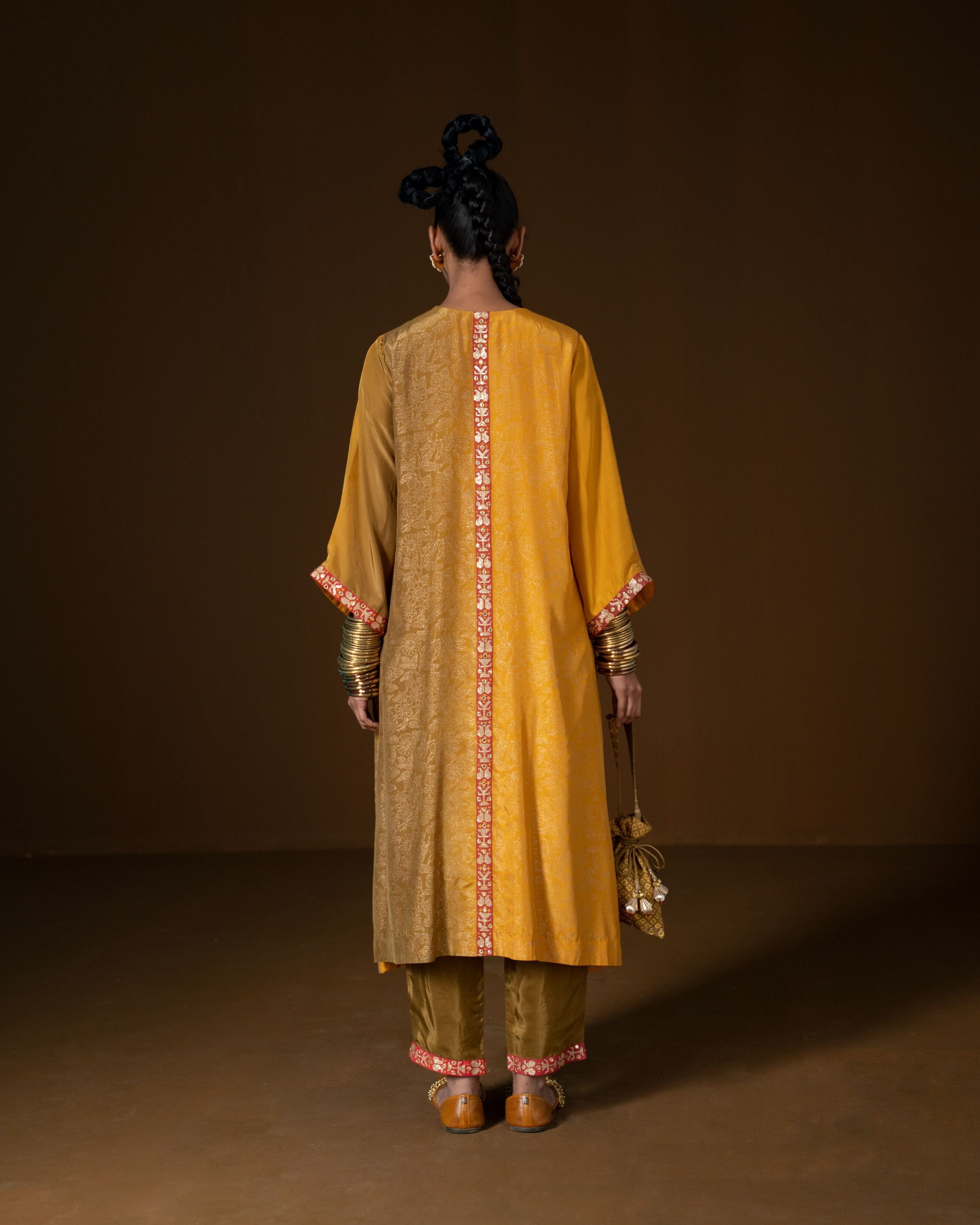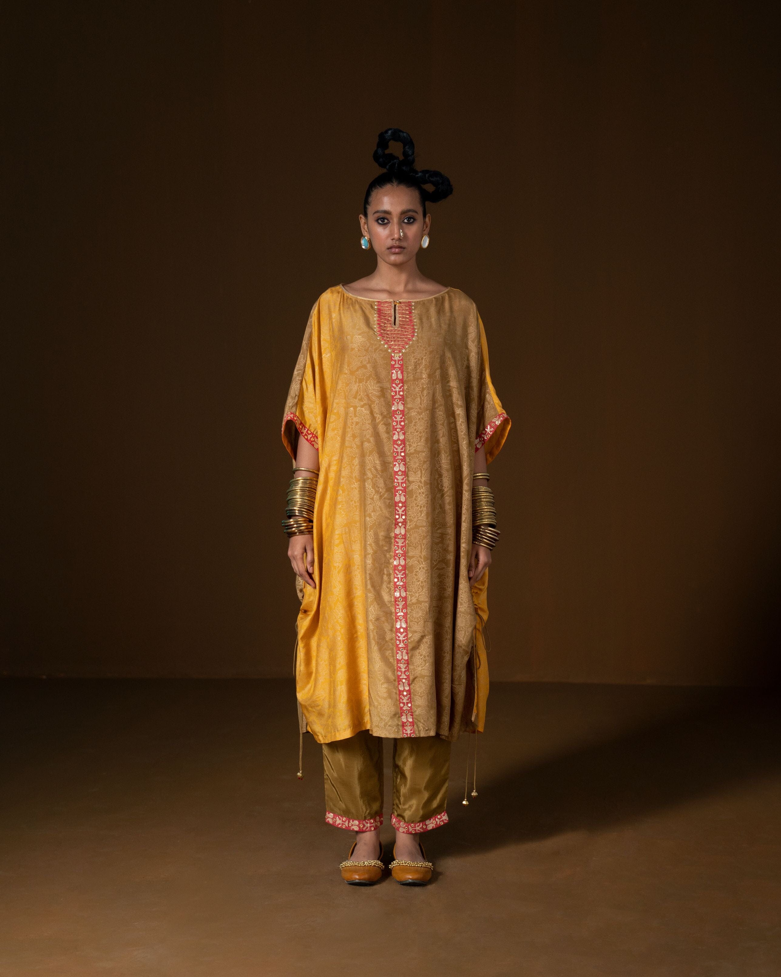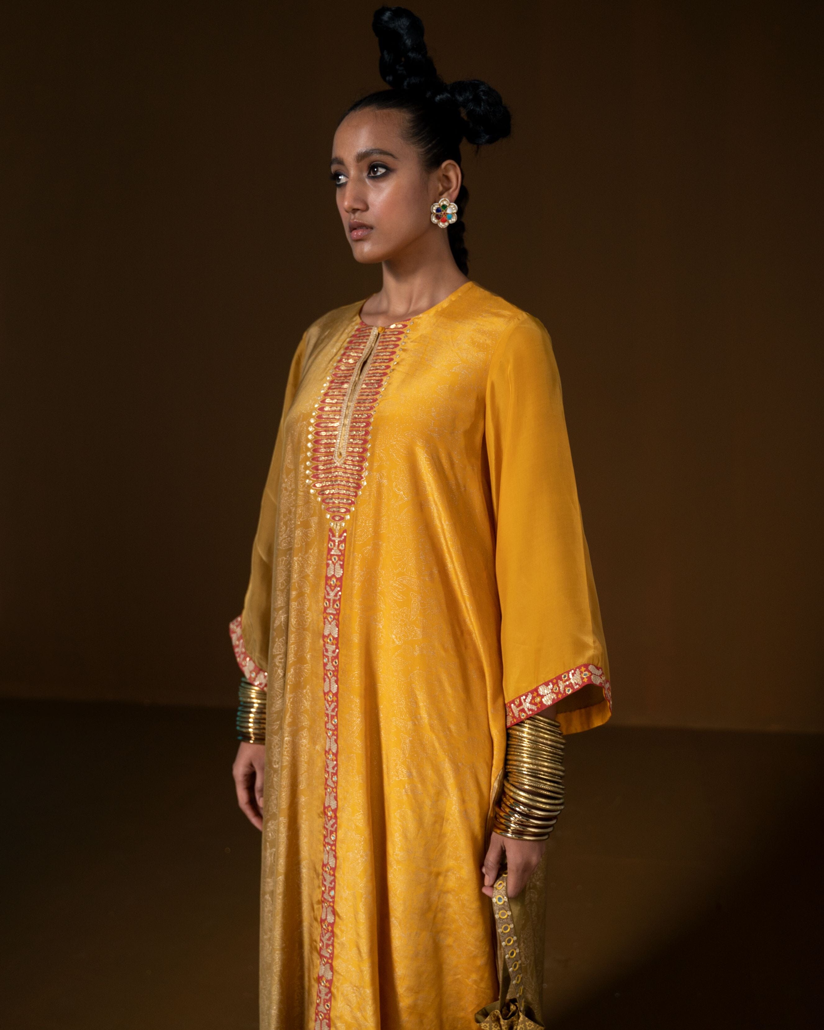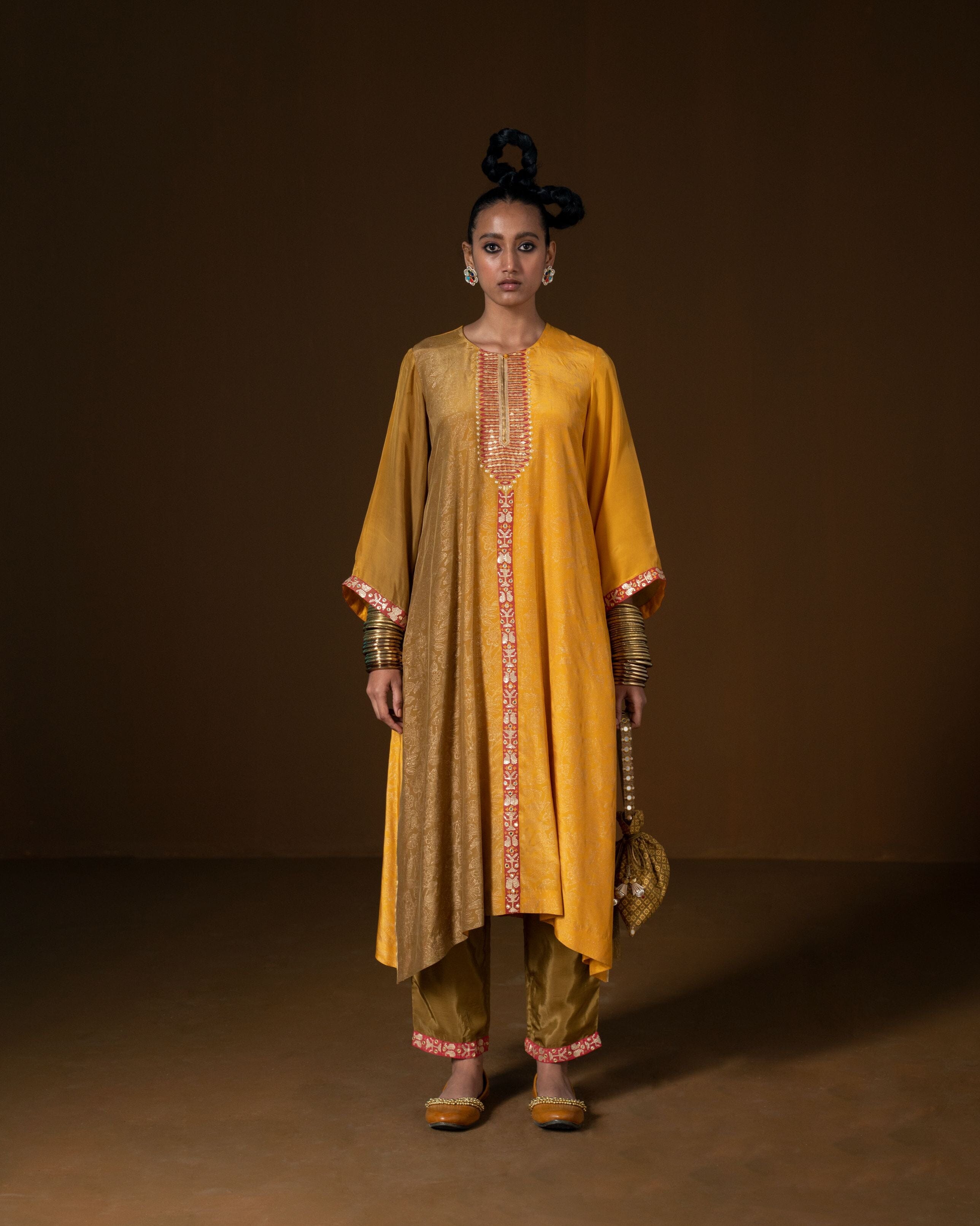 KASUNDI KURTA : This kurta + pants set is made in a plush summer silk with hand block print and intricate sequin embroidery on the placket. The ferozi line running on the pants , sleeves , center front and back are also detailed with very fine sequin work.