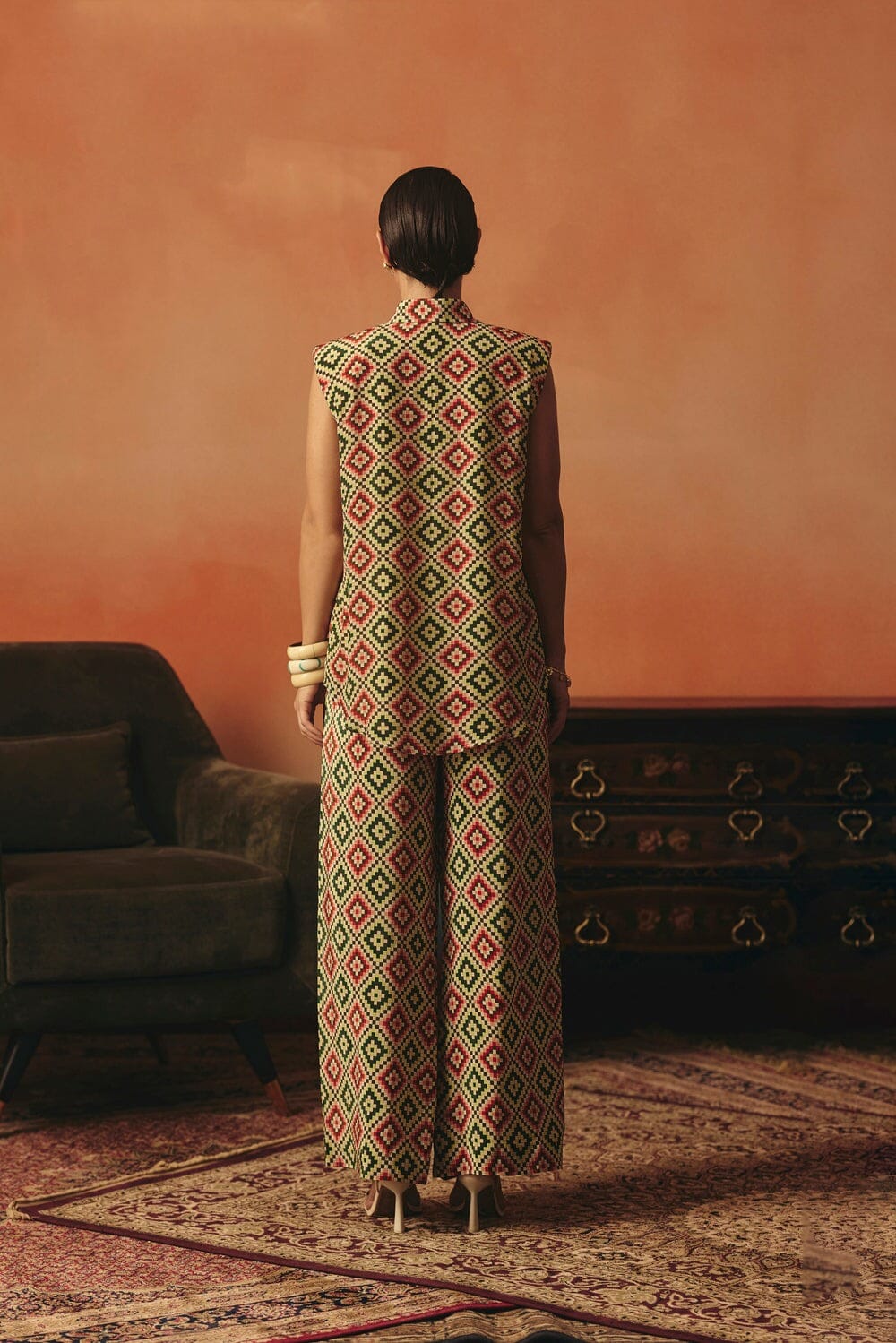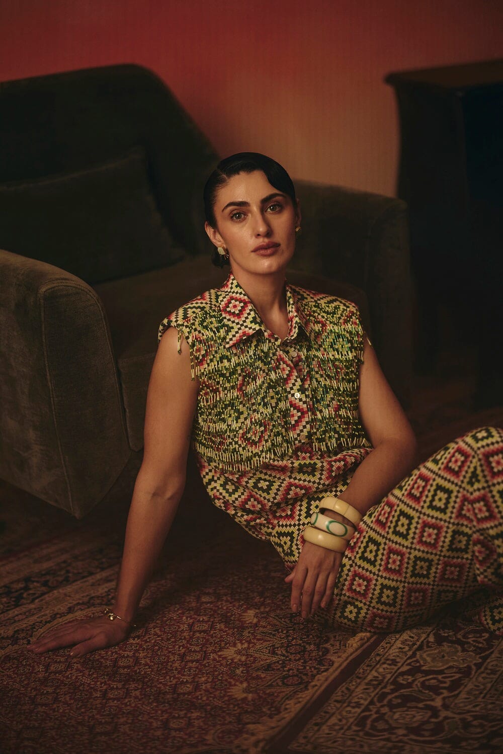 The Mayuri Co-ord Set is made in pure crepe and comes in digitally printed traditional Ikat-inspired pattern. Its has numeroused tassels hand emboidered with tiny crystals and beads on the top area. It also has a power shoulder detail .
