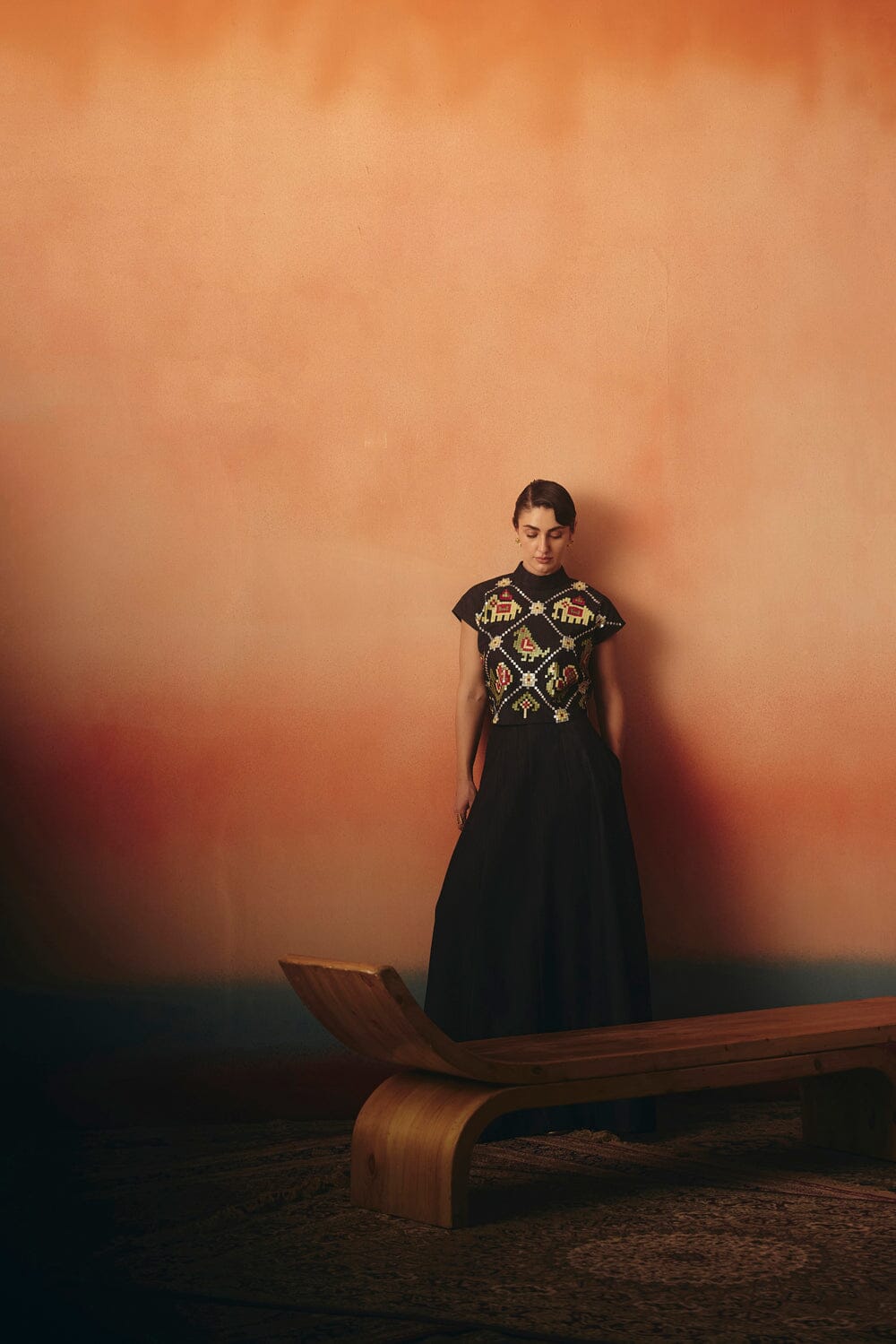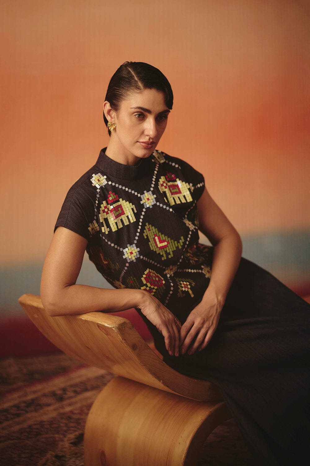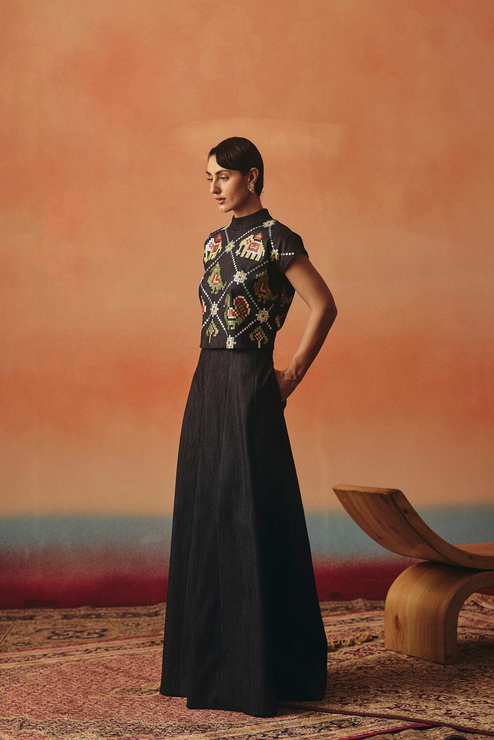 The Mithu Skirt Set is crafted from a soft stretch denim, featuring timeless Ikat patterns and our signature sequins detailing on the top.