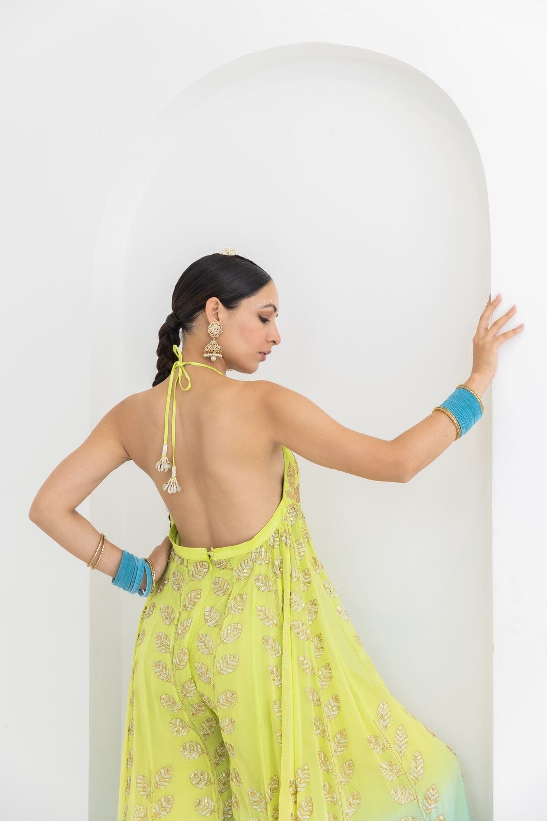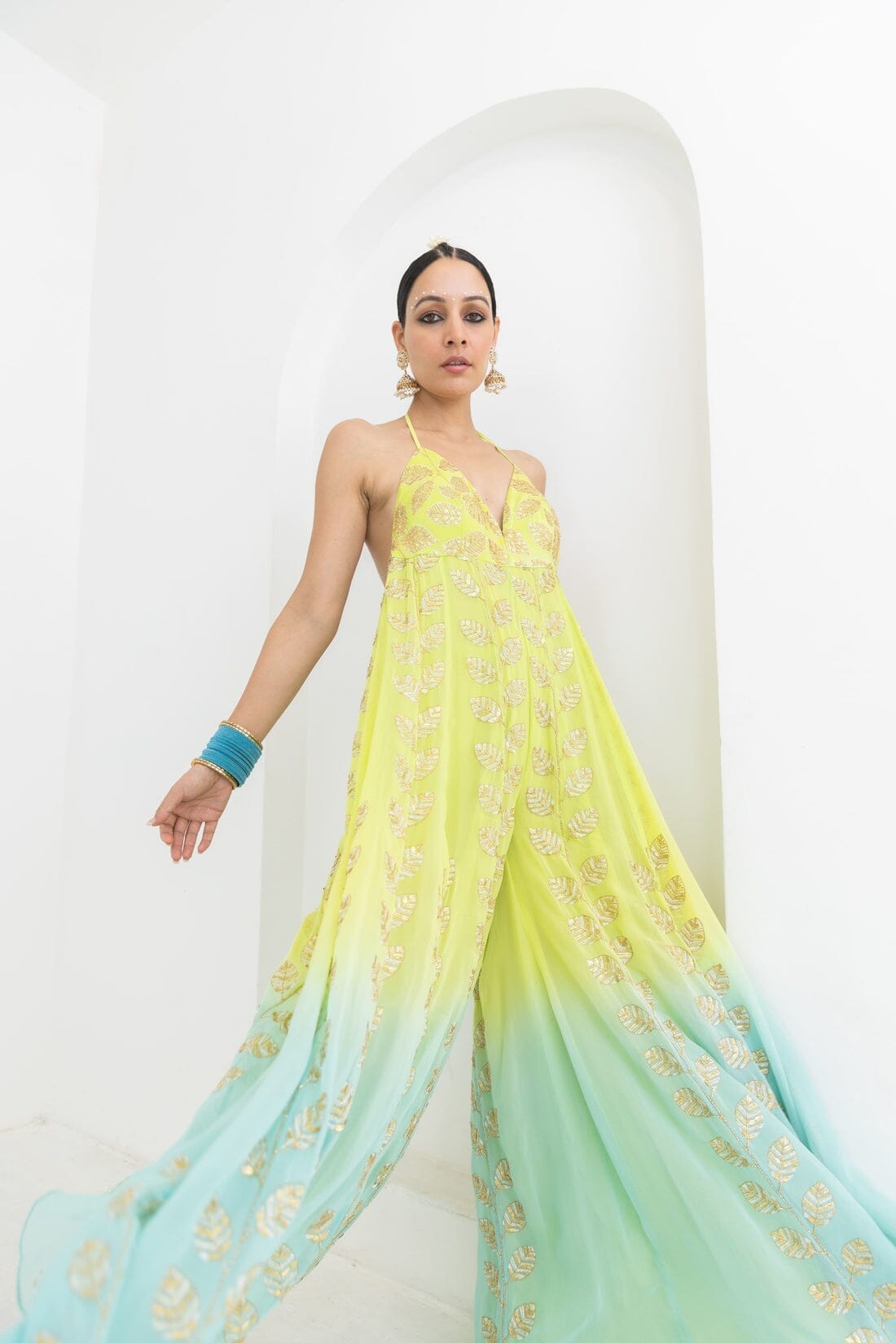 This jumpsuit is dyed in a beautiful lime to aqua ombre , having leaf motifs encrusted with gold sequin embroidery.