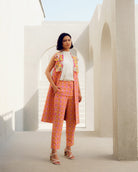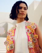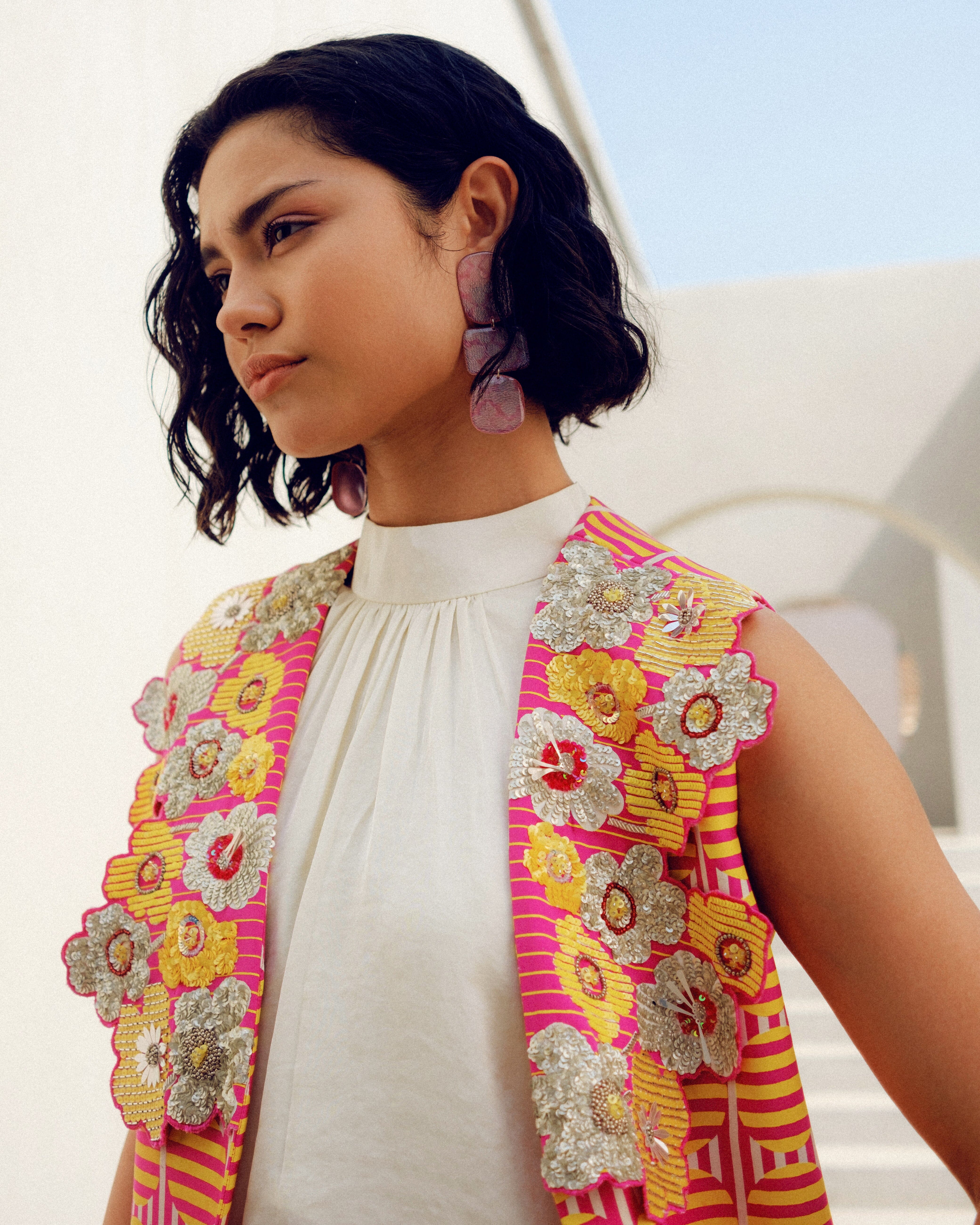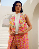 The Pink Fleur jacket is made of double georgette with a hint of pattern play. It features delicate floral embroidery and sequins detailing at the lapel.