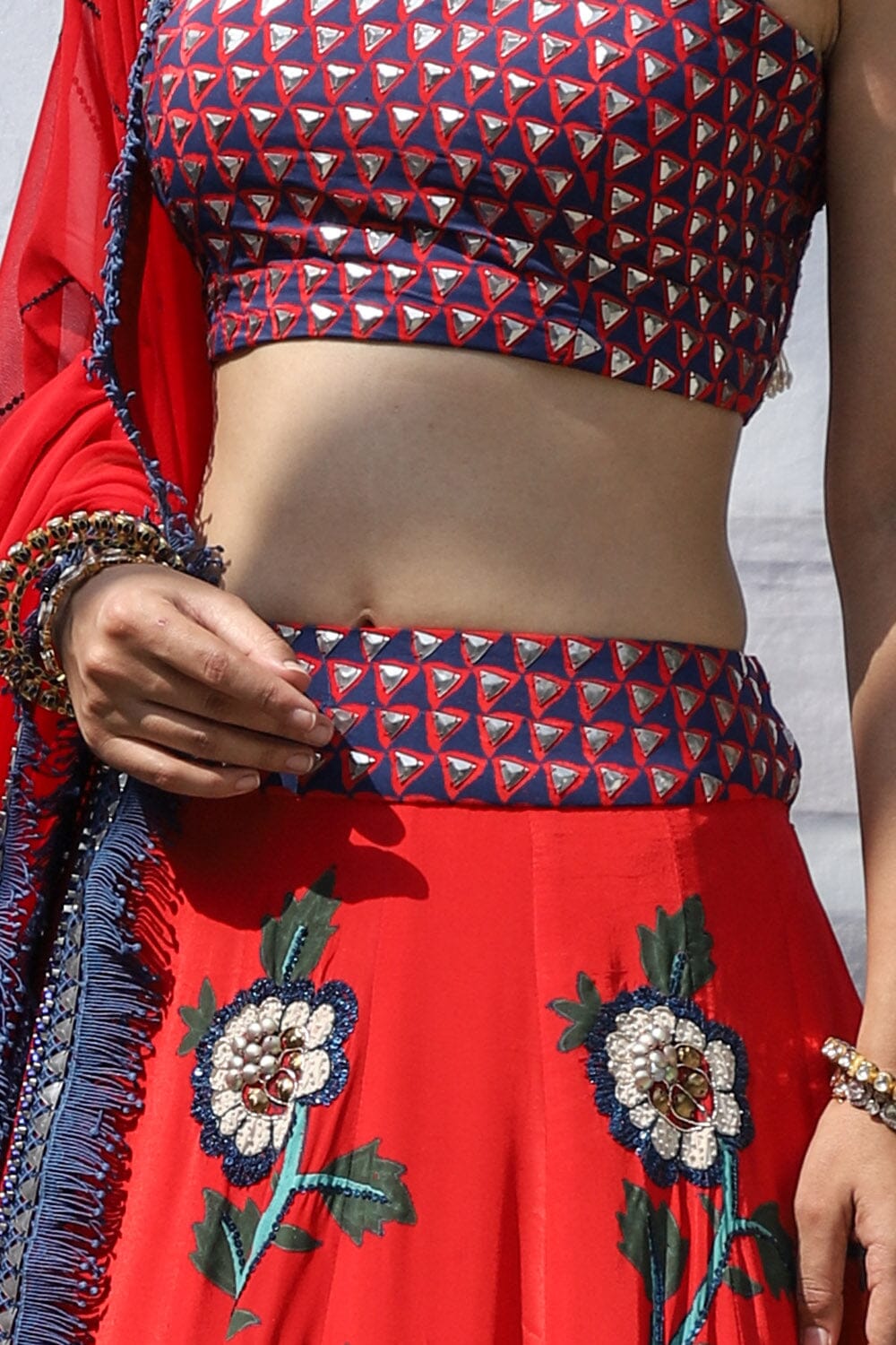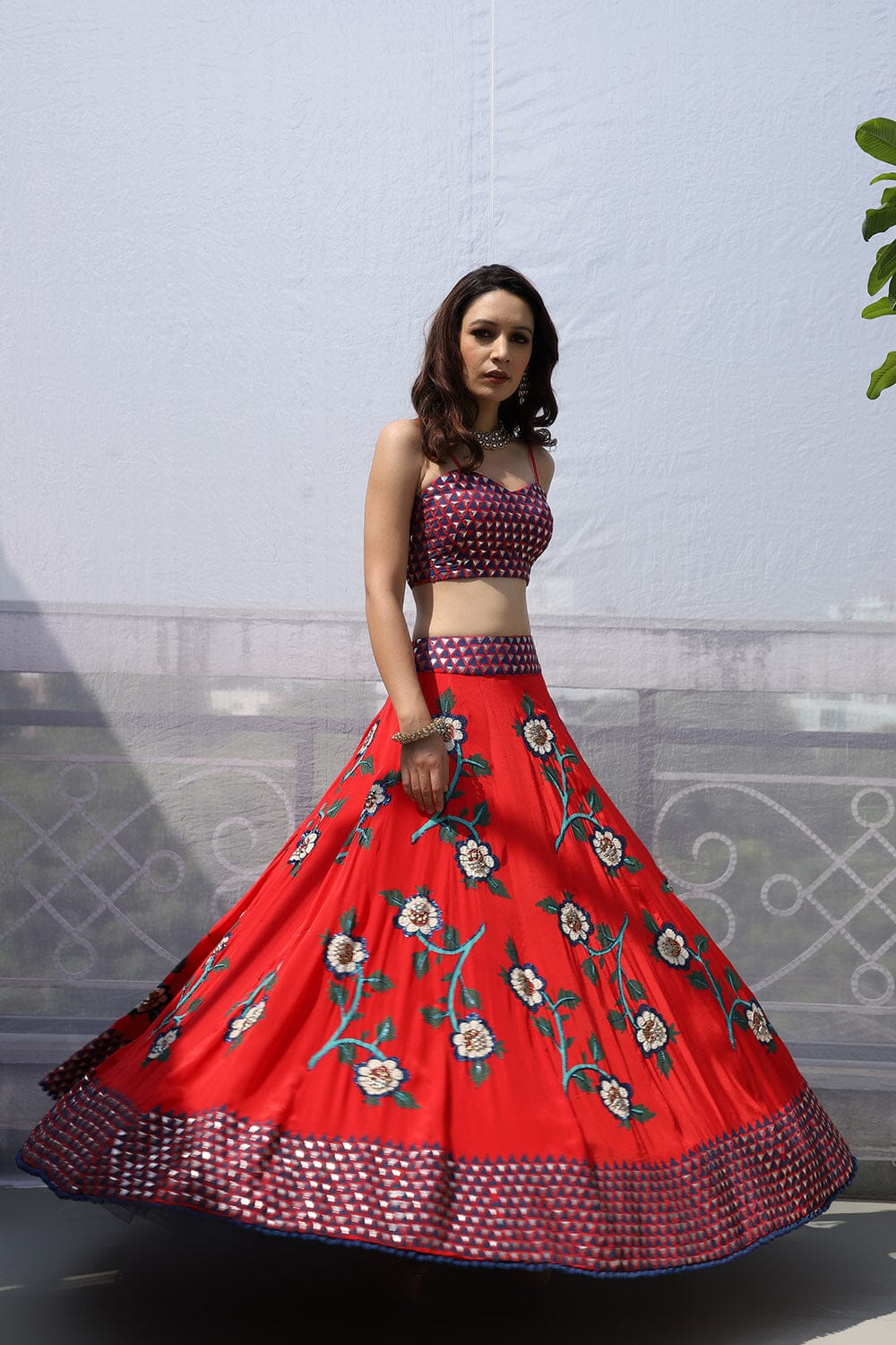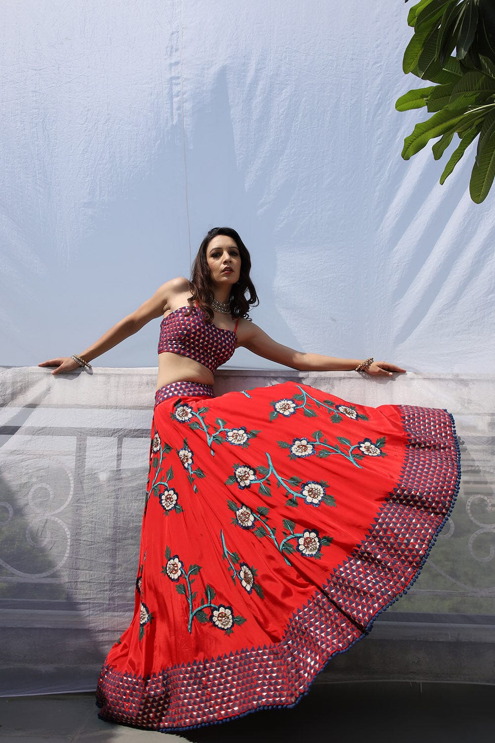 This beautiful and flowy Lehenga Set is a custom print base and geometric sequin which is hand-embroidered all over the ghera and the strappy crop top. The flower bootas are intricately hand-embroidered using mixed techniques. It’s teamed with a matching dupatta with fringes on all sides.