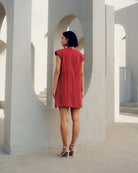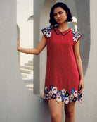 The Red Caroline power dress is made of pure crepe with padded shoulders. It features delicate floral and sequins detailing at the hemline and shoulders.
