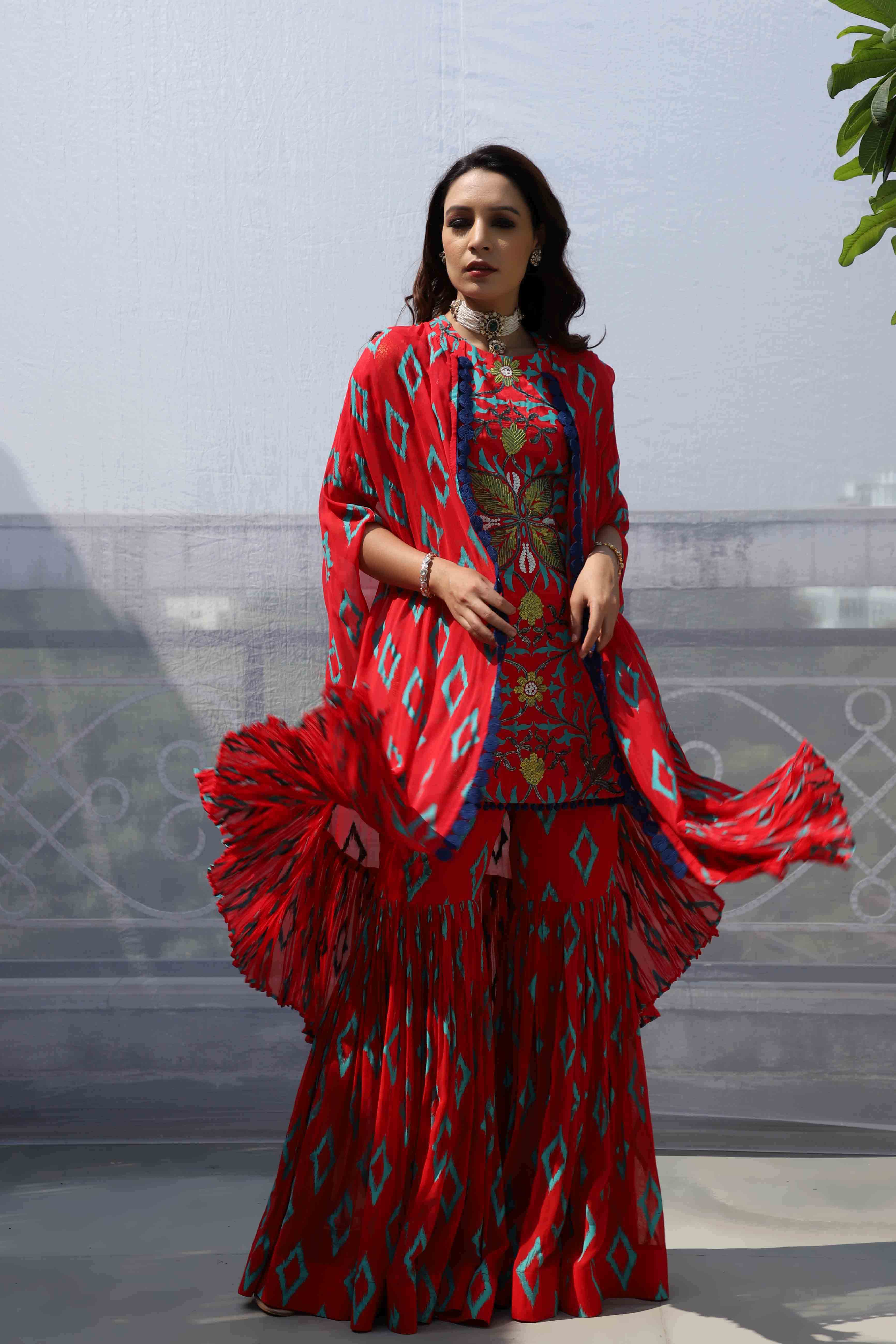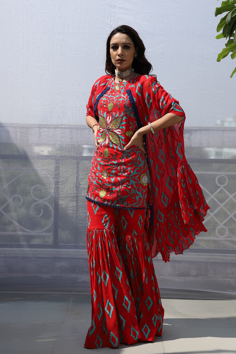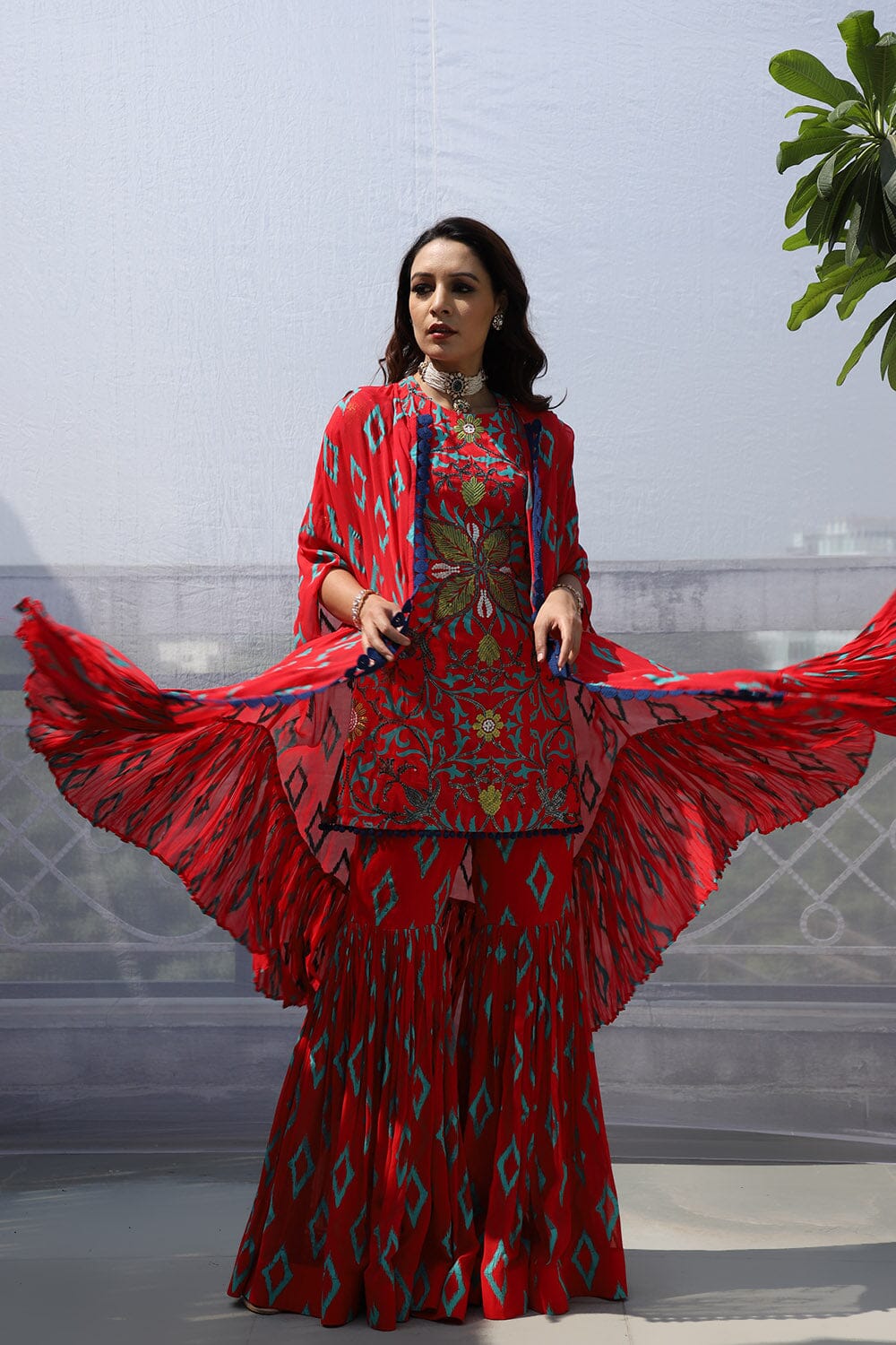 It is made in 60 grams georgette with custom screen print all over the sharara and cape. The Kurti top too has a custom screen print jaal with intricate hand sequin sheeting work all over. The outfit is detailed with very interesting cobalt blue crochet edging