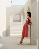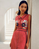 The Red Checked Mini Dress is made of double georgette with a flat collar. It features floral embroidery and sequins detailing at the upper torso.