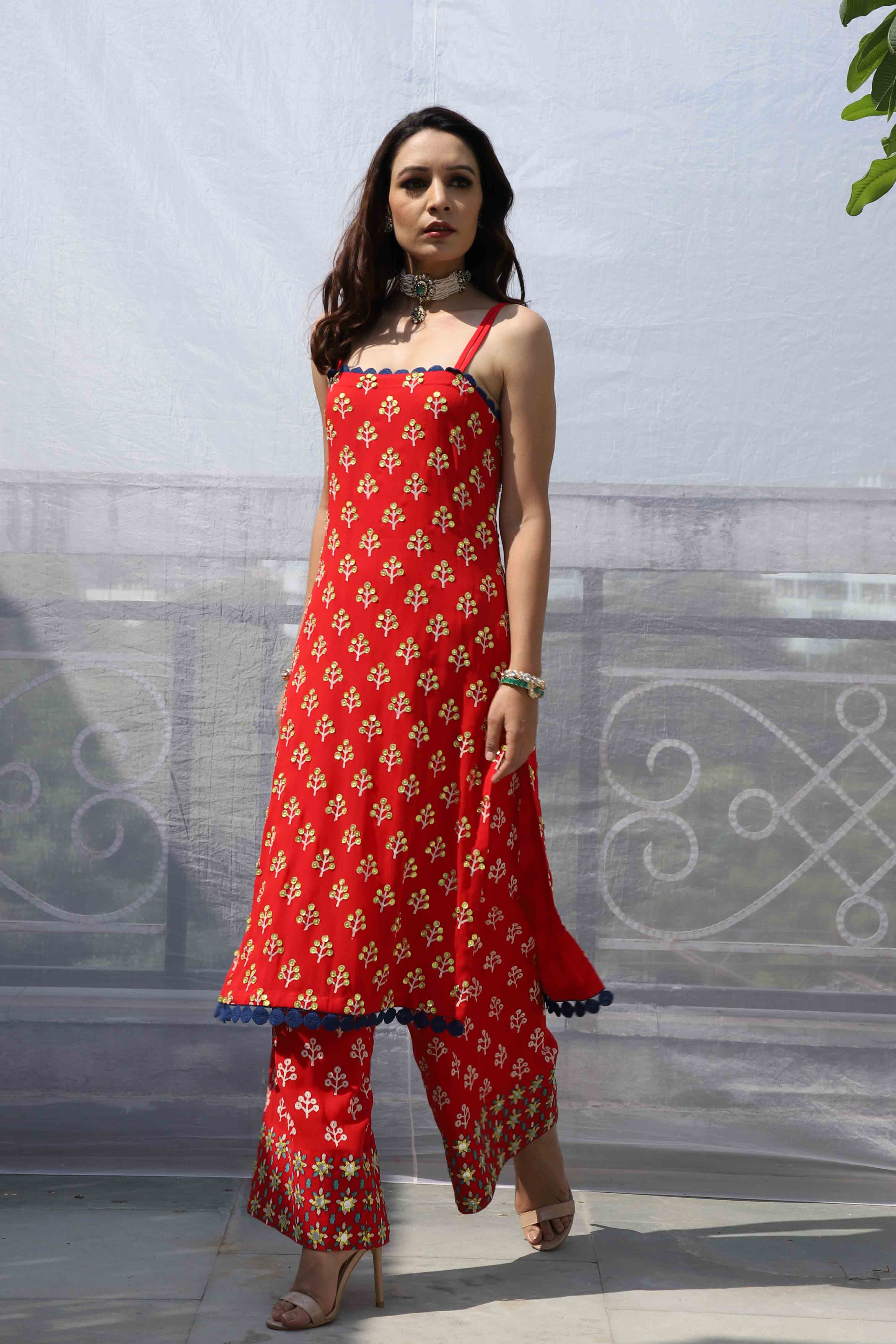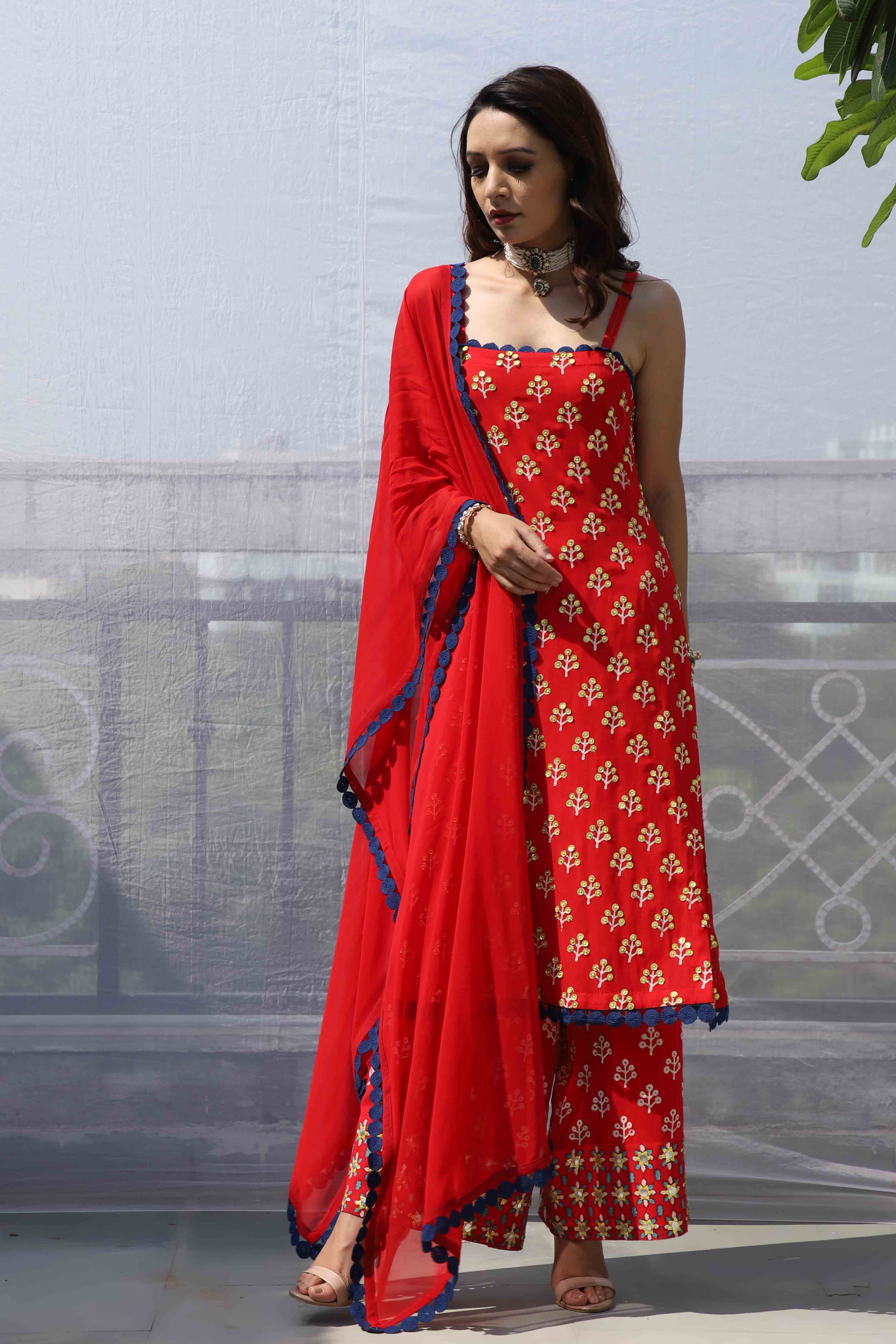 It is made in 60 grams georgette with a custom print base. The kurta is hand embroidered on both front and back with pop yellow sequin and pants have an embroidered hem. It is teamed with a georgette dupatta having crochet detail.