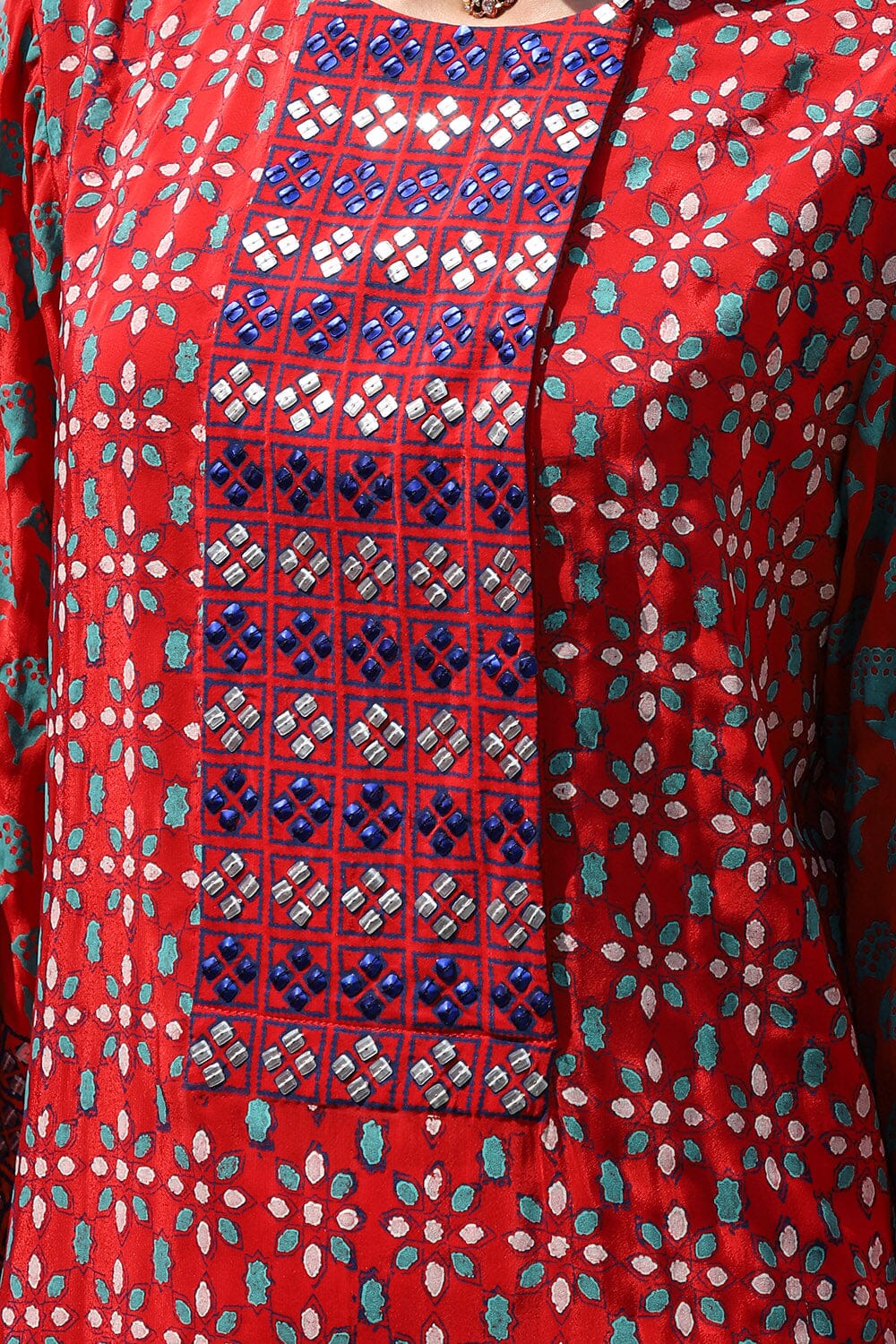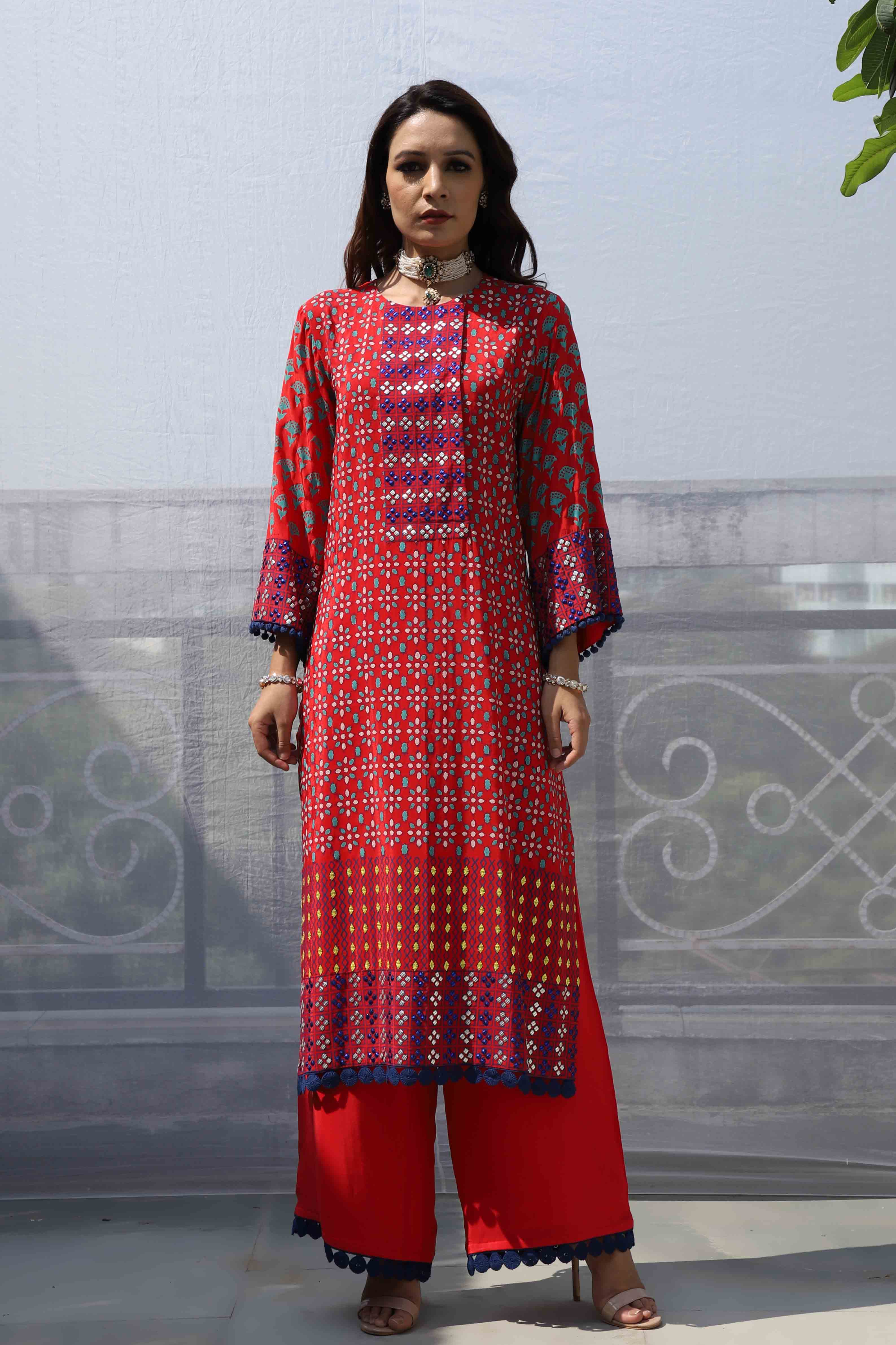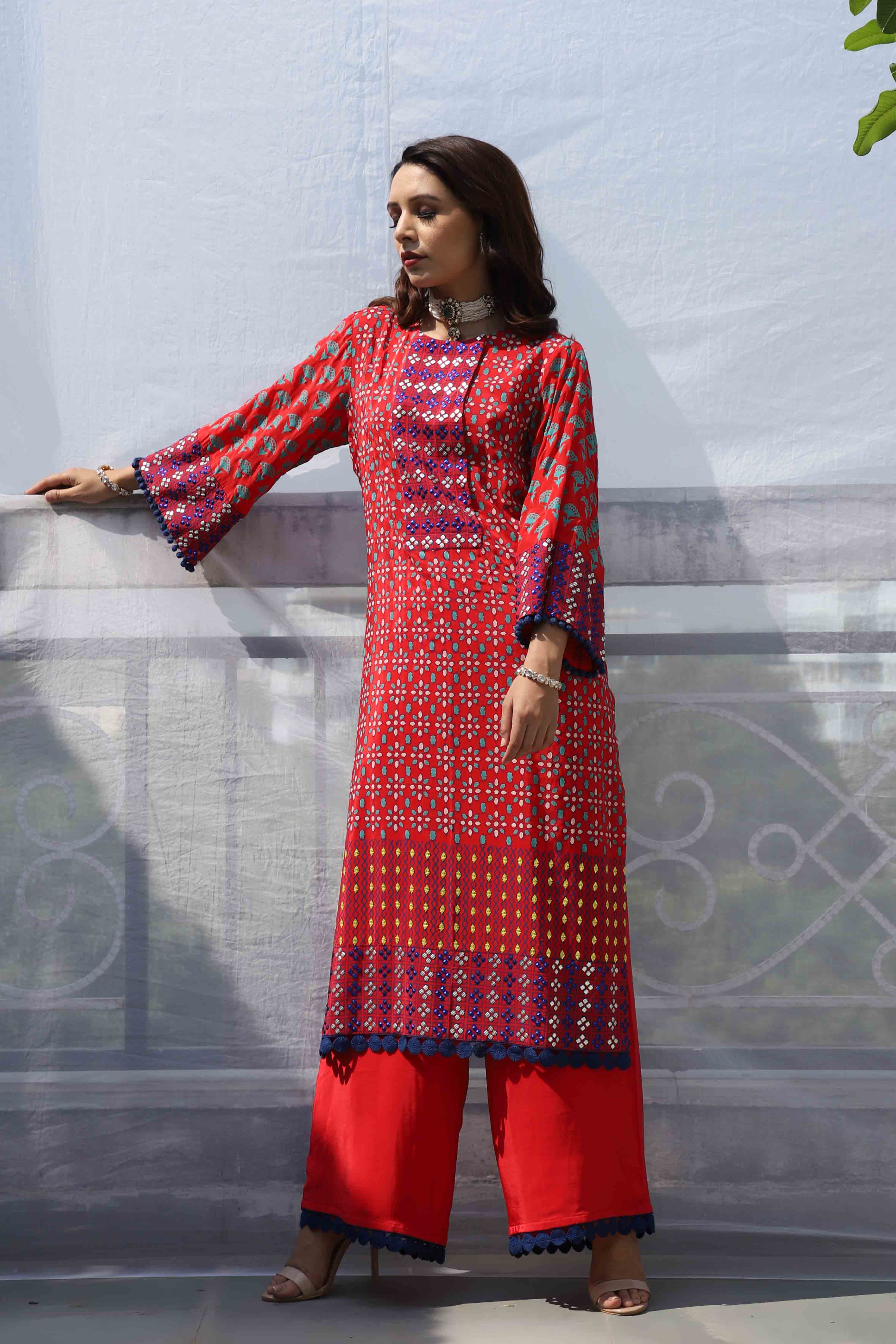A bright red Kurta Set with contrasting blue detailing. It is made in crepe with a hand-embroidered central panel, hem, and sleeves. It’s detailed with cobalt blue crochet edging and paired with matching crepe wide pants.
