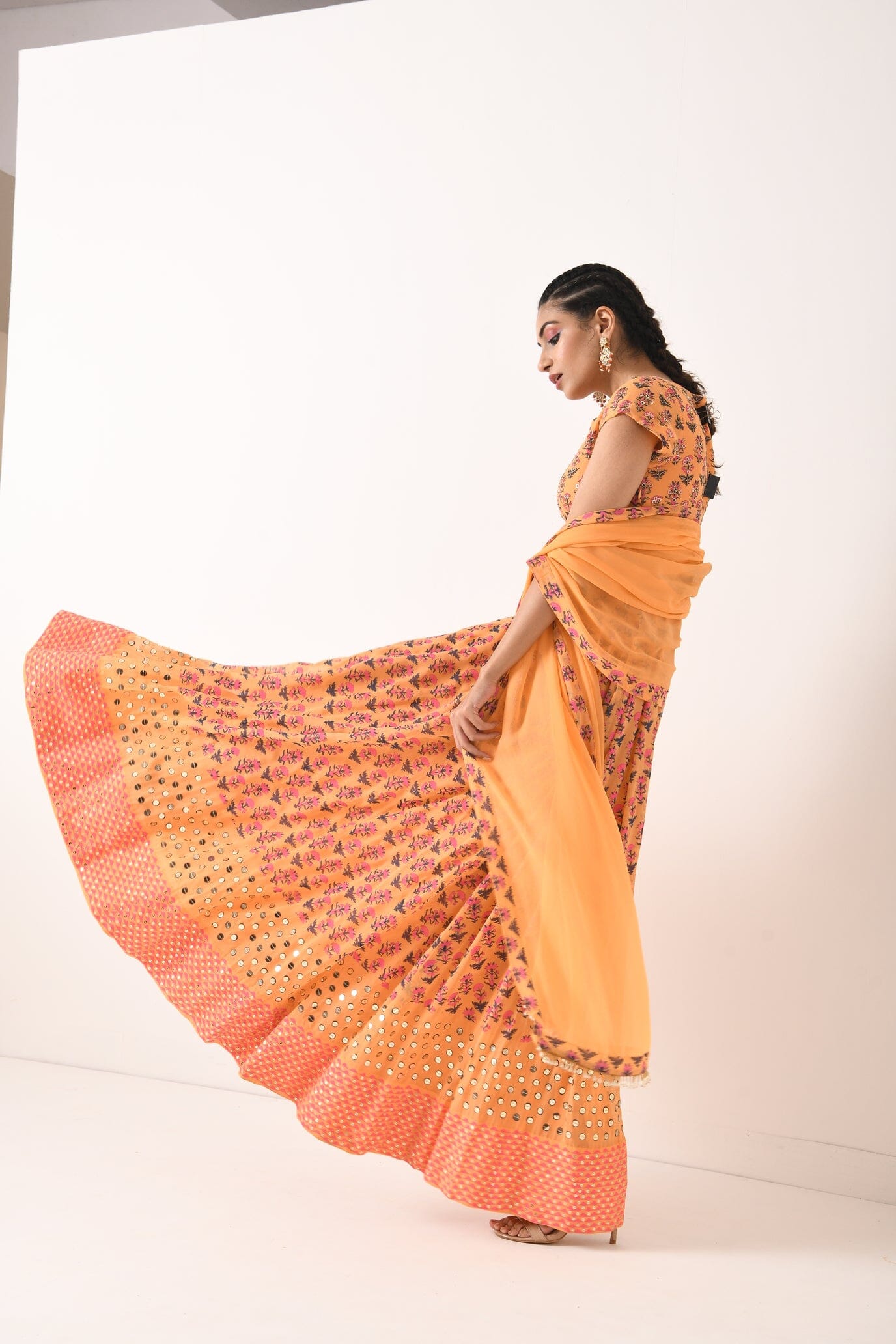 Made in 60 grams pure georgette , this anaekalin has a custom block printed base with interesting geometric sequin and cutdana hand embroidery all over the yoke and ghera. It is teamed with a georgette dupatta with print border and pearl hangings.