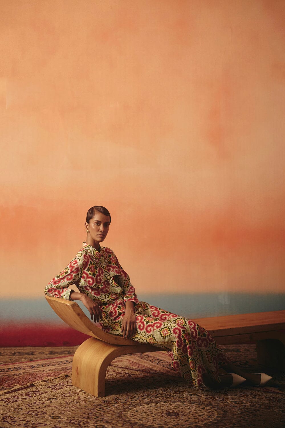 Tara Rivitted Shirt from our new festive edit’25 is a full-sleeve shirt made in pure crepe and comes in digitally printed traditional Ikat-inspired pattern. It has hand done crystal tasseling on the collar .