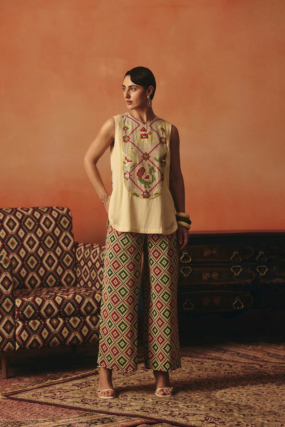 The Tota Maina Co-ord set is crafted from pure crepe and georgette, features a classic Ikat-inspired pattern and sequins detailing on the top. And the trousers are digitally printed .