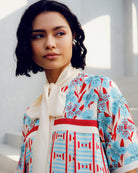 The White Illusion Dress is made of double georgette. It features geometric and floral print play with a contrasting white tie-up detailing around the neck.