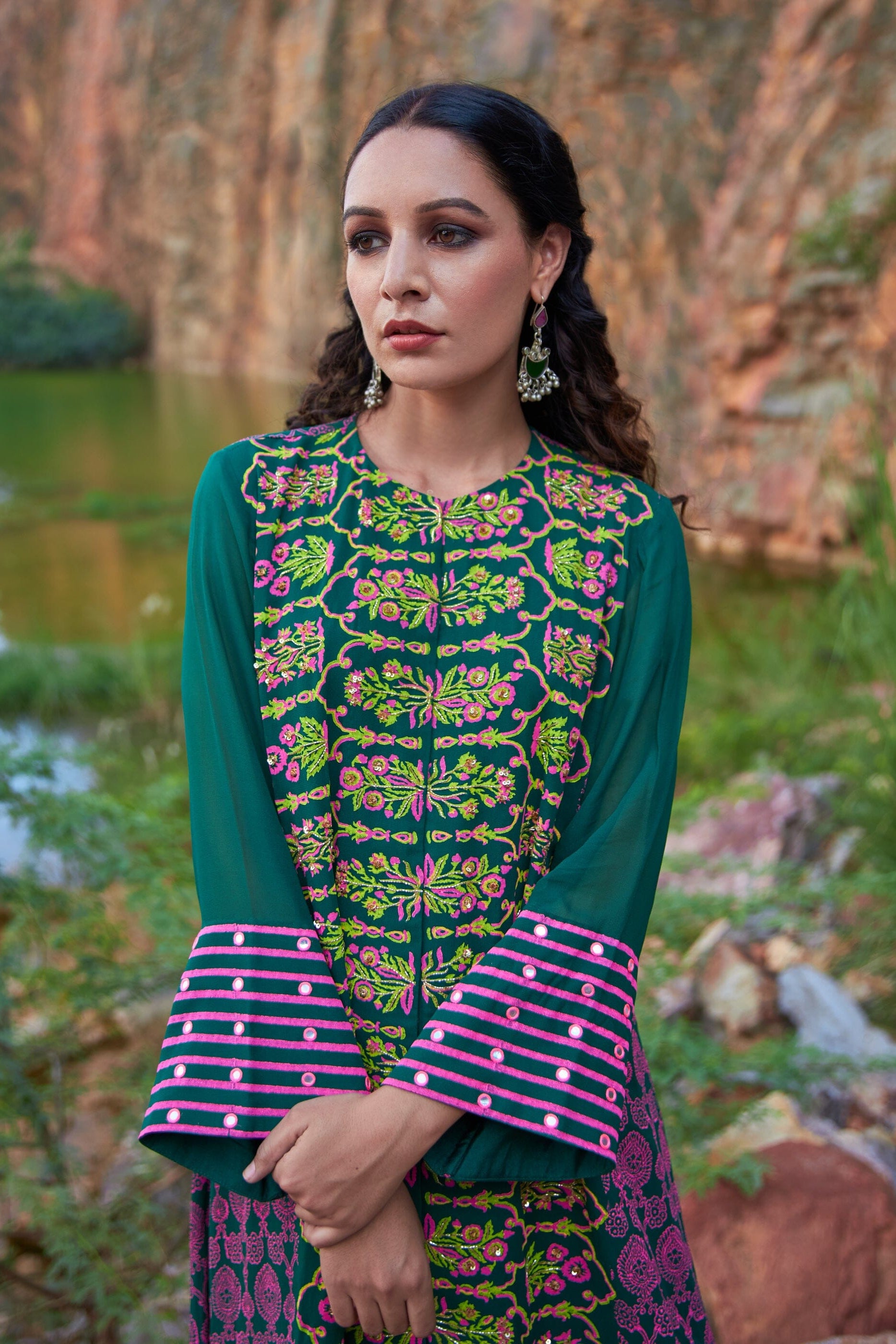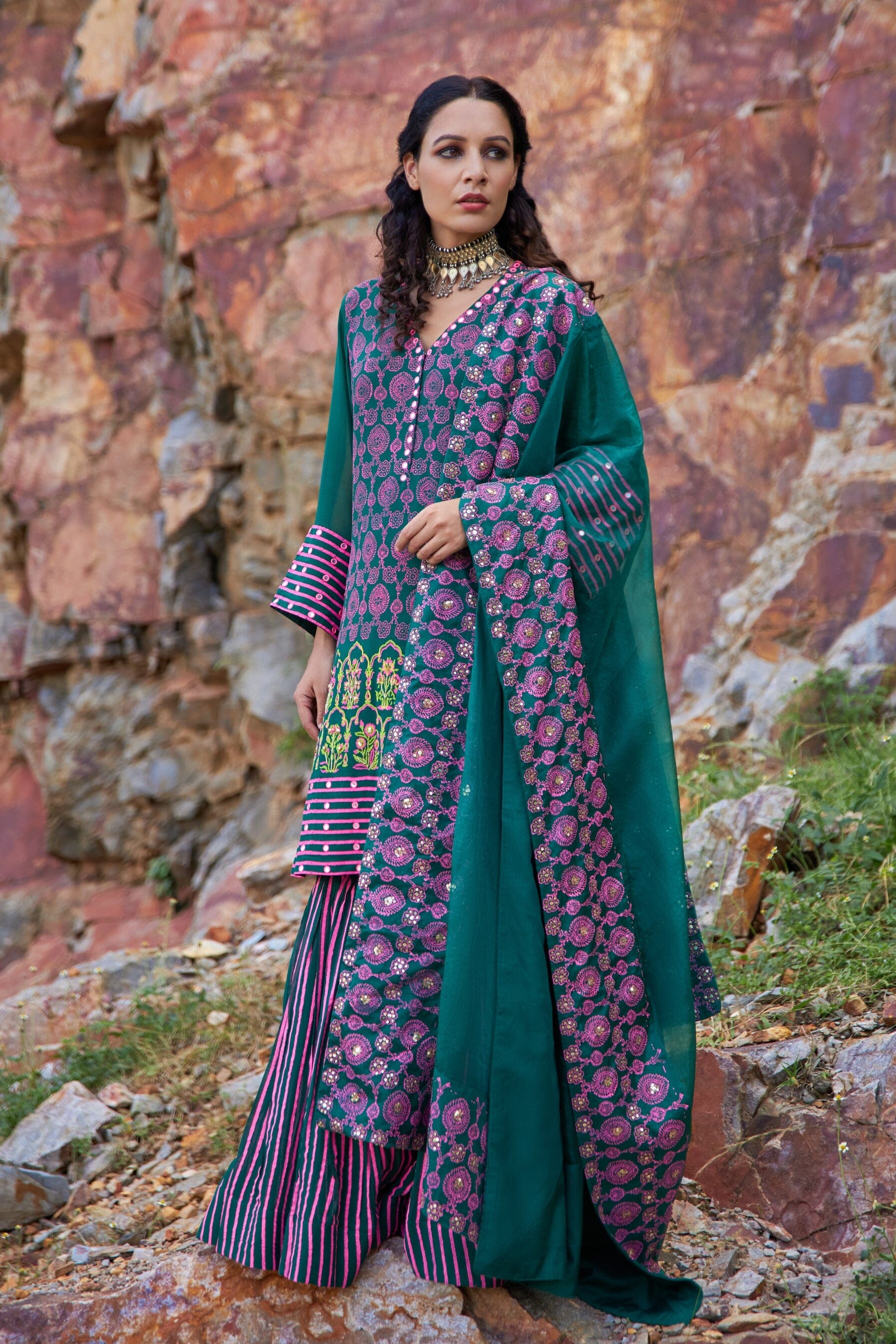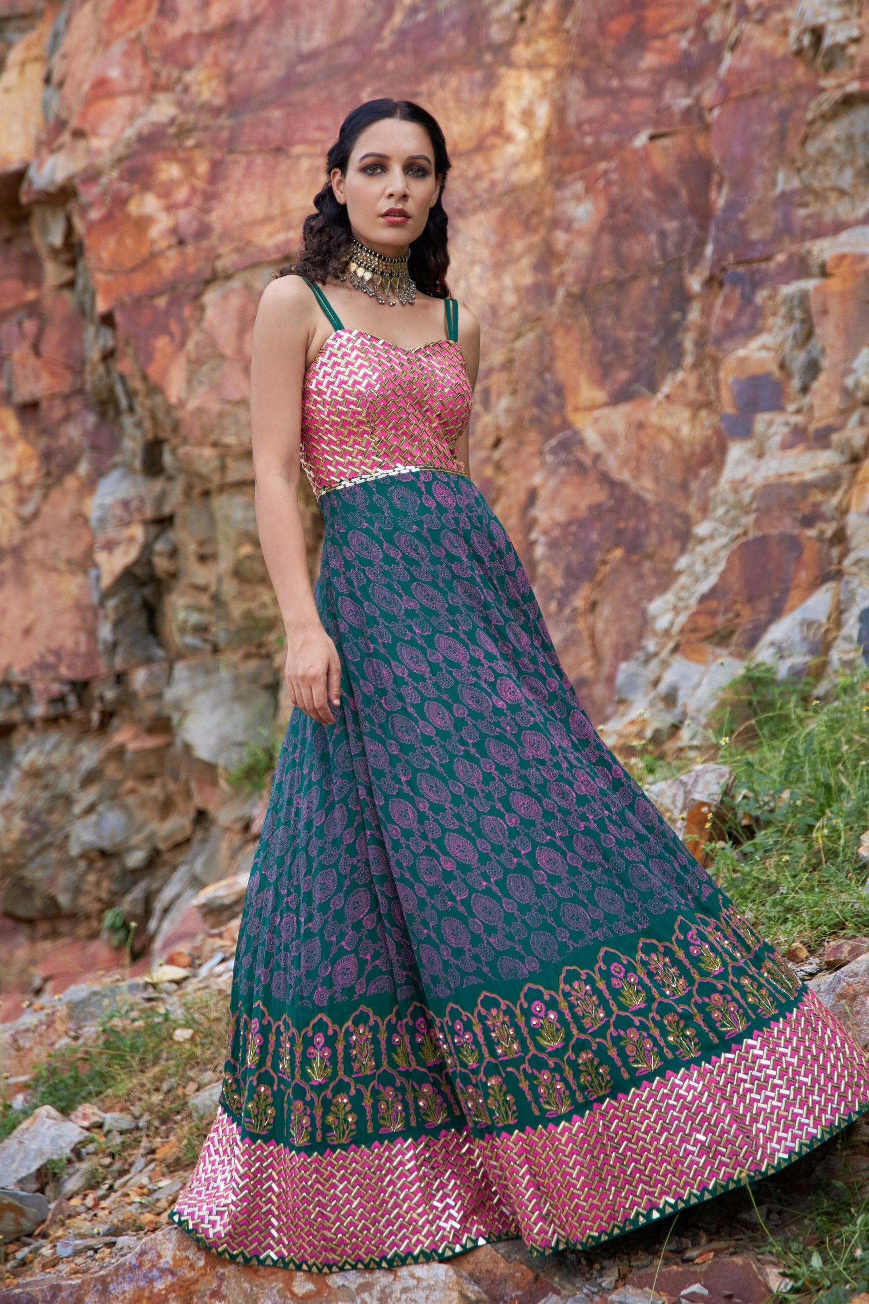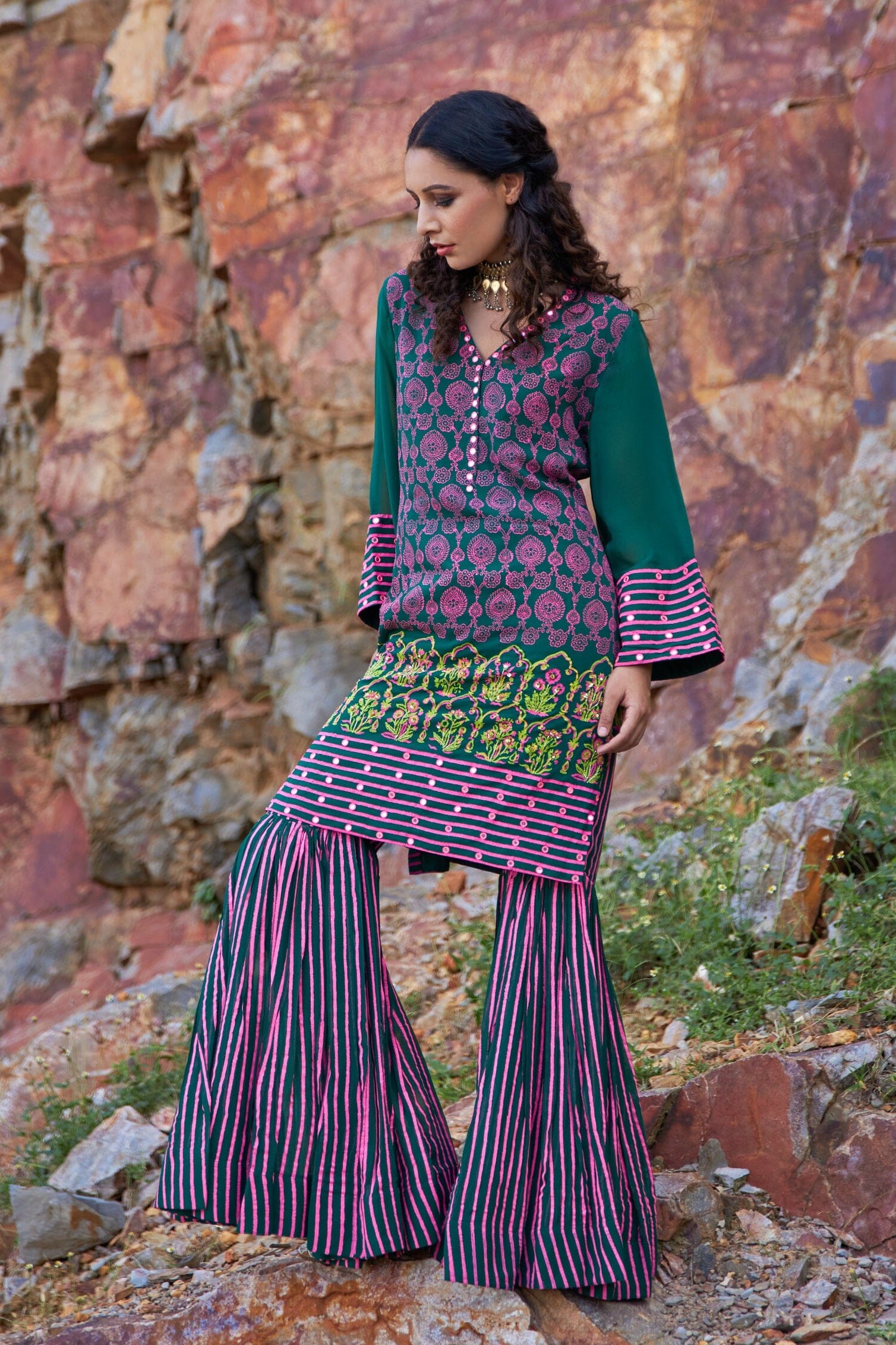 Pooja Rajgarhia Gupta’s style shouts vivid and bright with amalgamation of traditional aesthetics and modern design. The label’s signature geometric surface textures bring a new feel to Indian fluid silhouettes. Their collections are a refreshing shift from very heavy Indian clothing to easy playful silhouettes, statement colors, foiling, printing, intricate handwork and impactful geometric sequence work. Delivery period for this label is usually 20-25 days.