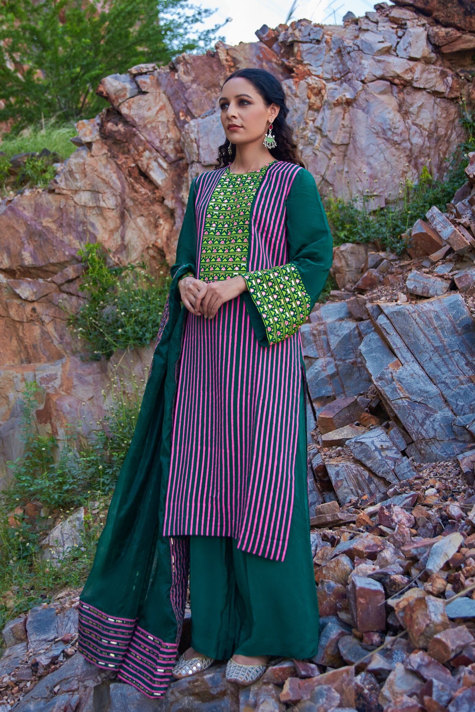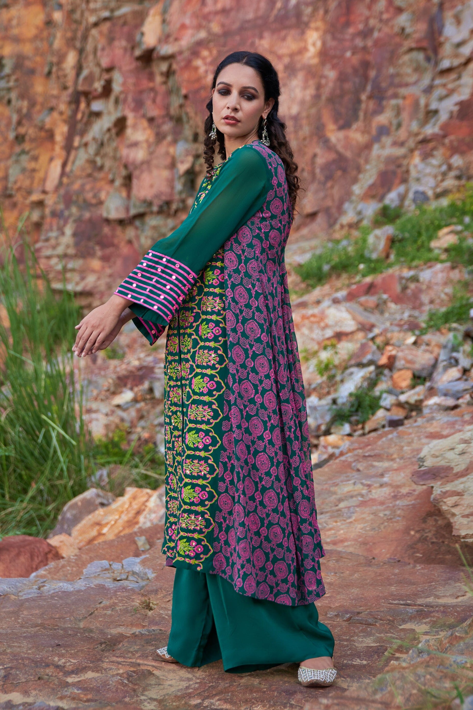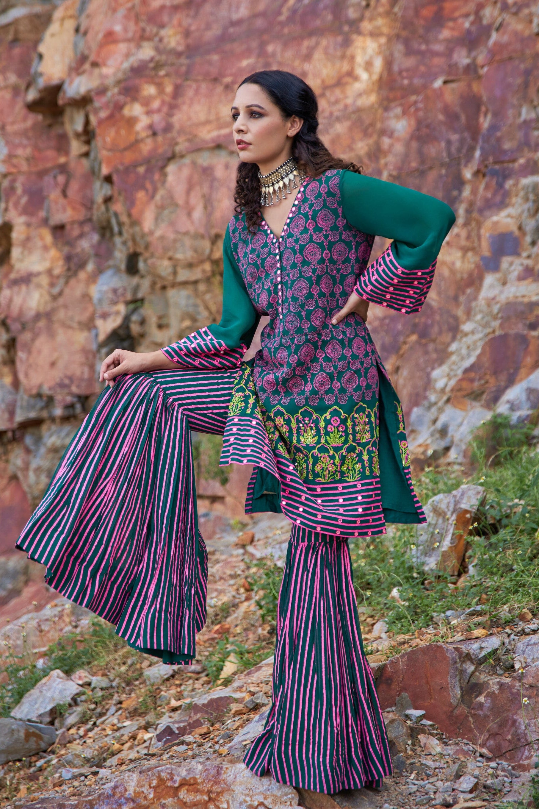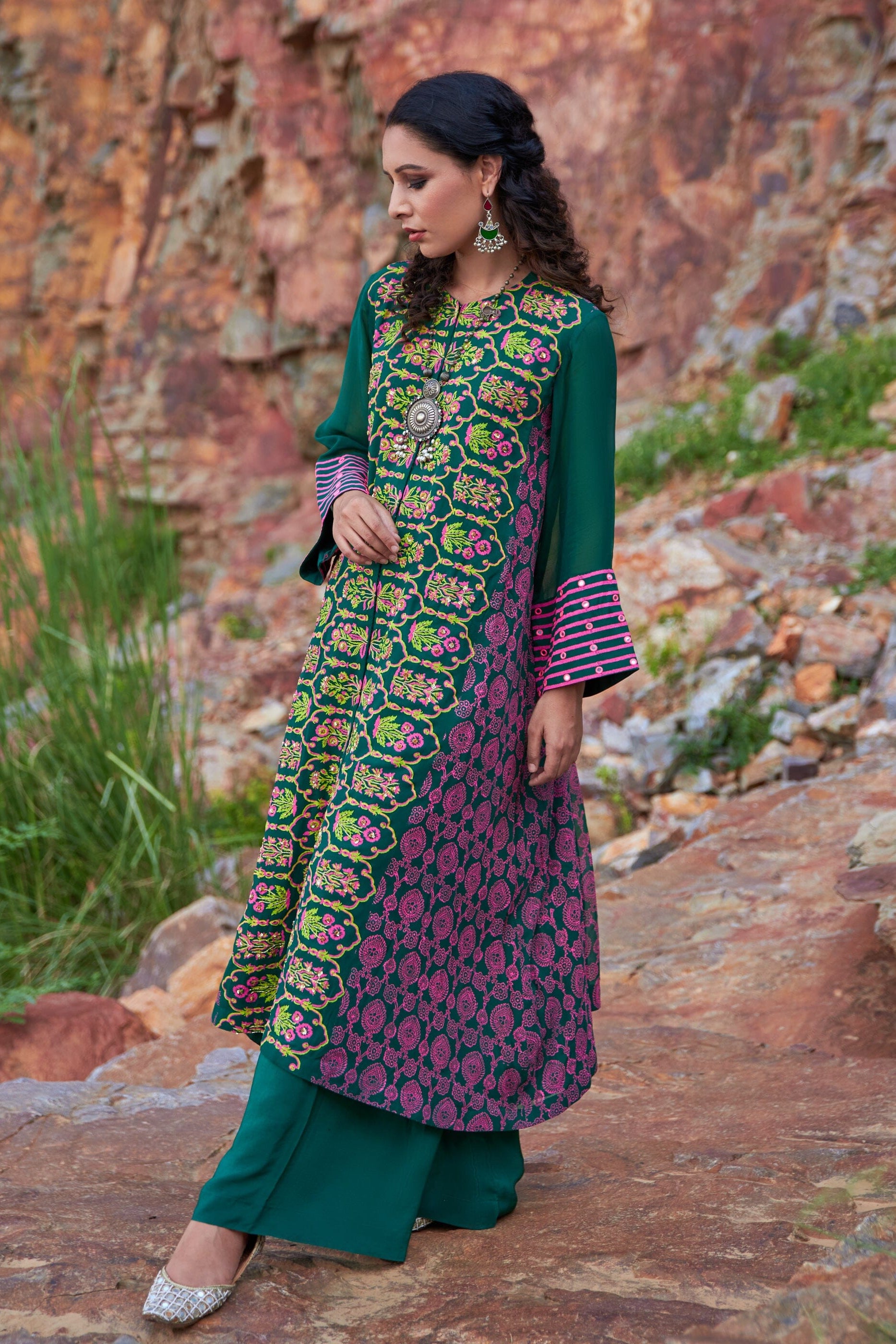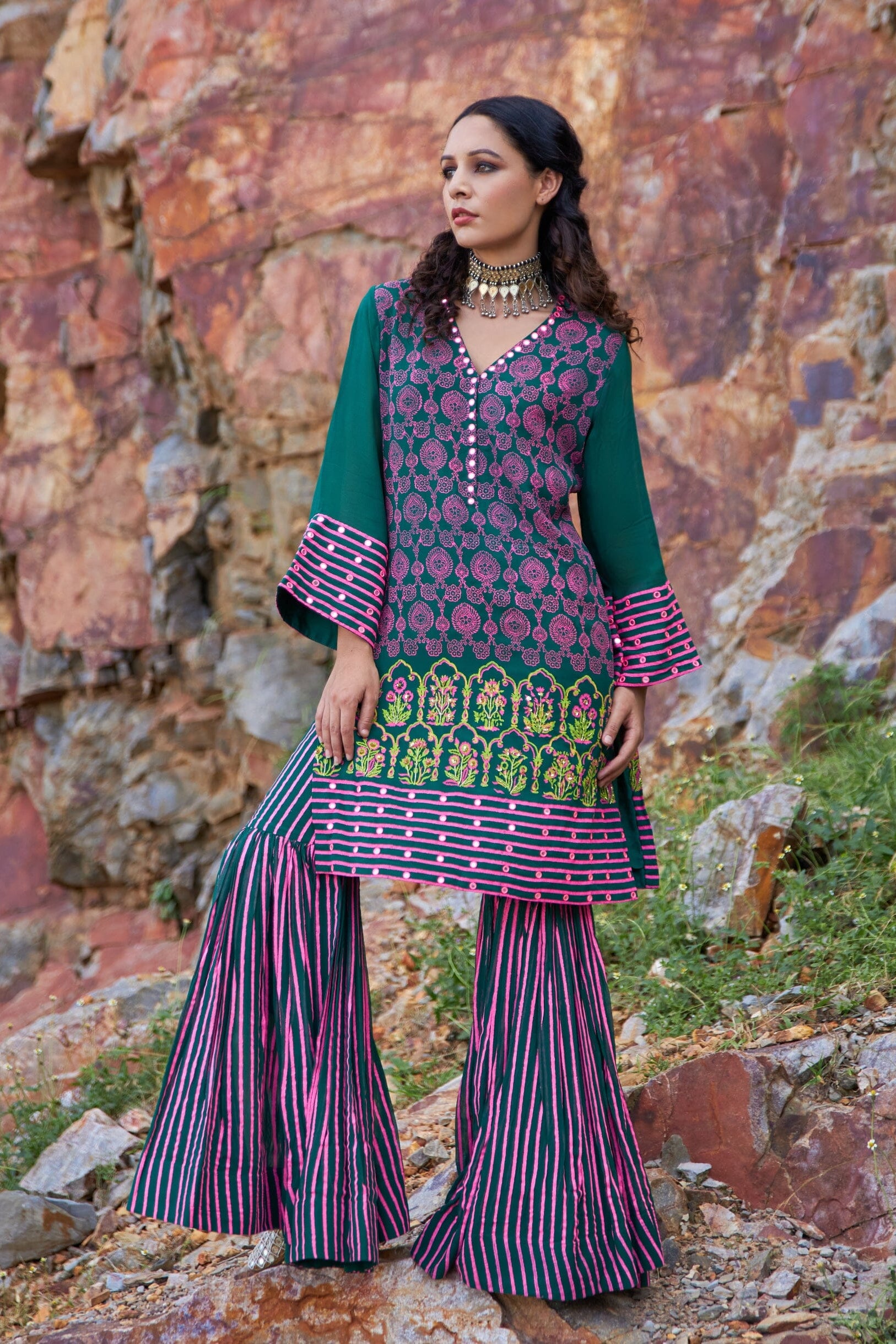 Pooja Rajgarhia Gupta’s style shouts vivid and bright with amalgamation of traditional aesthetics and modern design. The label’s signature geometric surface textures bring a new feel to Indian fluid silhouettes. Their collections are a refreshing shift from very heavy Indian clothing to easy playful silhouettes, statement colors, foiling, printing, intricate handwork and impactful geometric sequence work. Delivery period for this label is usually 20-25 days.