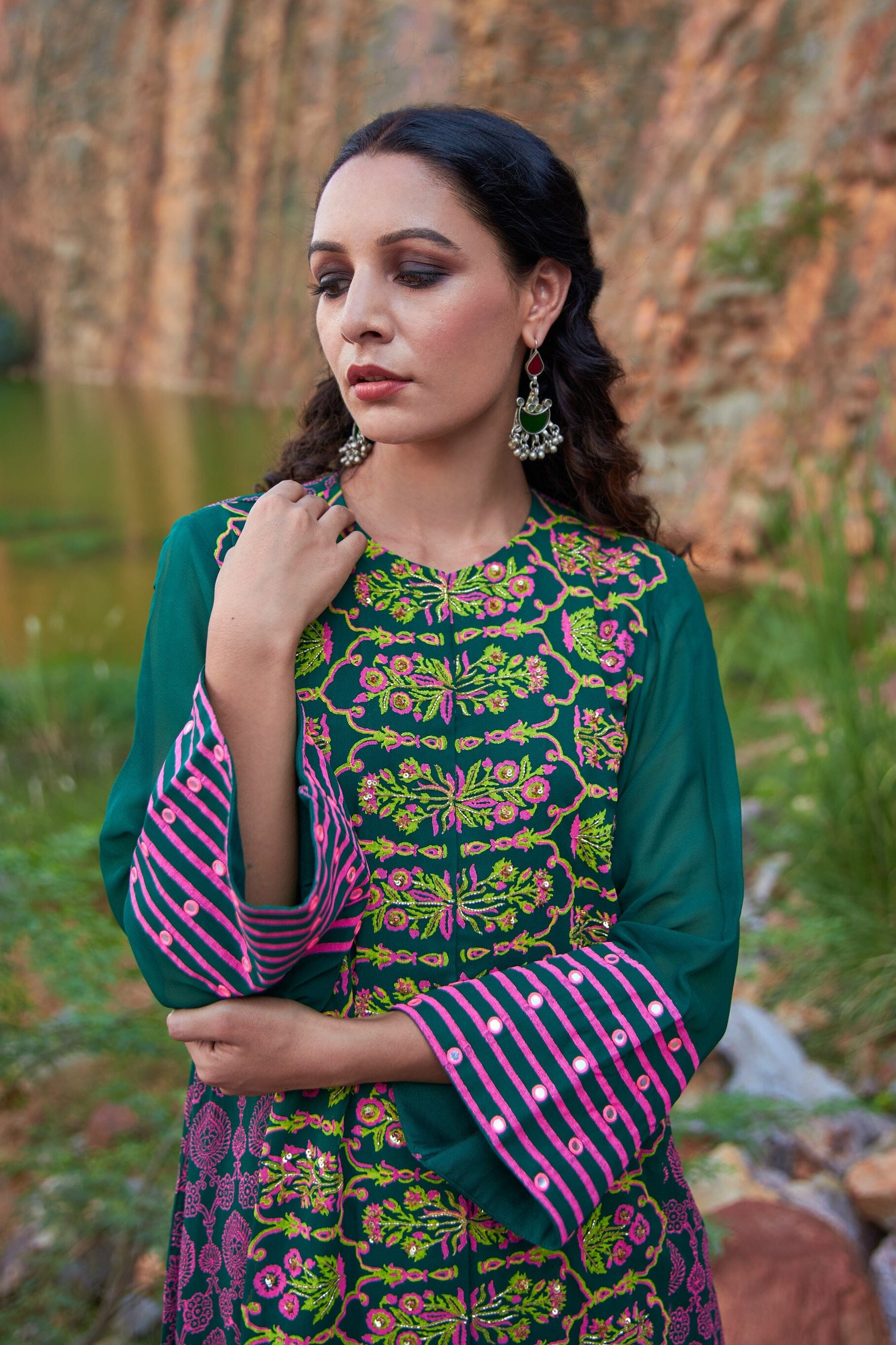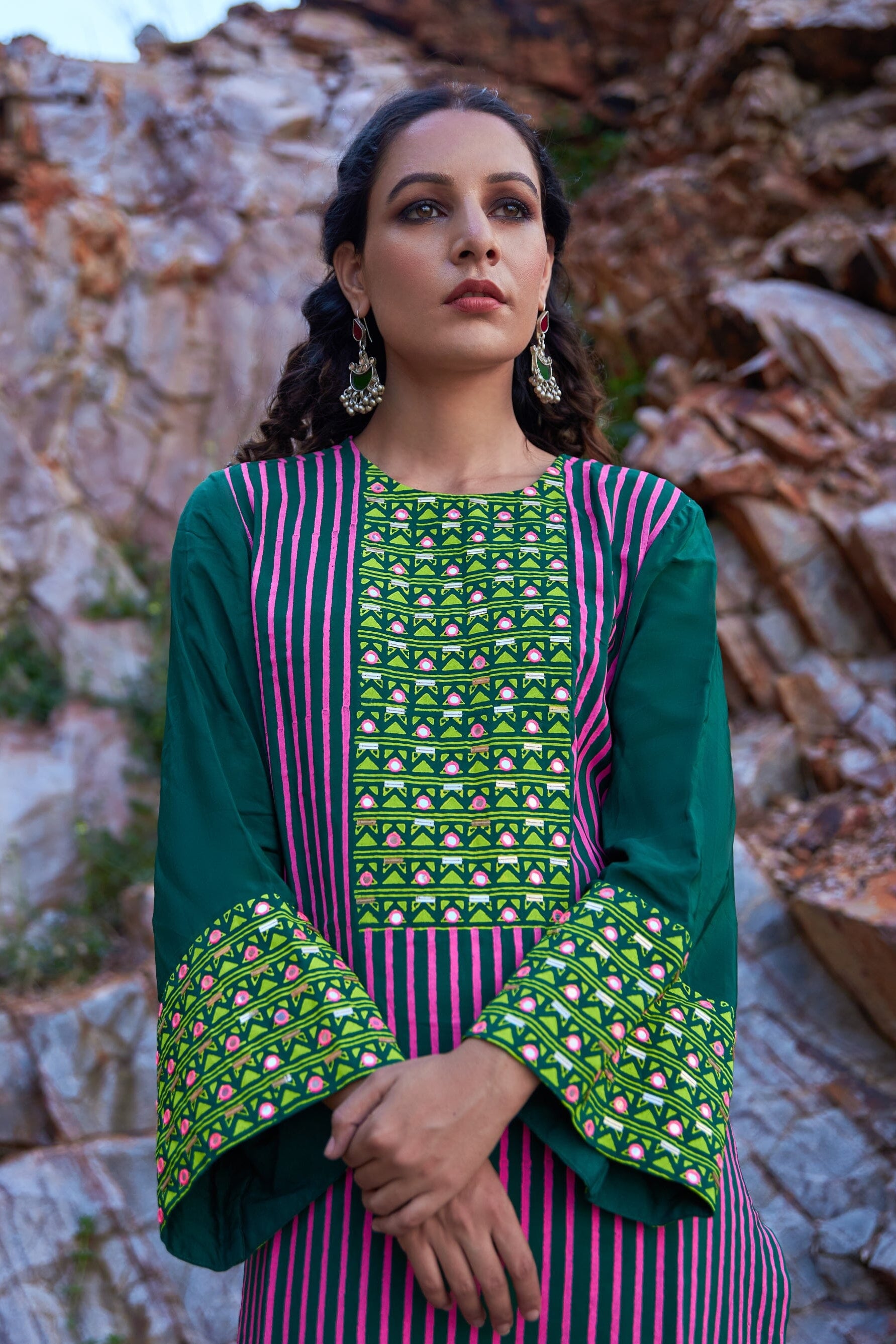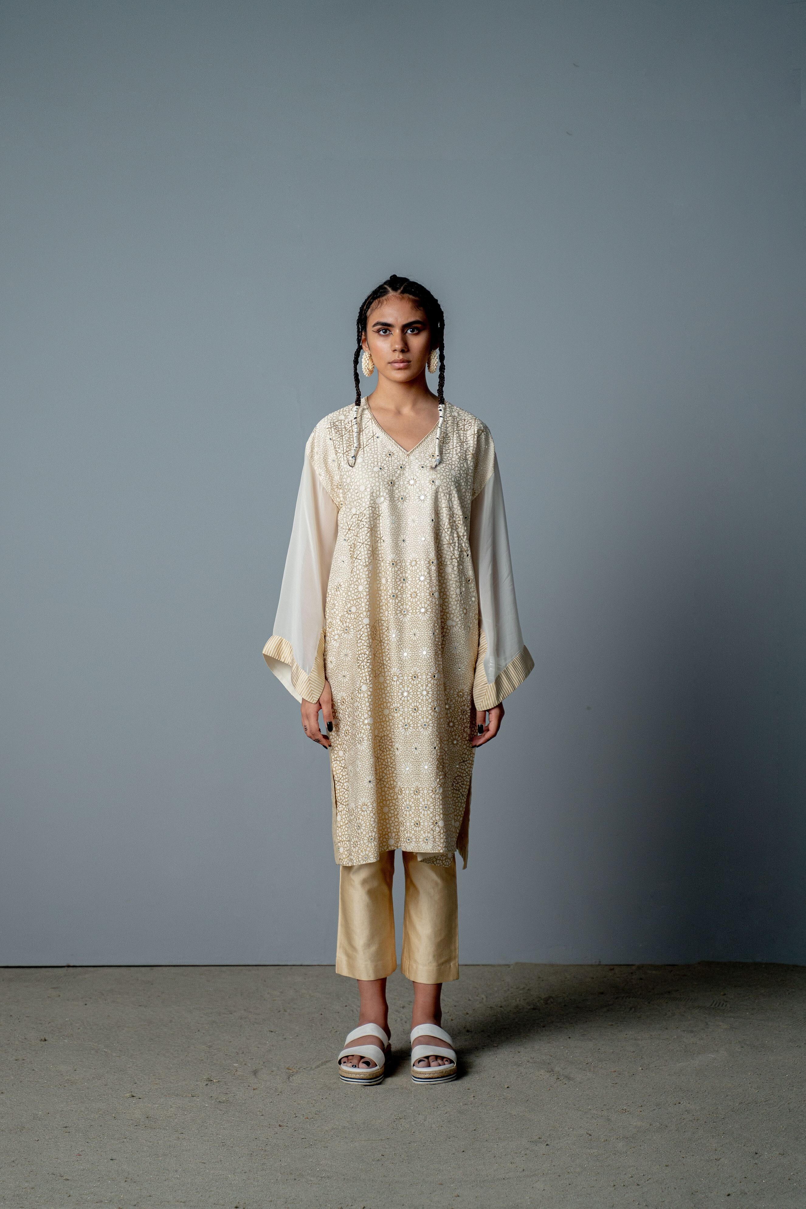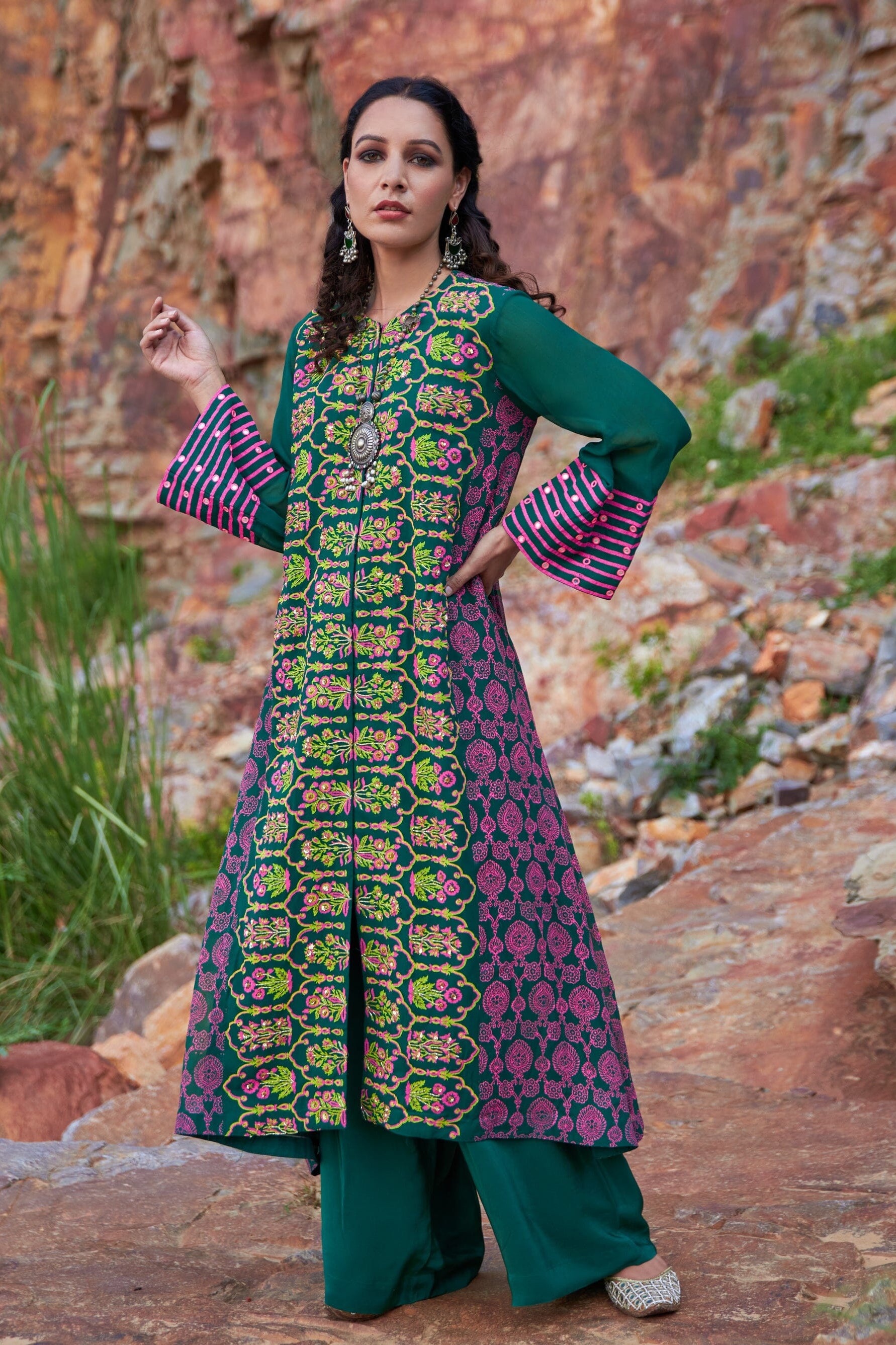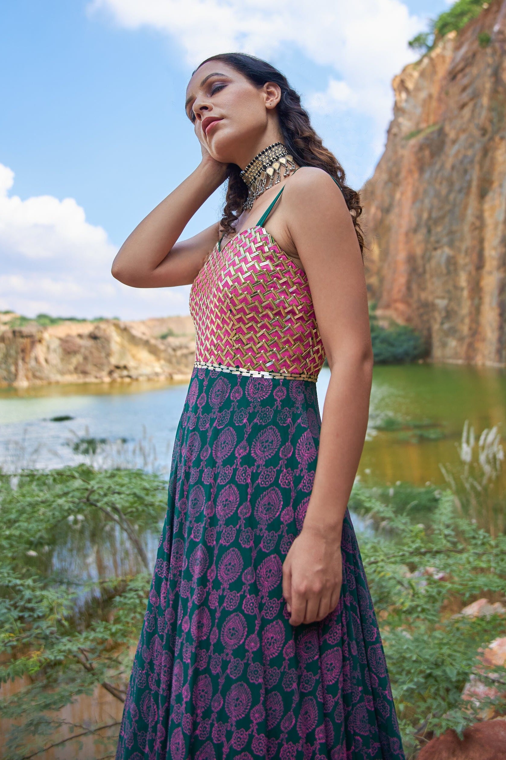 Pooja Rajgarhia Gupta’s style shouts vivid and bright with amalgamation of traditional aesthetics and modern design. The label’s signature geometric surface textures bring a new feel to Indian fluid silhouettes. Their collections are a refreshing shift from very heavy Indian clothing to easy playful silhouettes, statement colors, foiling, printing, intricate handwork and impactful geometric sequence work. Delivery period for this label is usually 20-25 days.