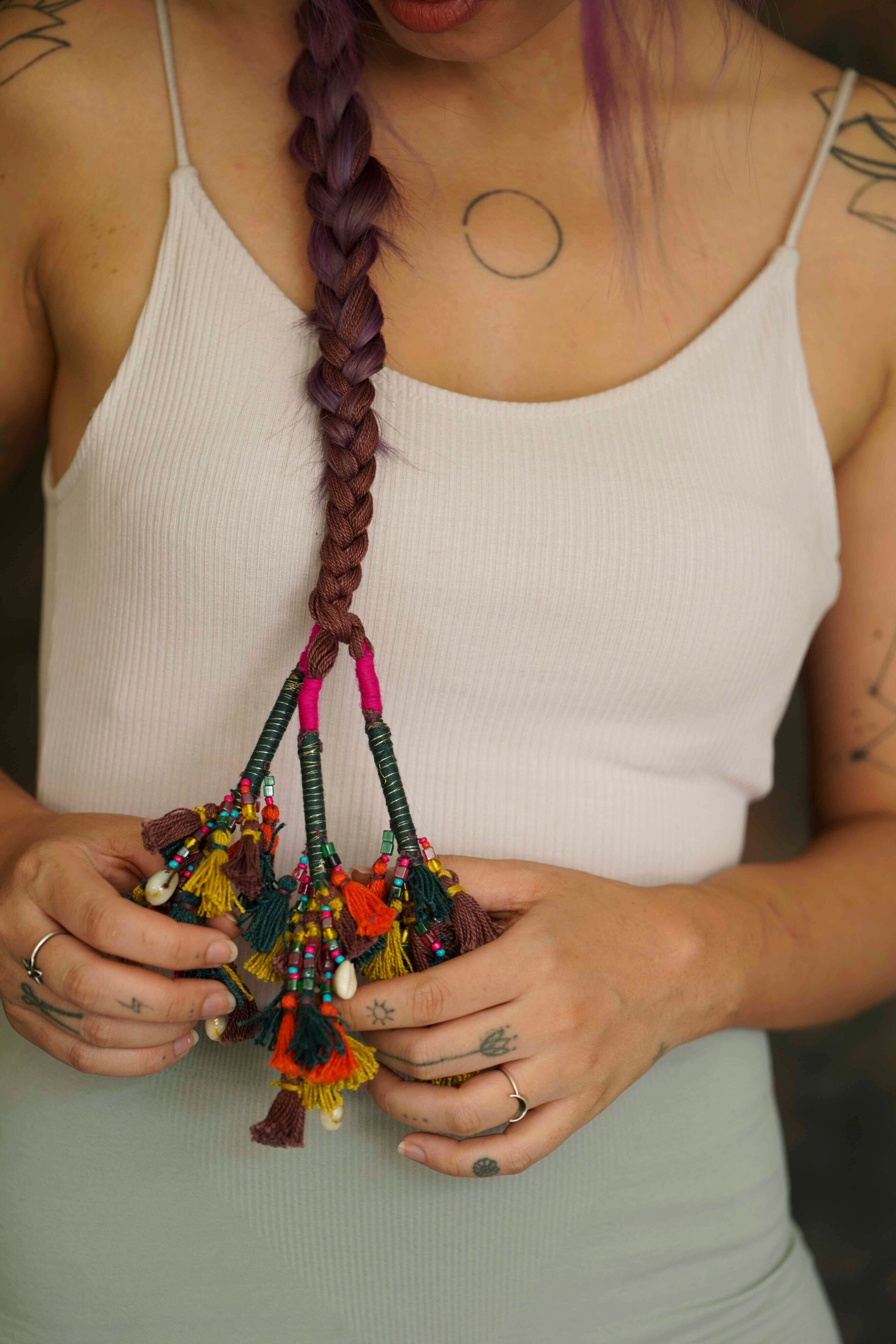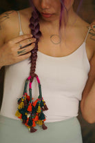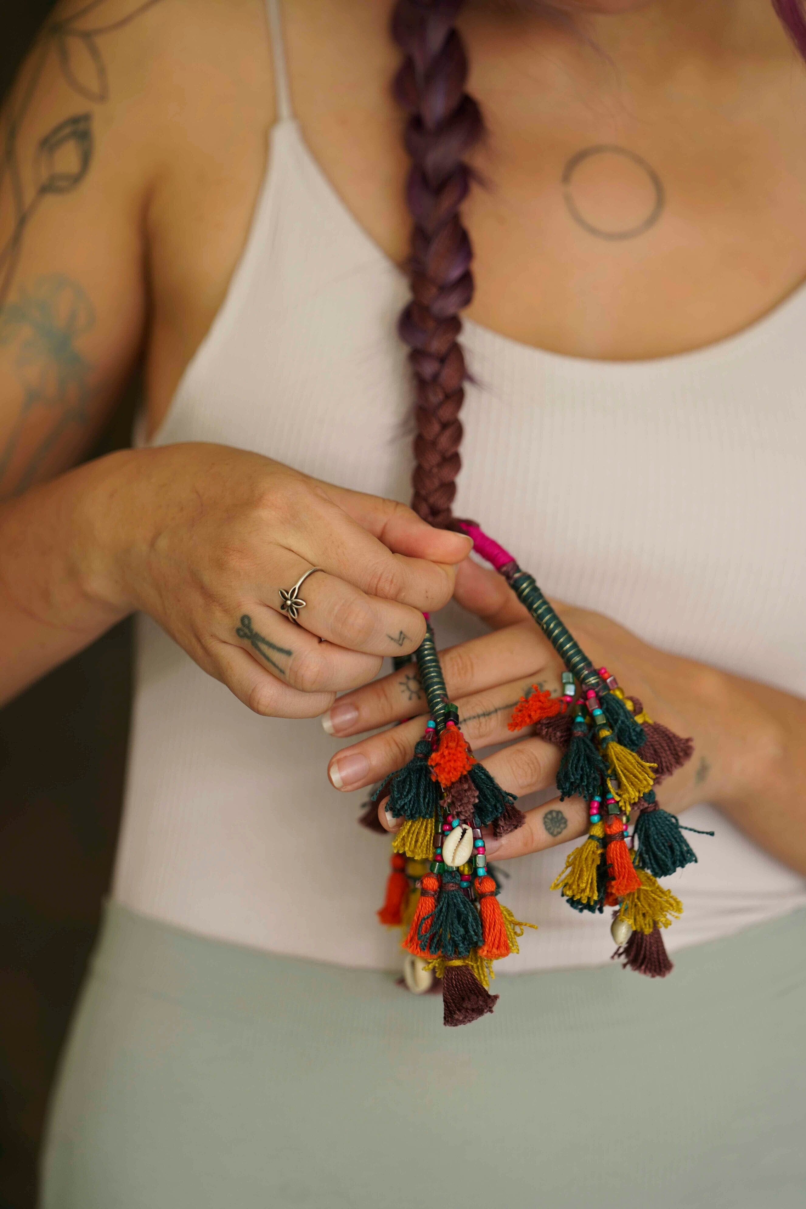 A bunch of cute little multicoloured tassels stringed together into a parandi with glass beads are a perfect accessory for that chic look.