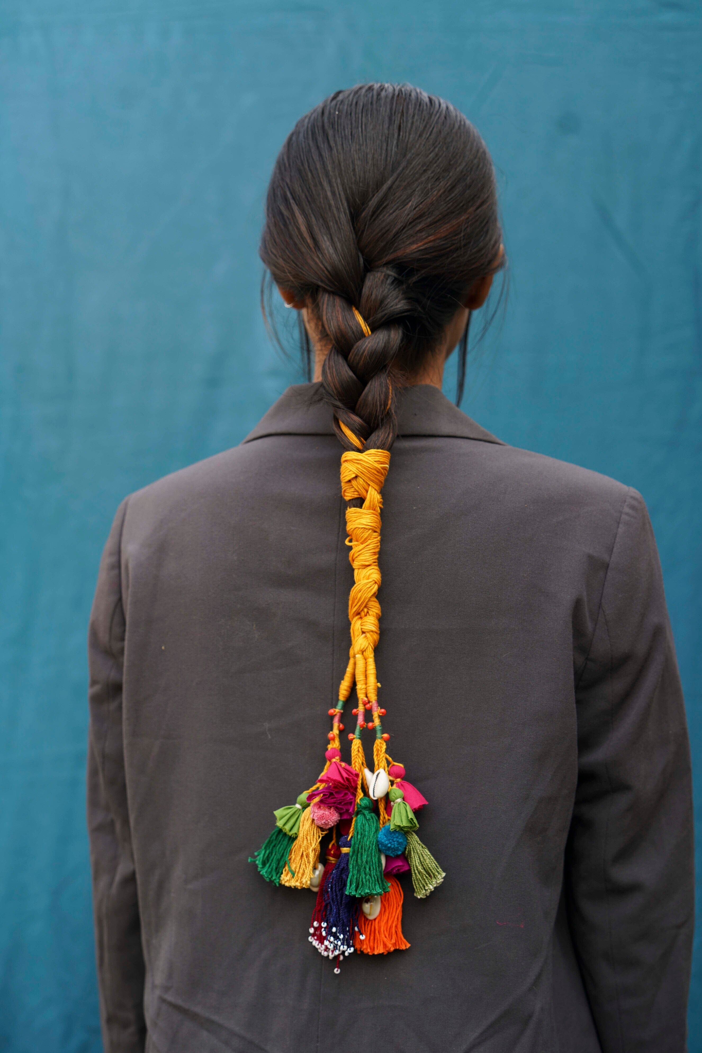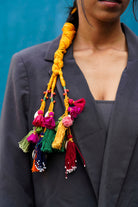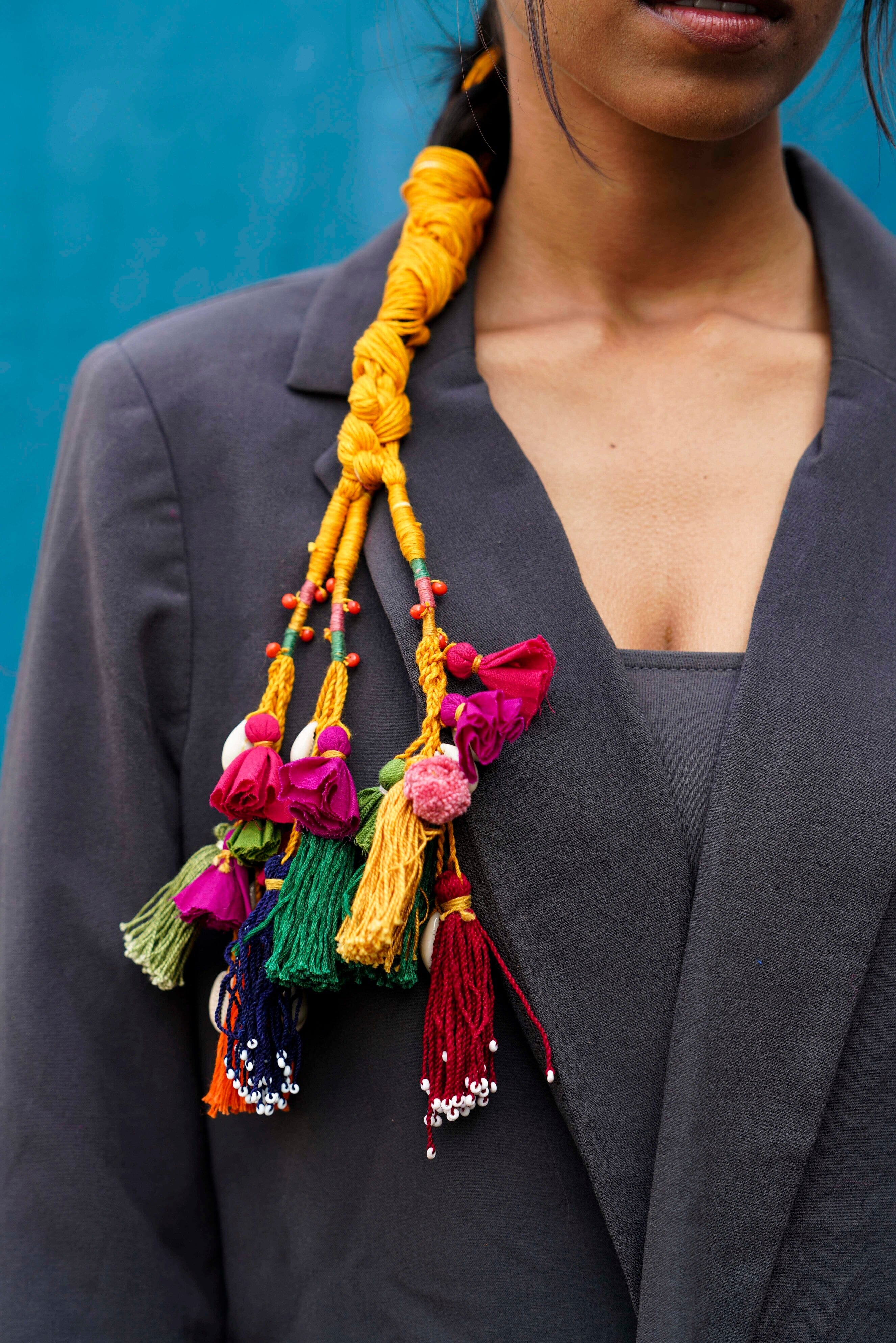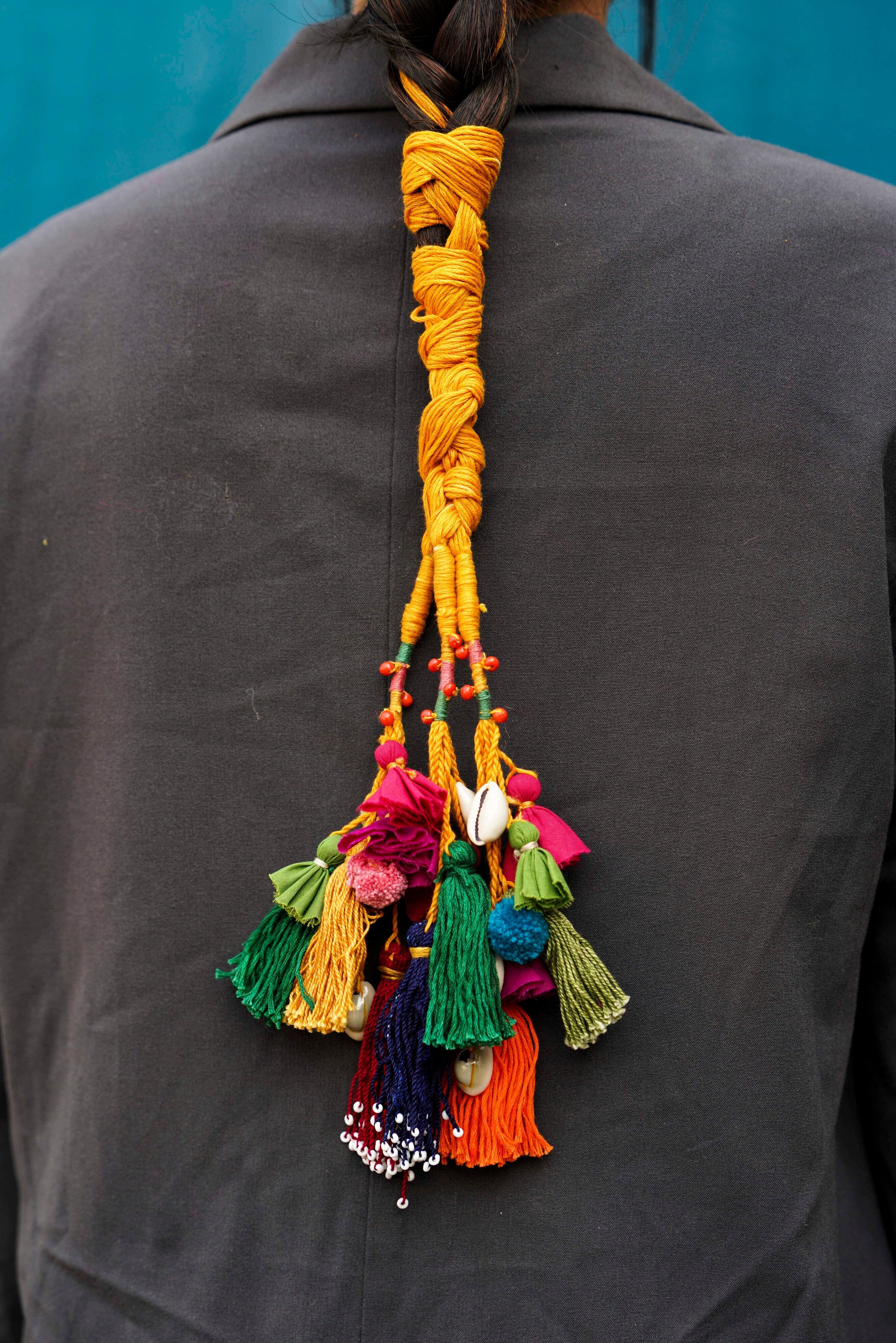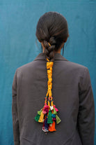 A bunch of bright coloured handcrafted tassels and poms attached together to create a perfect parandi for the boho in you.