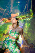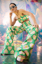 Signature ring neckline crop top with a tie up back in our green Blinding hearts print.