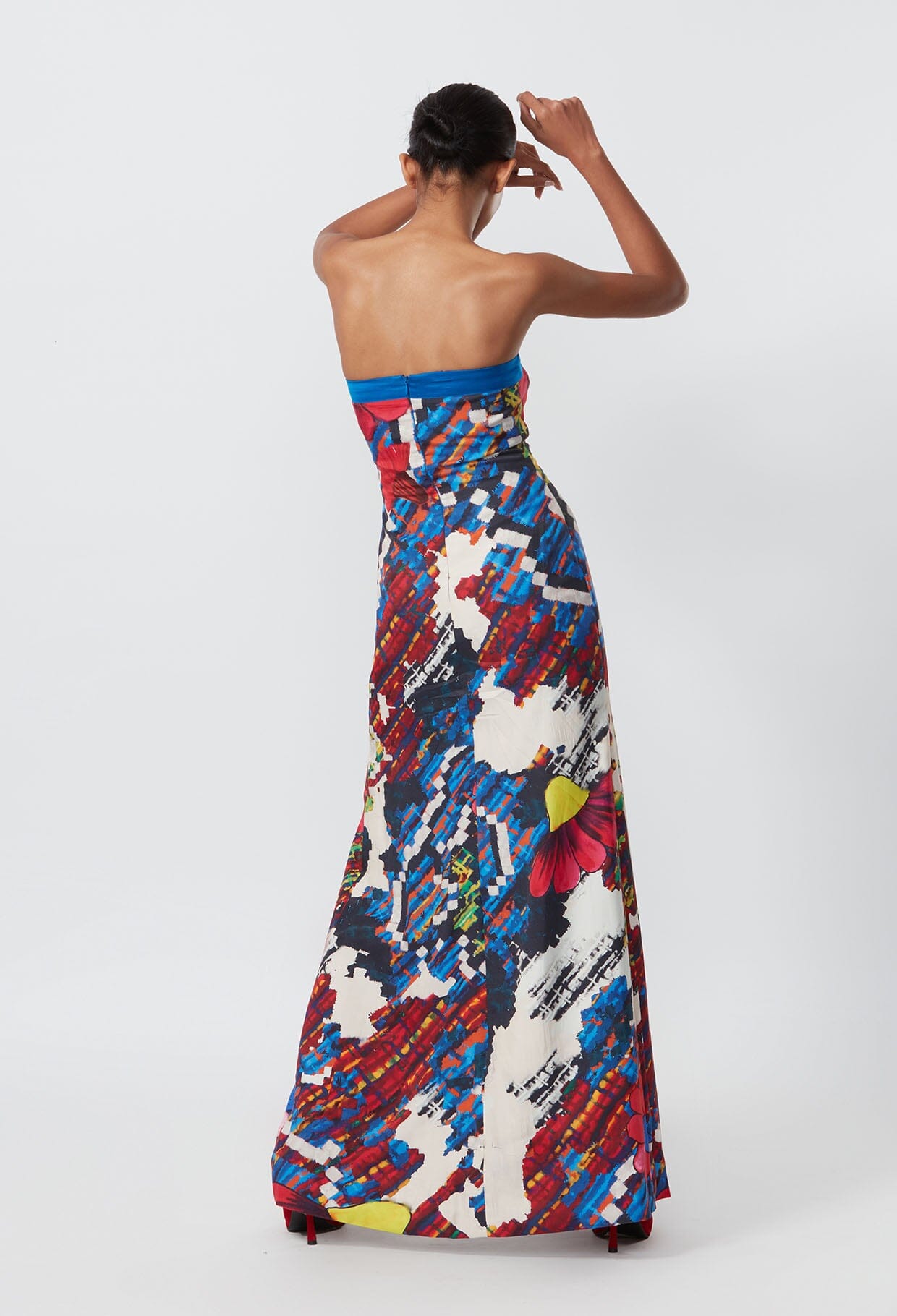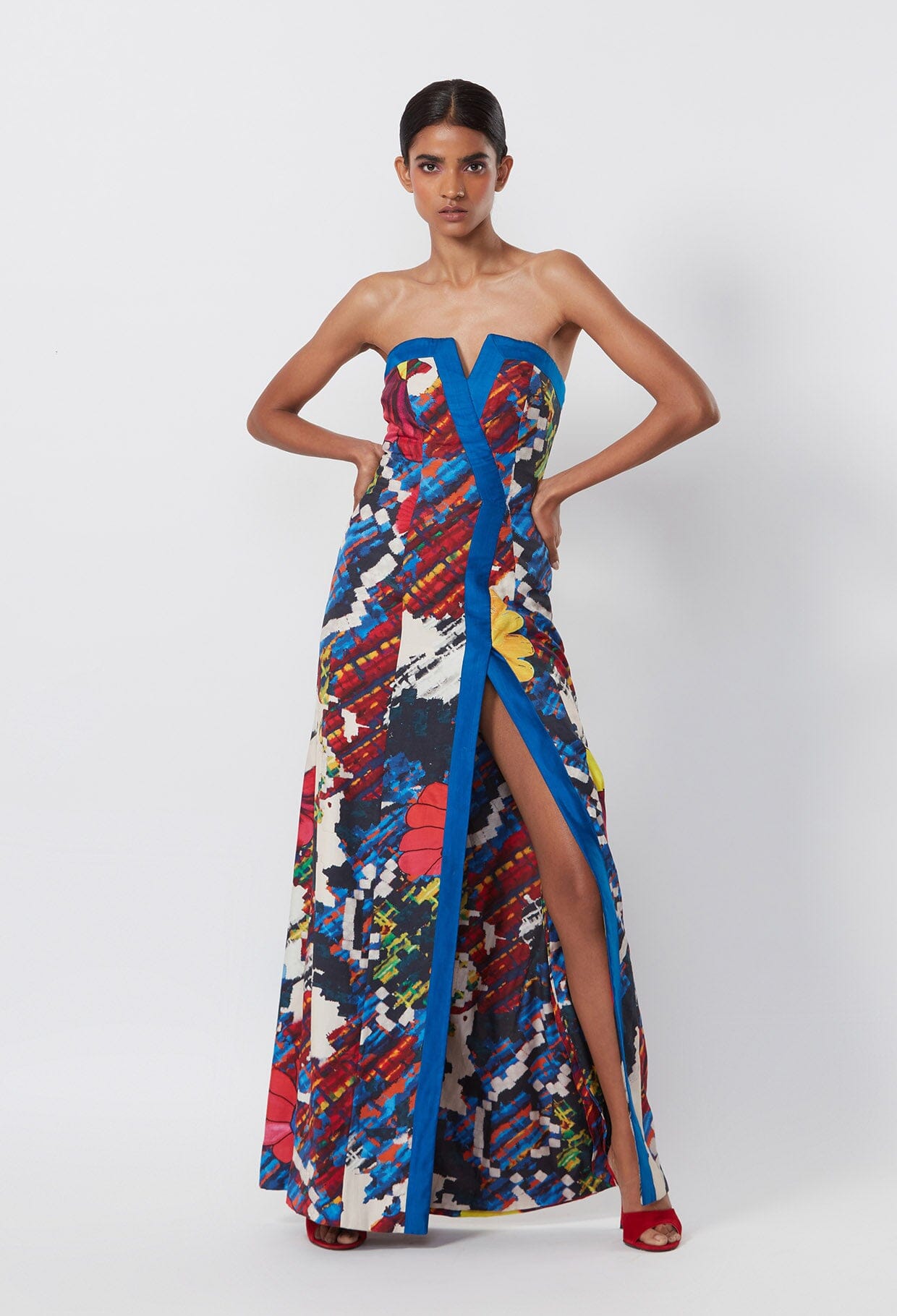 DRESS : ABSTRACT FLORAL PRINT STRAPLESS DRESS WITH OFF CENTRE SLIT