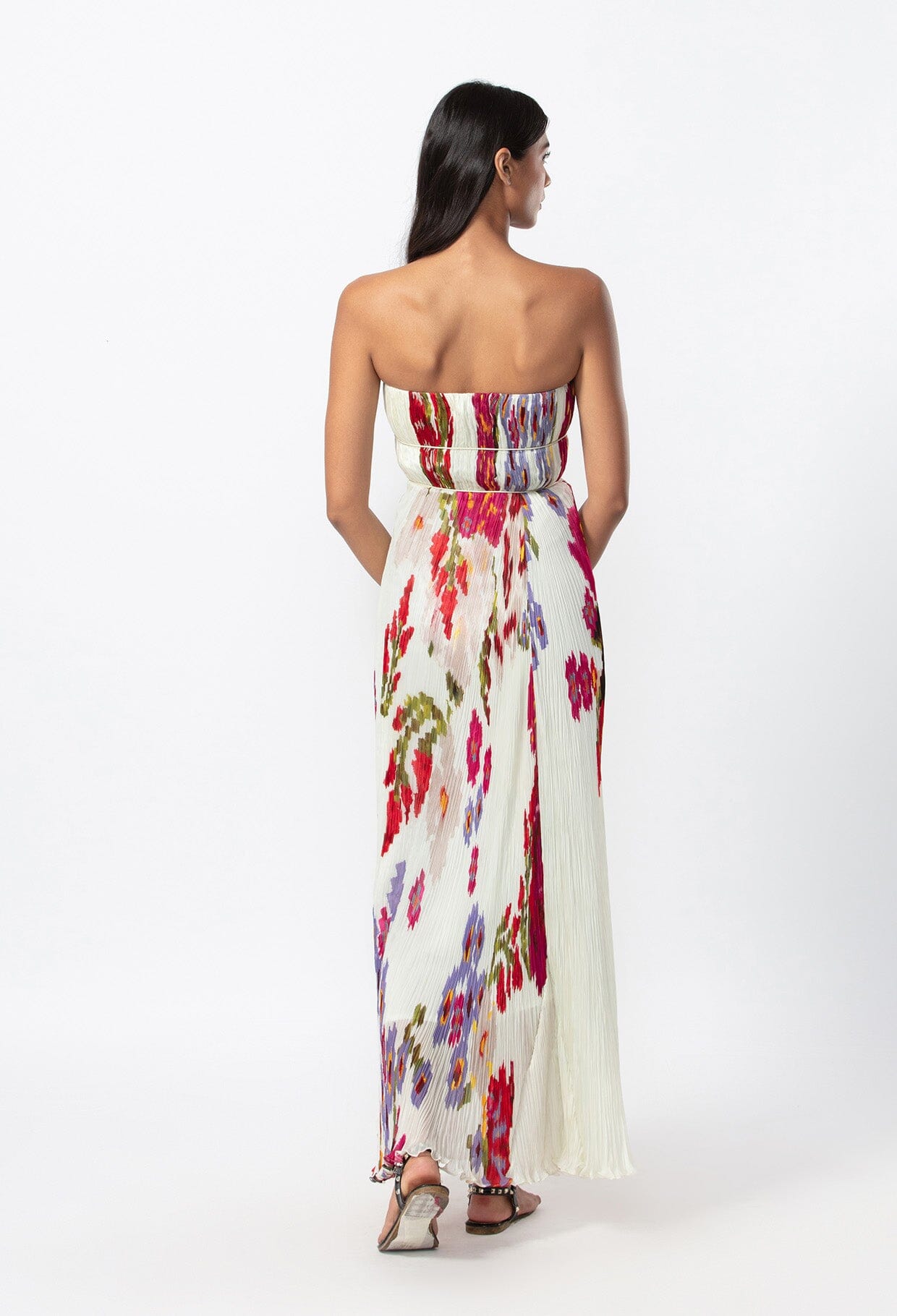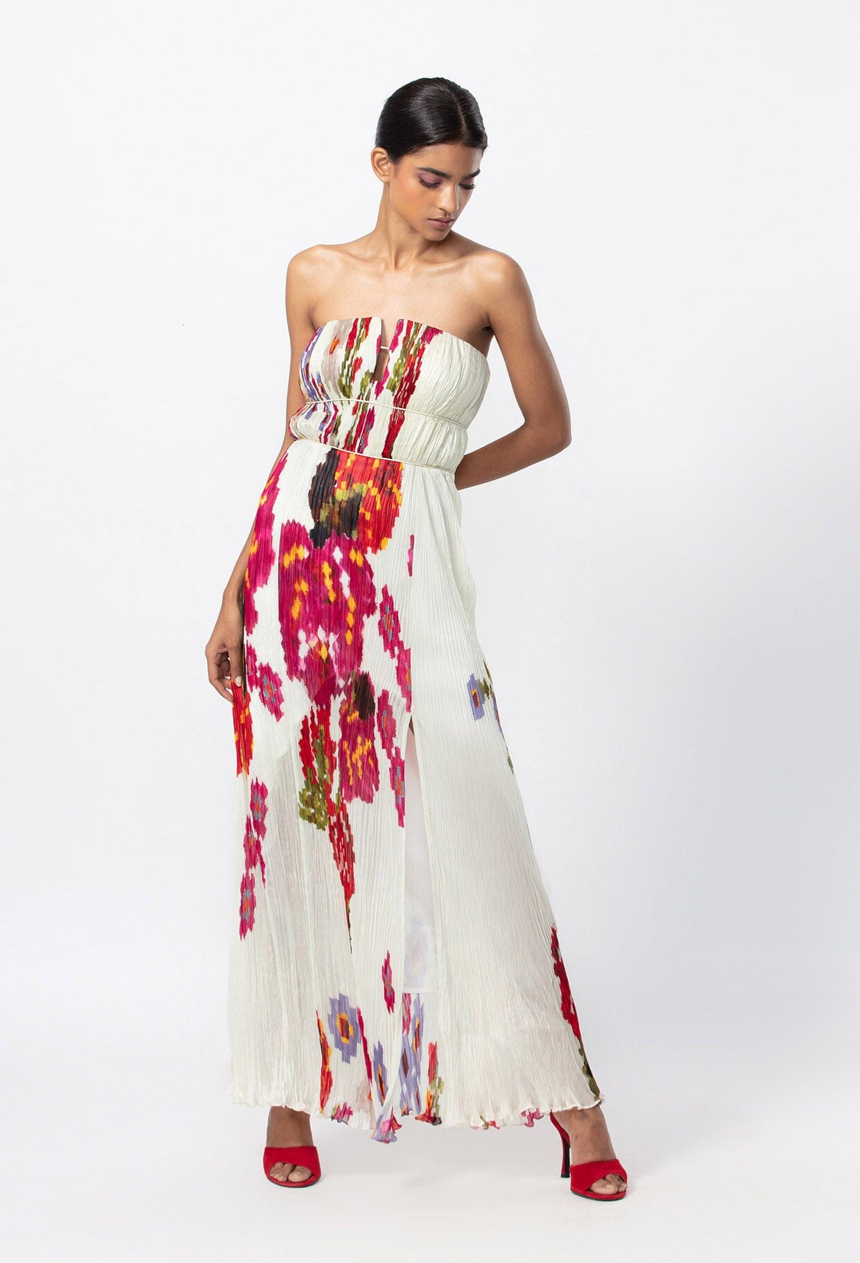 GOWN : ABSTRACT FLORAL RPINT HAND MICRO PLEATED GOWN WITH CUSTOMISABLE SIDE SLIT, KEYHOLE DETAILING