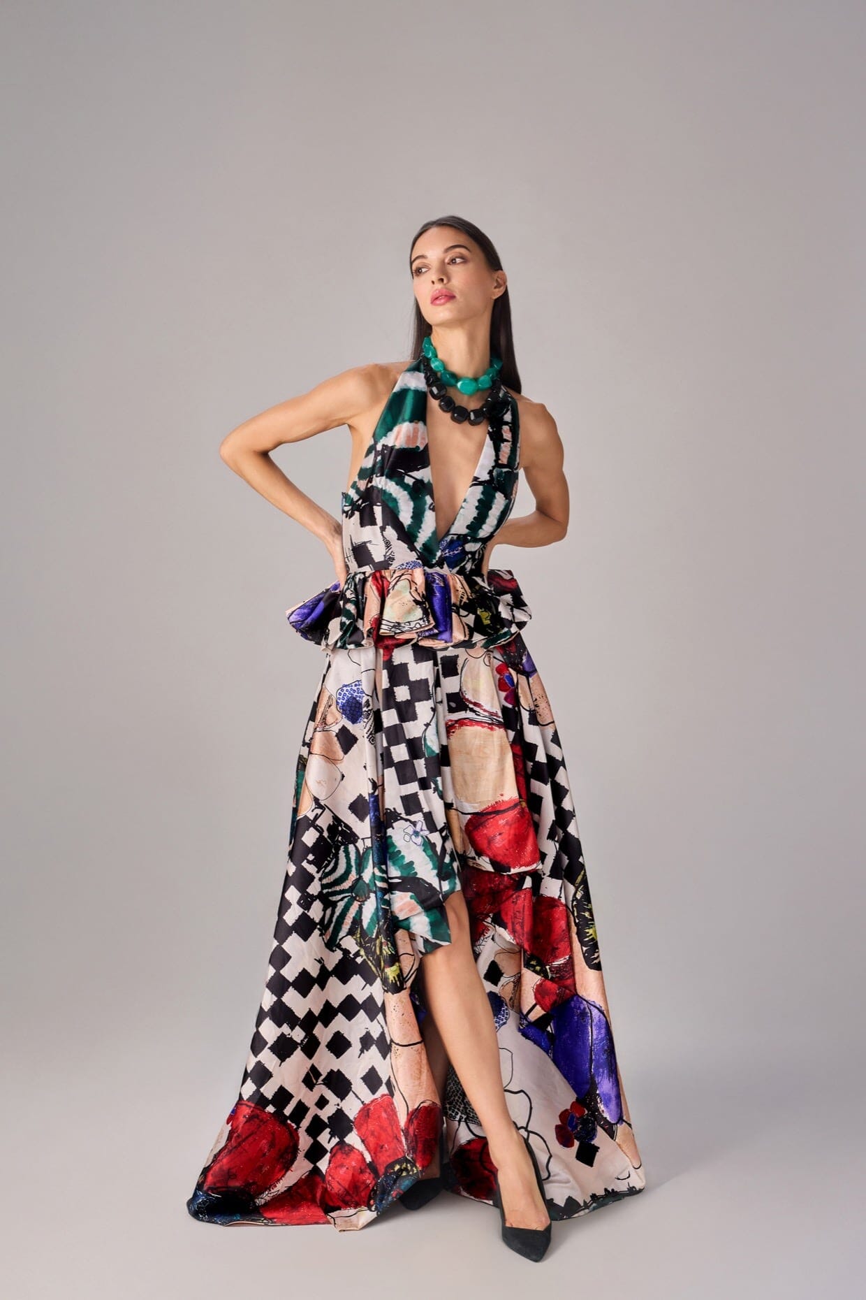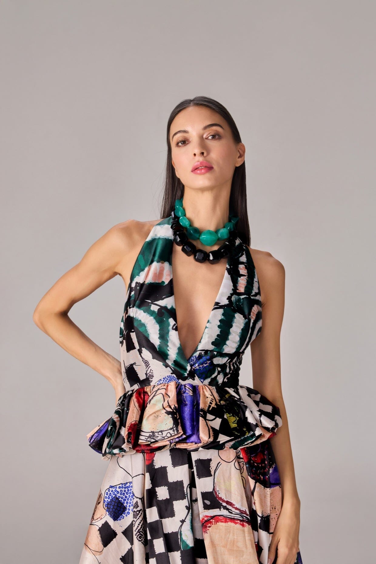 Abstract Print Halter Neck Sleeveless Blouse With Frill Detailing