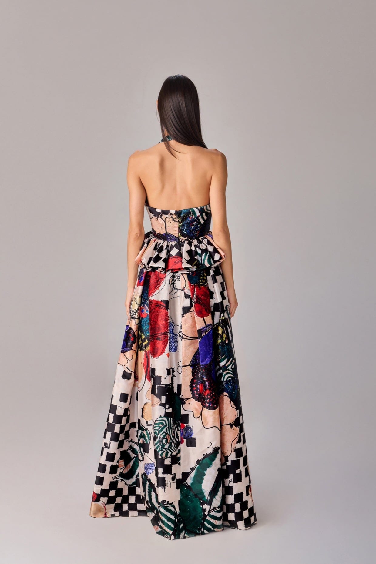 Floral And Checkered Print Asymmetric, High Waist Skirt