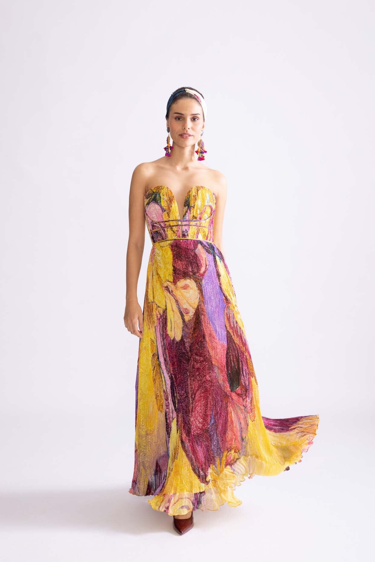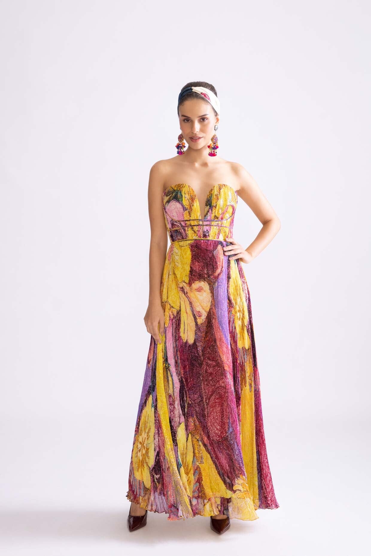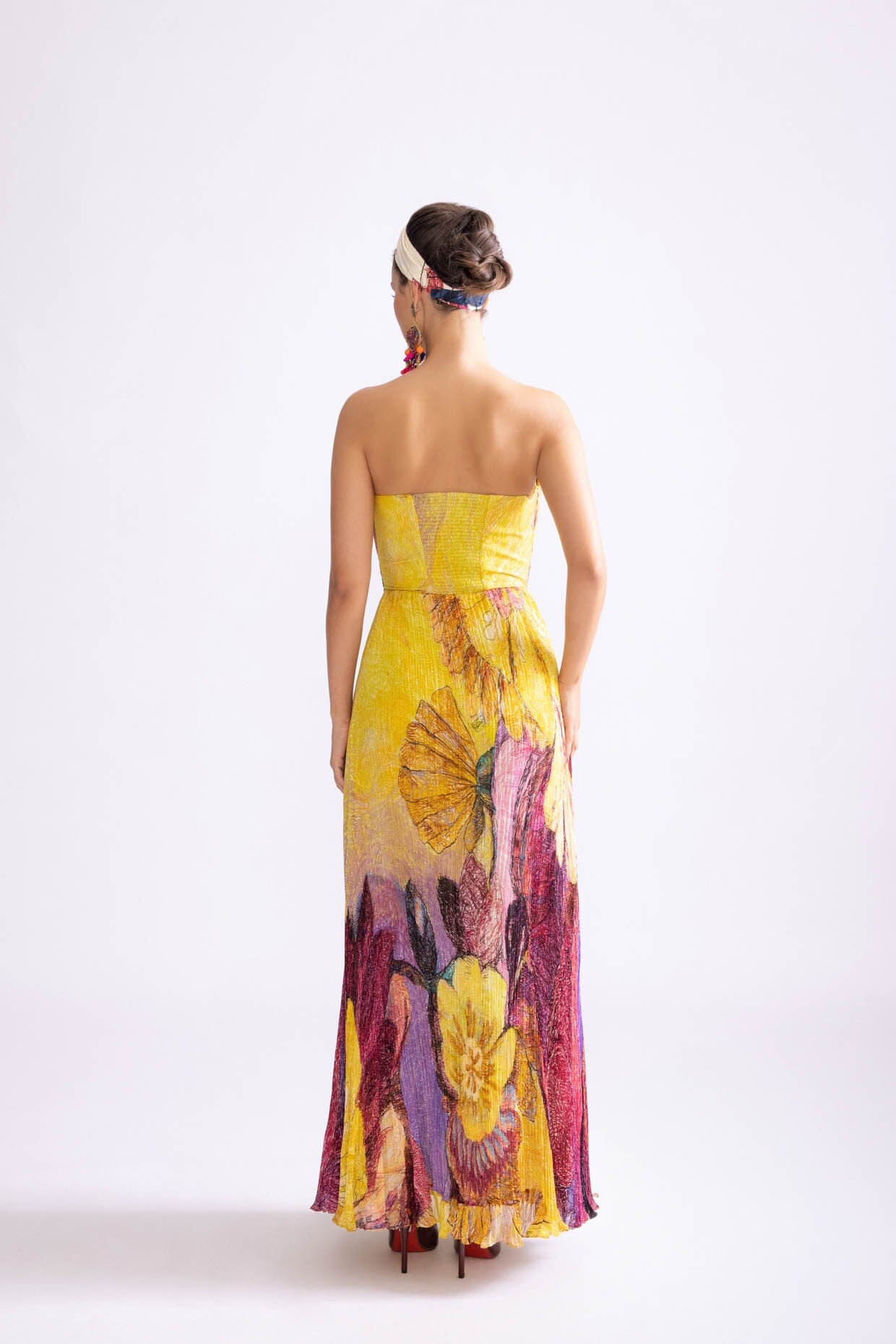 DAISY PRINT STRAPLESS CORSET STYLE GOWN WITH THREAD WIRE DETAILING