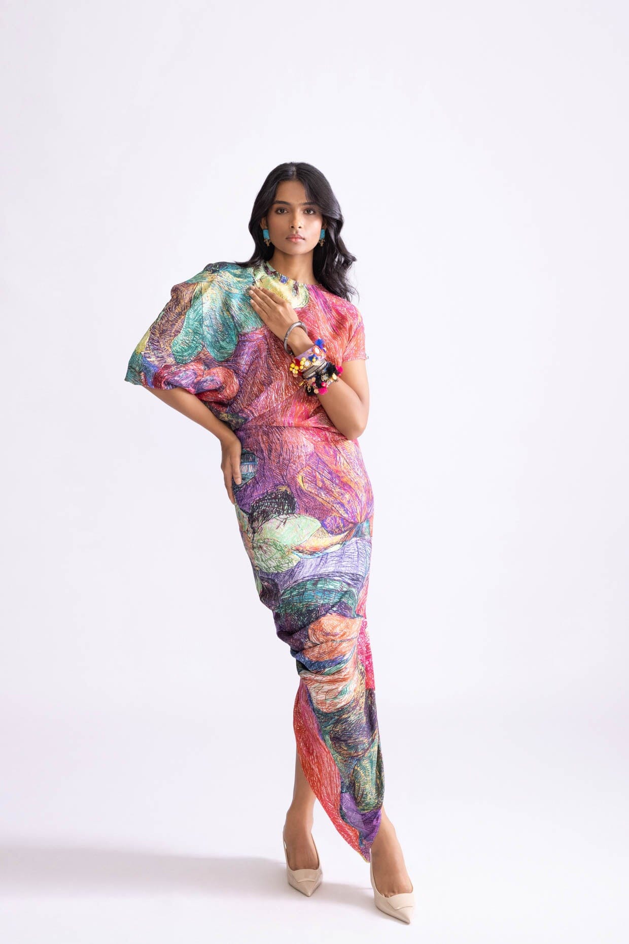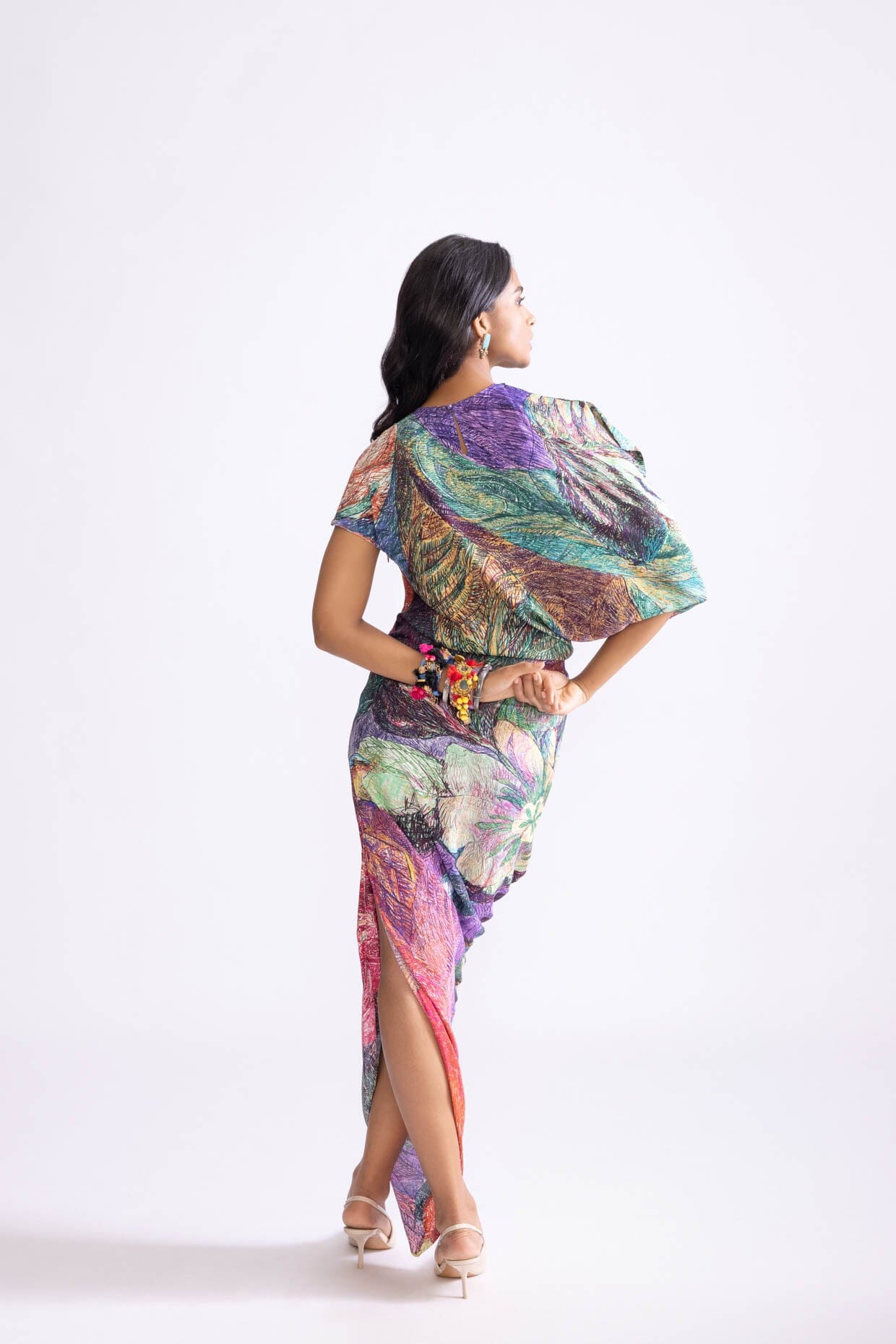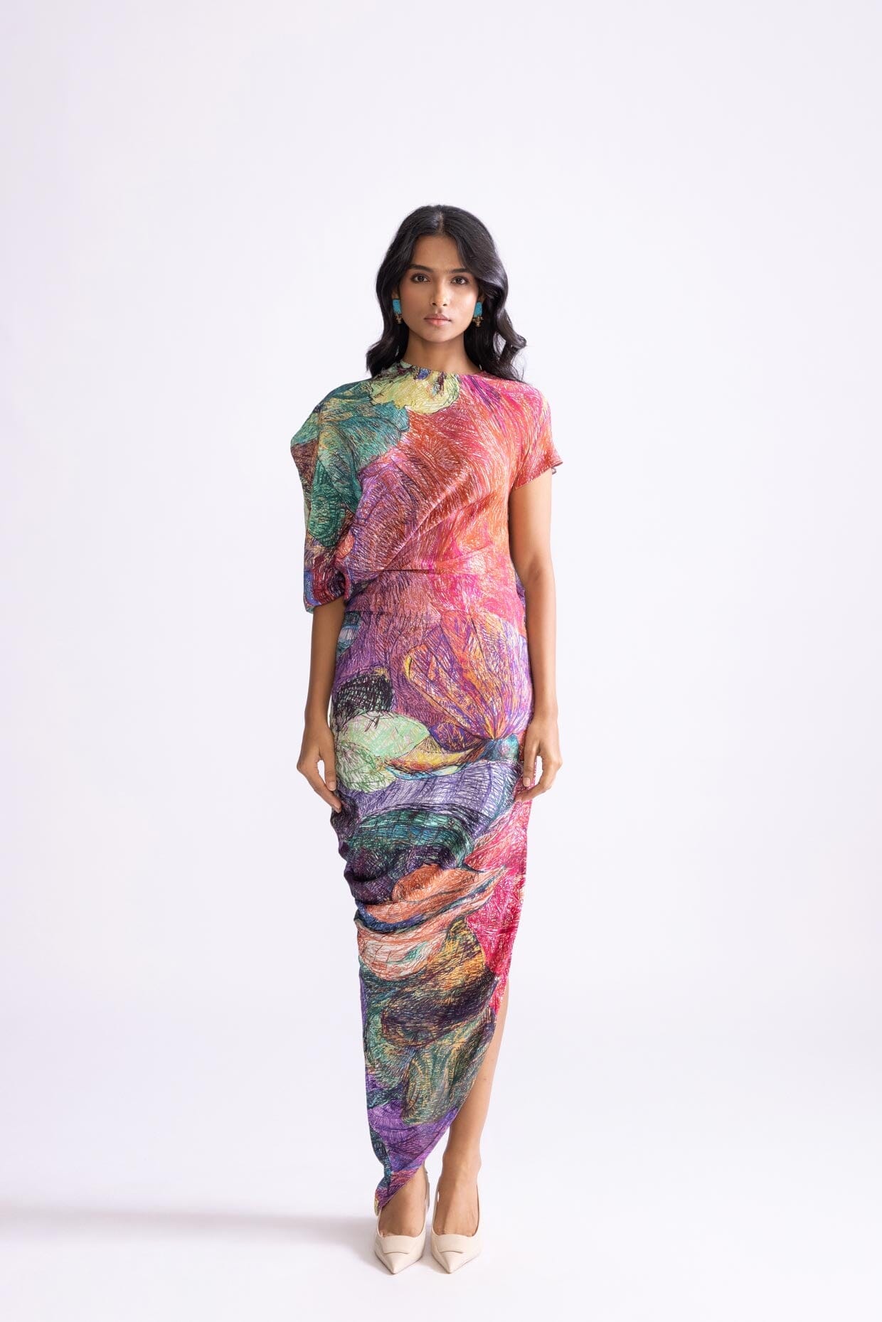 DAISY PRINT KAFTAN STYLE DRESS WITH DRAPE STYLE SKIRT