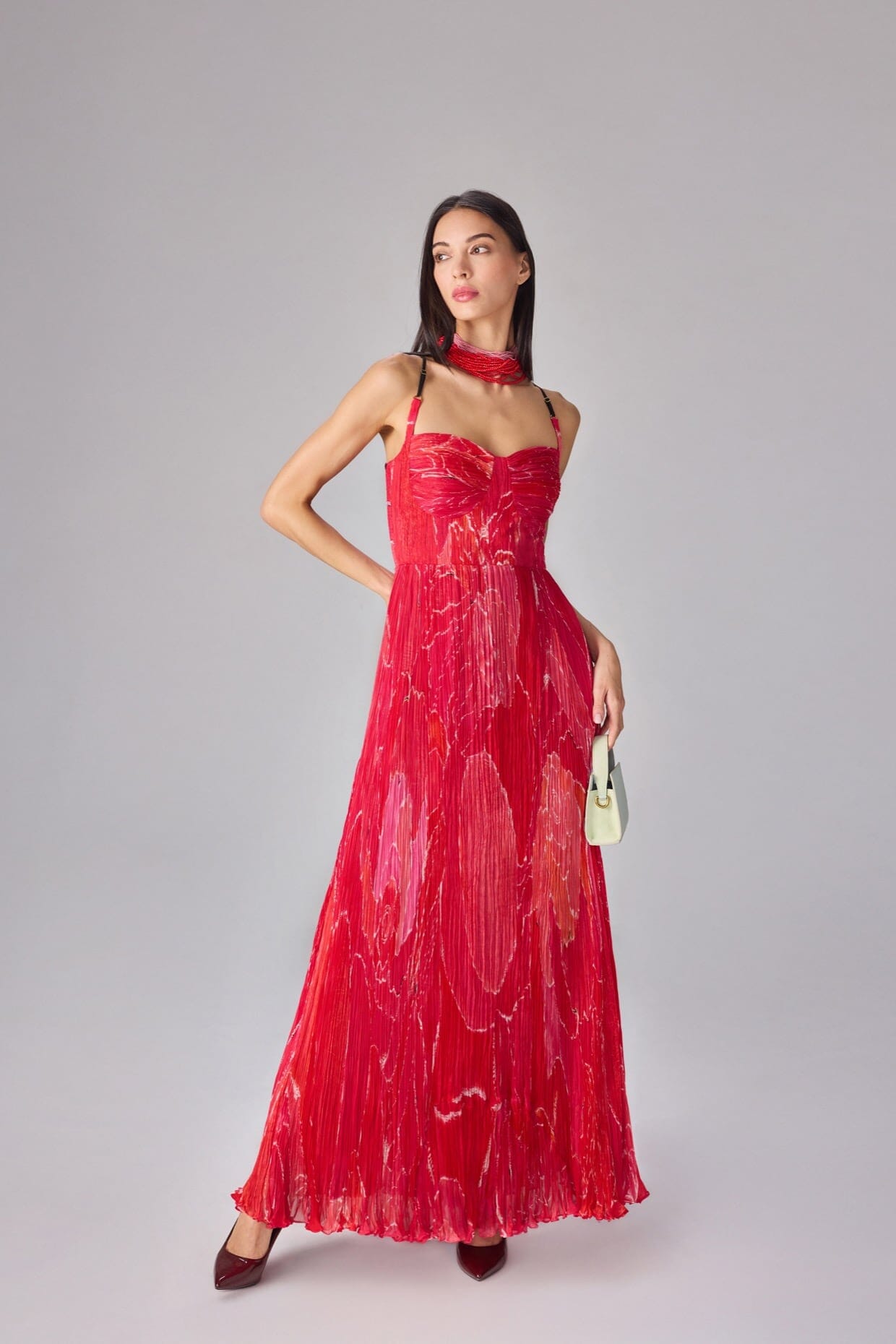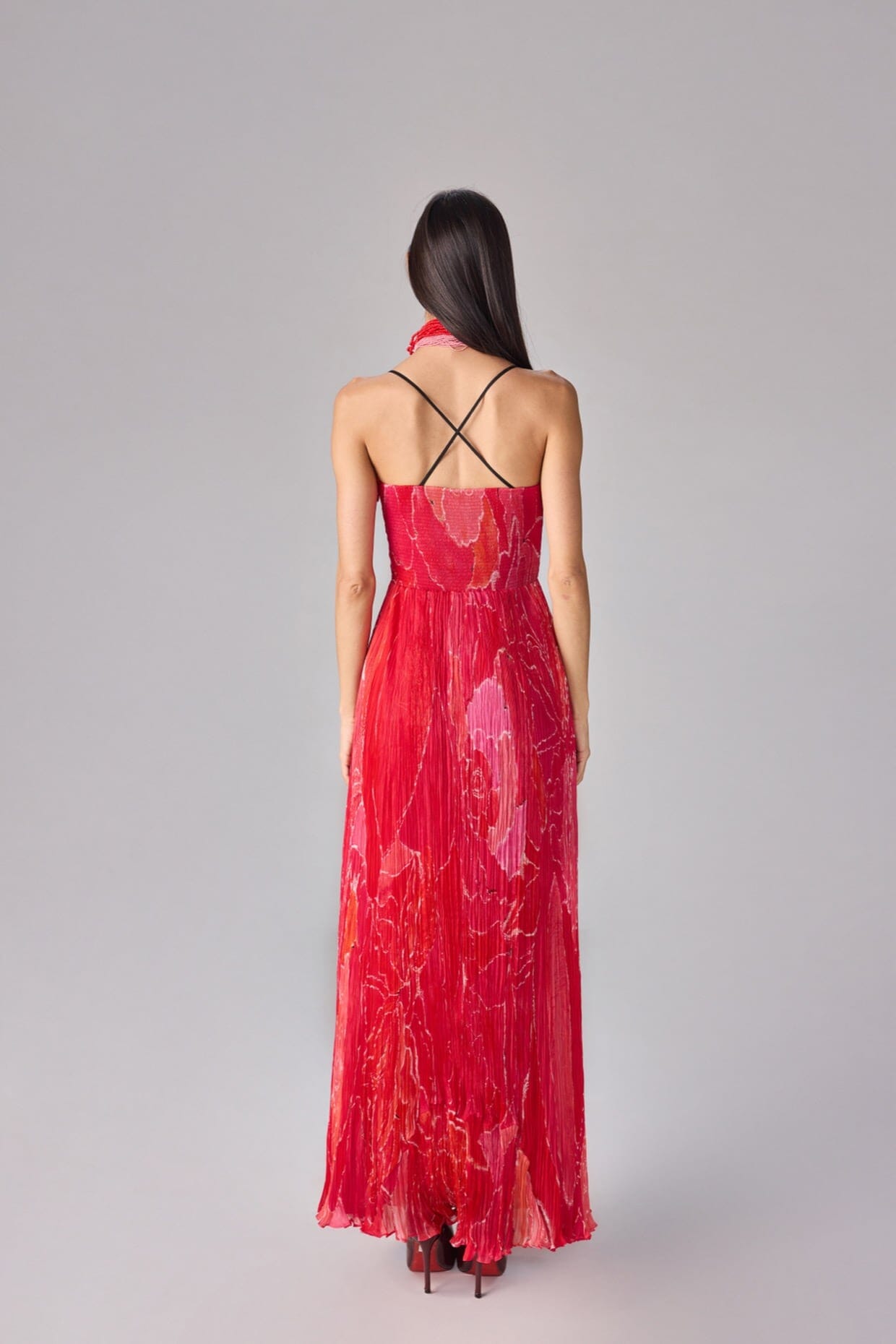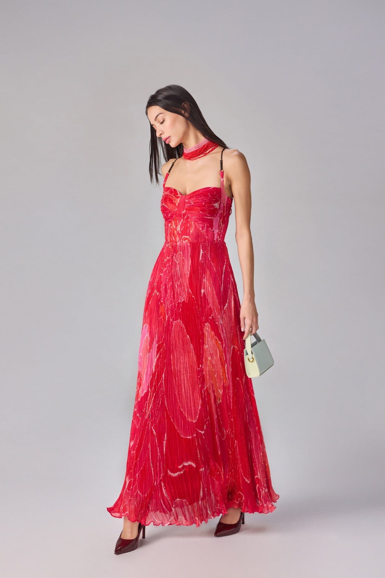 Abstract Floral Print, Hand Micro Pleat Maxi Dress With Adjustable Straps
