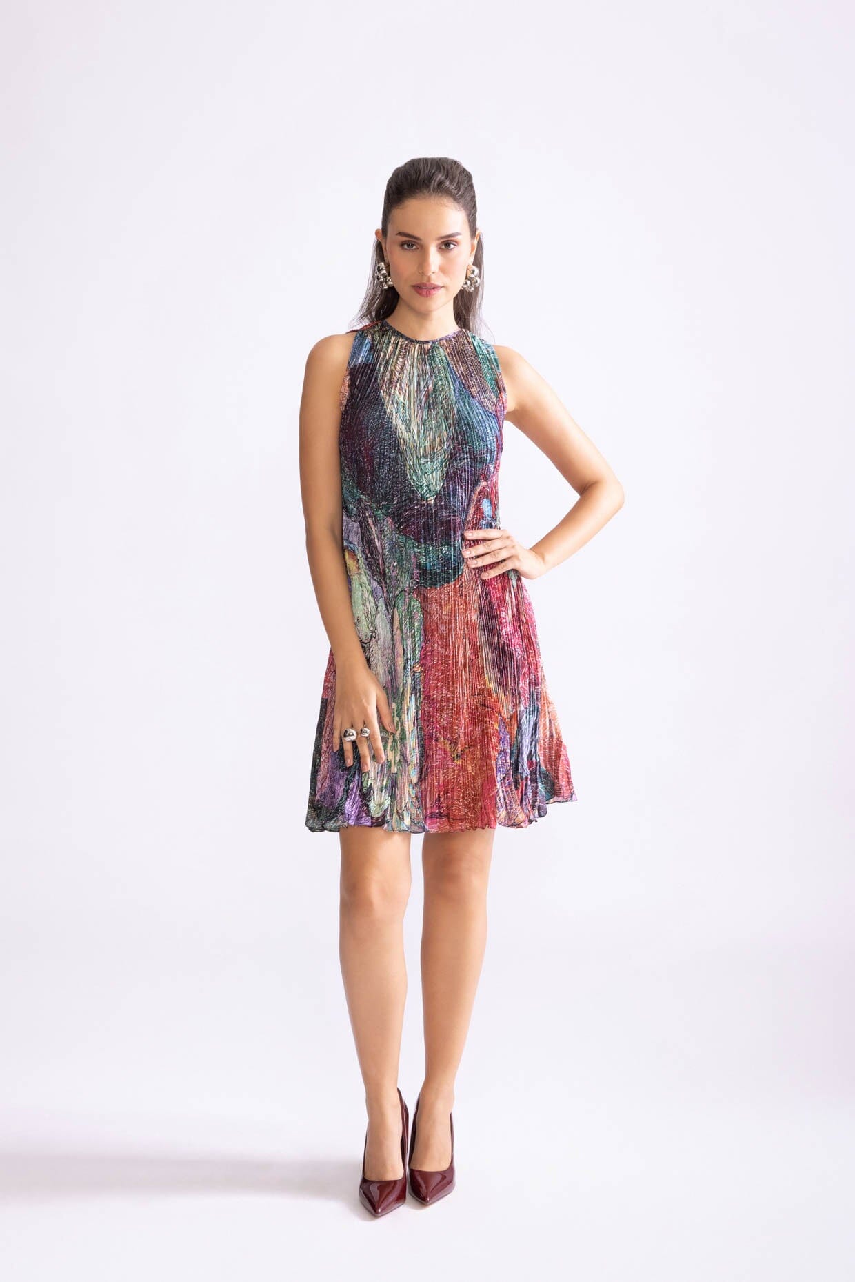 DAISY PRINT, HAND MICRO PLEAT, HIGH NECK SWING DRESS