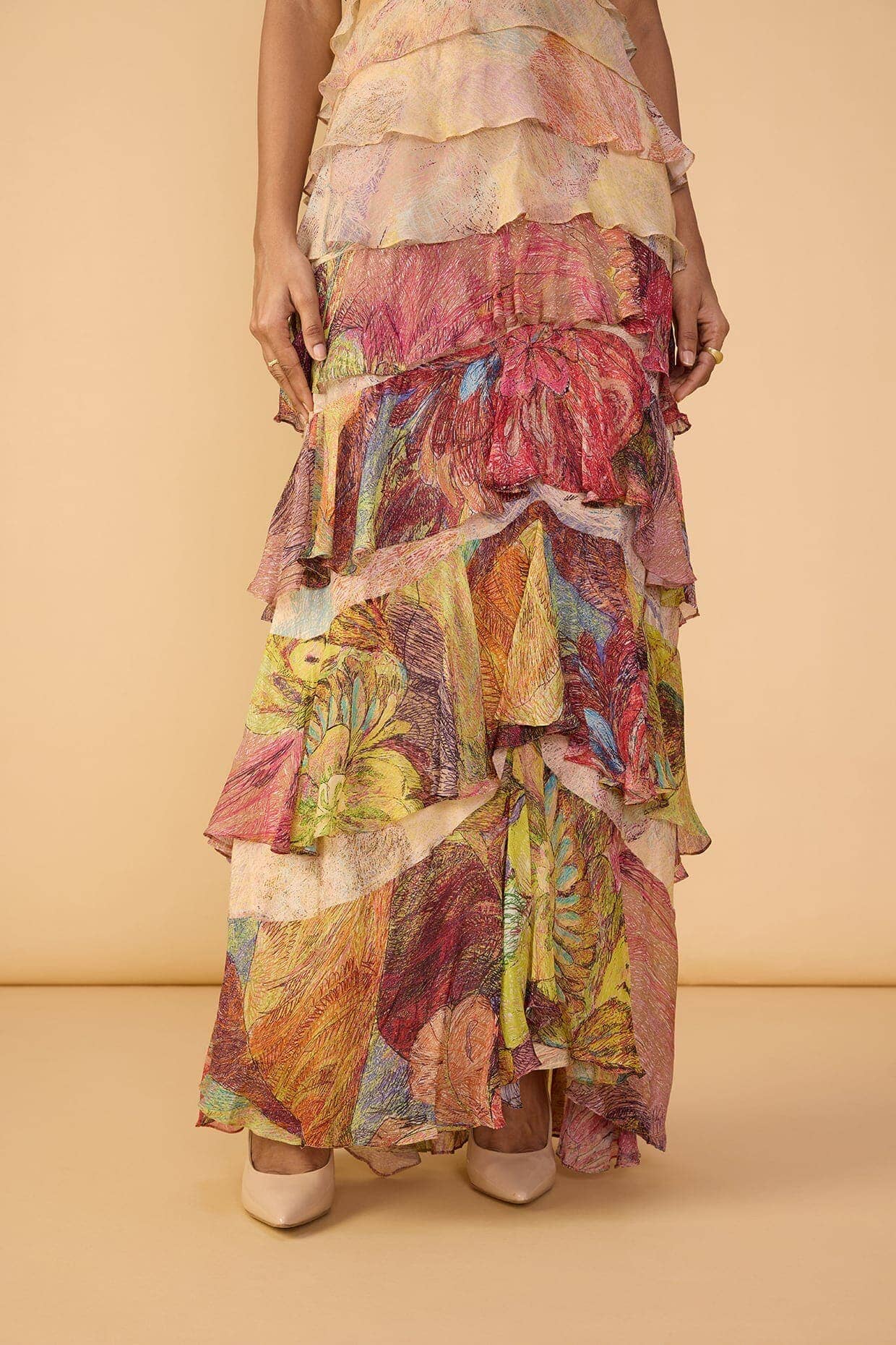 Dual abstract floral print tiered maxi dress with sweetheart neckline and adjustable straps