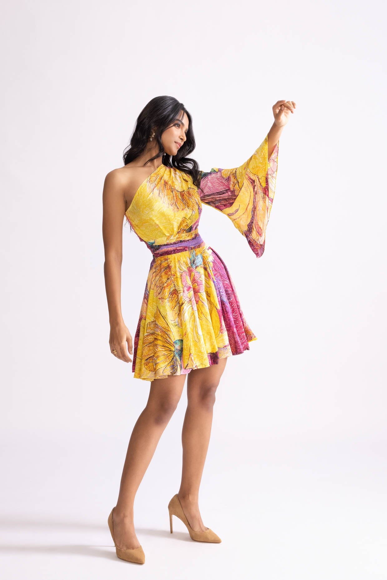 Let your style bloom with our daisy print dress. The one shoulder and flared design will make heads turn, perfect for a fun and flirty summer look.