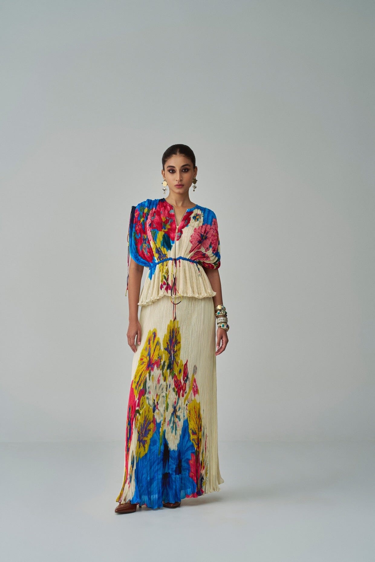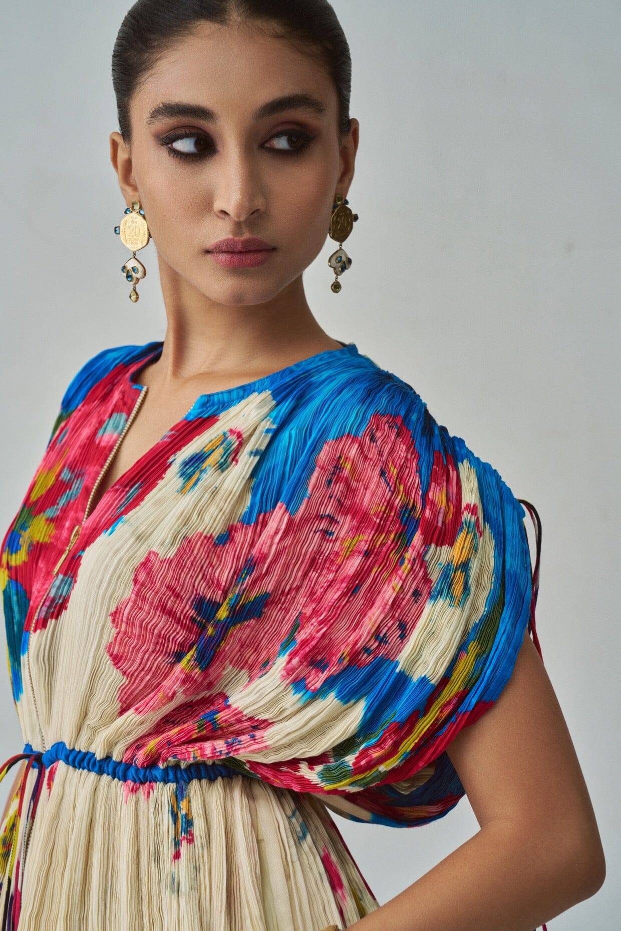 BLOUSE : FLORAL PRINT, HAND MICRO PLEAT KAFTAN STYLE BLOUSE WITH DRAWTSRING WAIST AND ADJUSTABLE SLEEVE