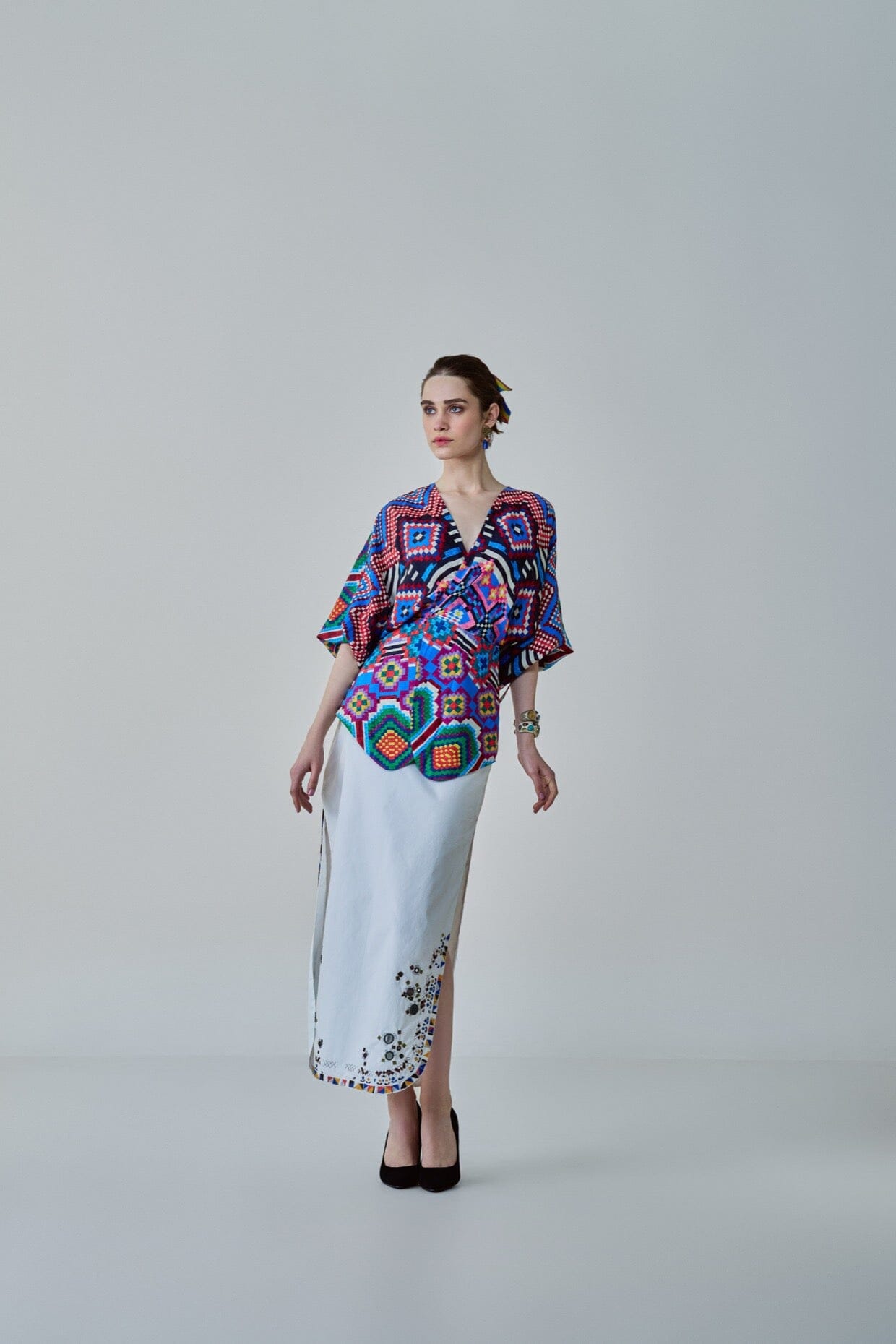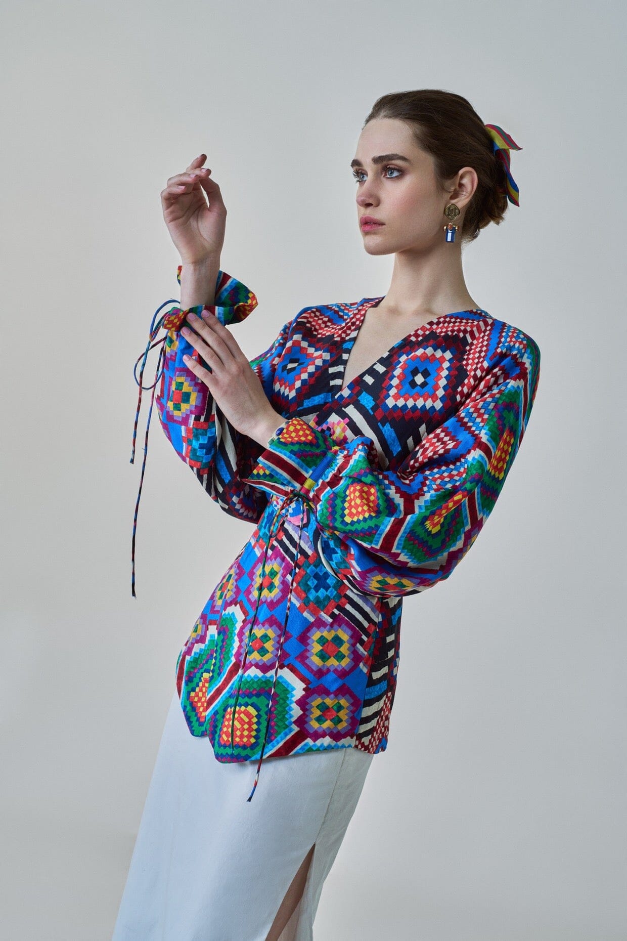 BLOUSE : IKAT PRINT INPSIRED WRAP STYLE BLOUSE WITH A TIE WAIST AND TIE UP ADJUSTABLE SLEEVES