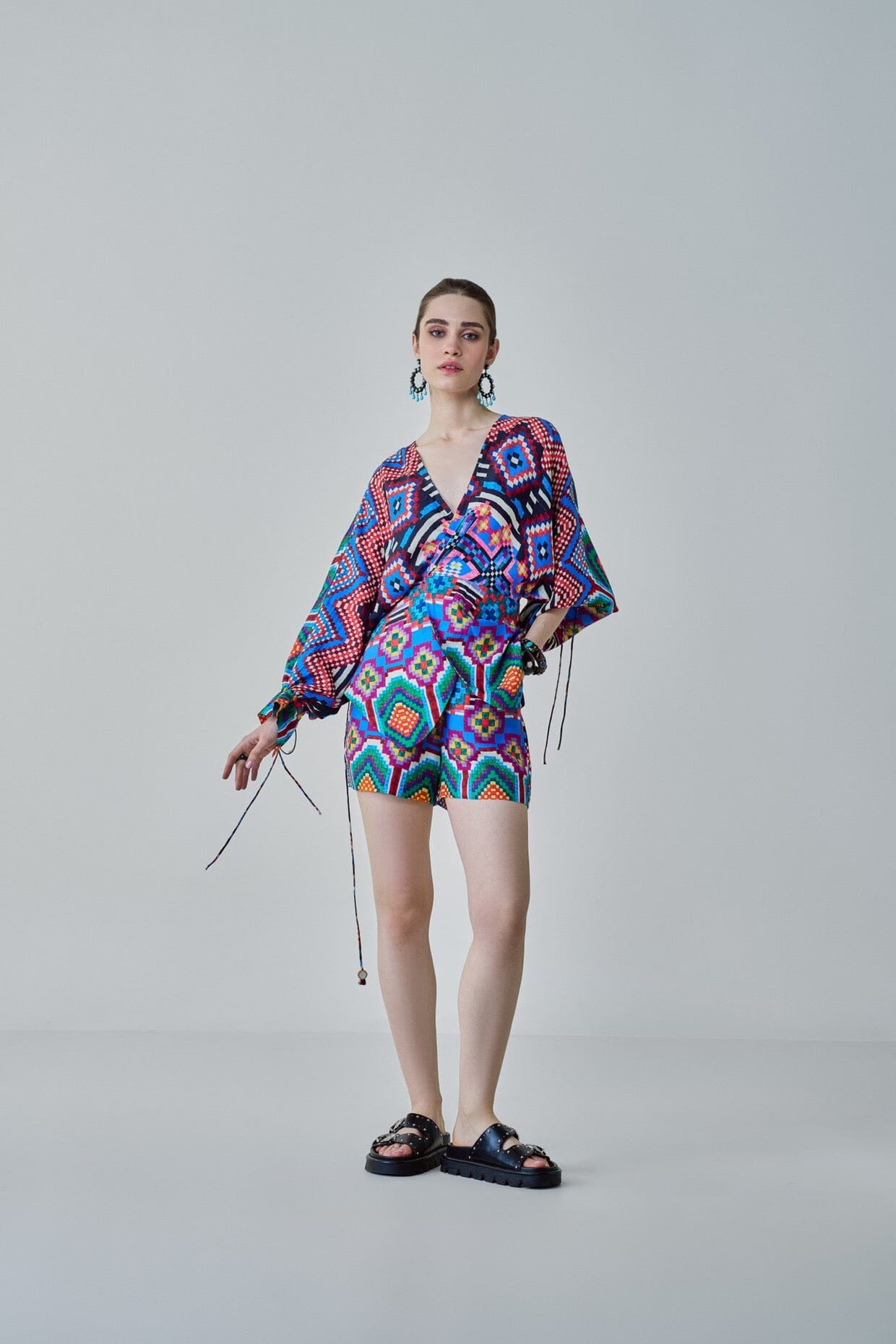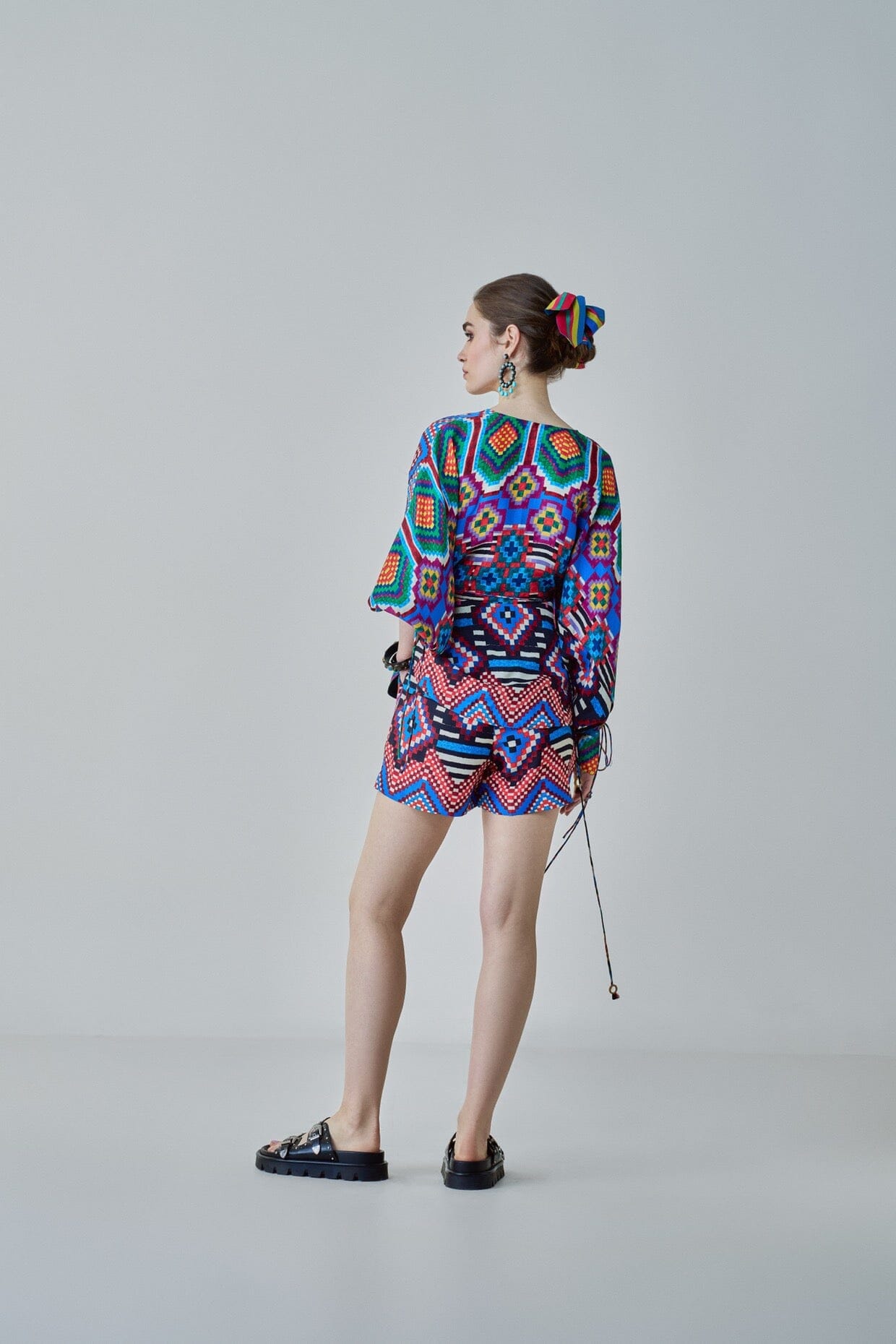 BLOUSE : IKAT PRINT INPSIRED WRAP STYLE BLOUSE WITH A TIE WAIST AND TIE UP ADJUSTABLE SLEEVES