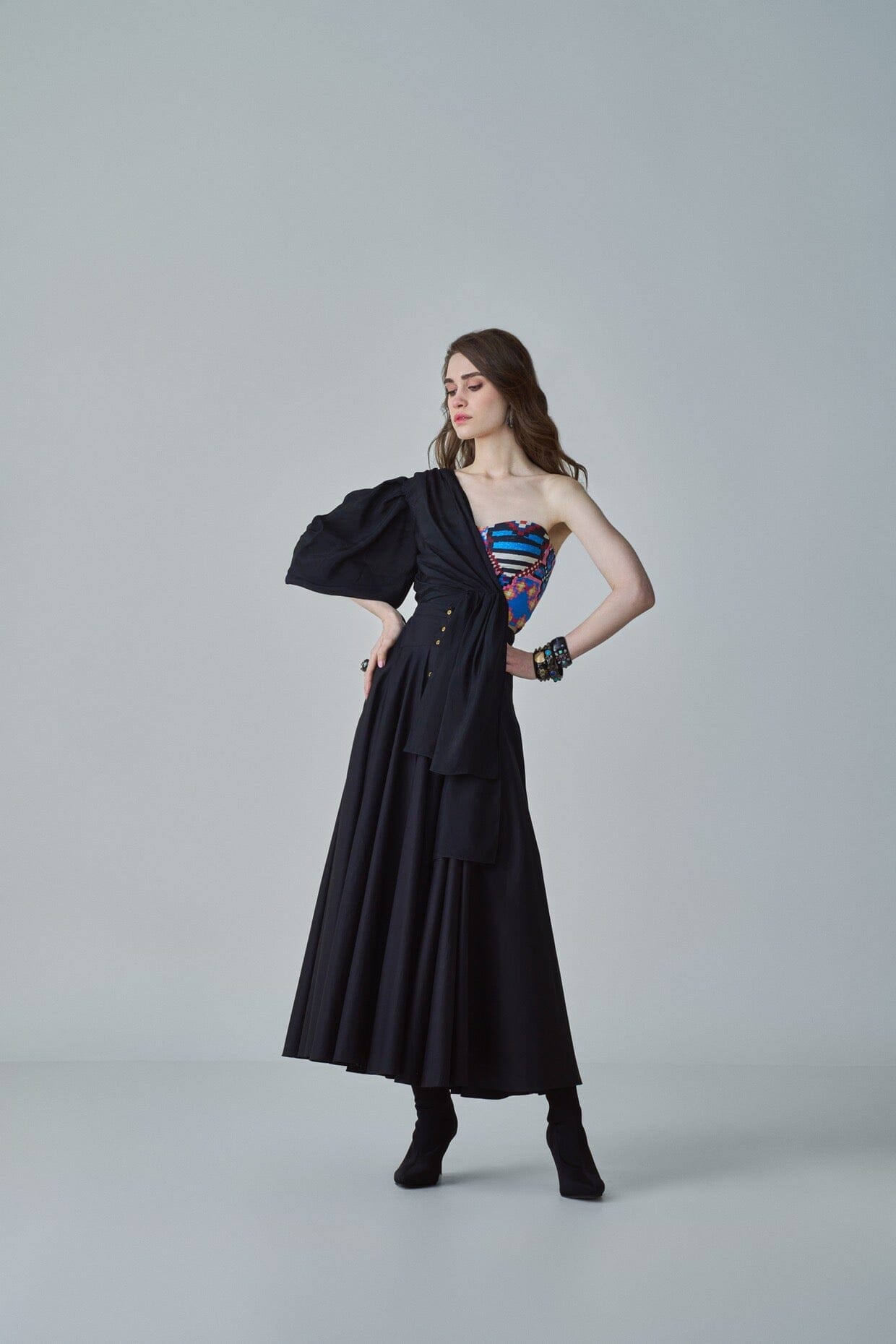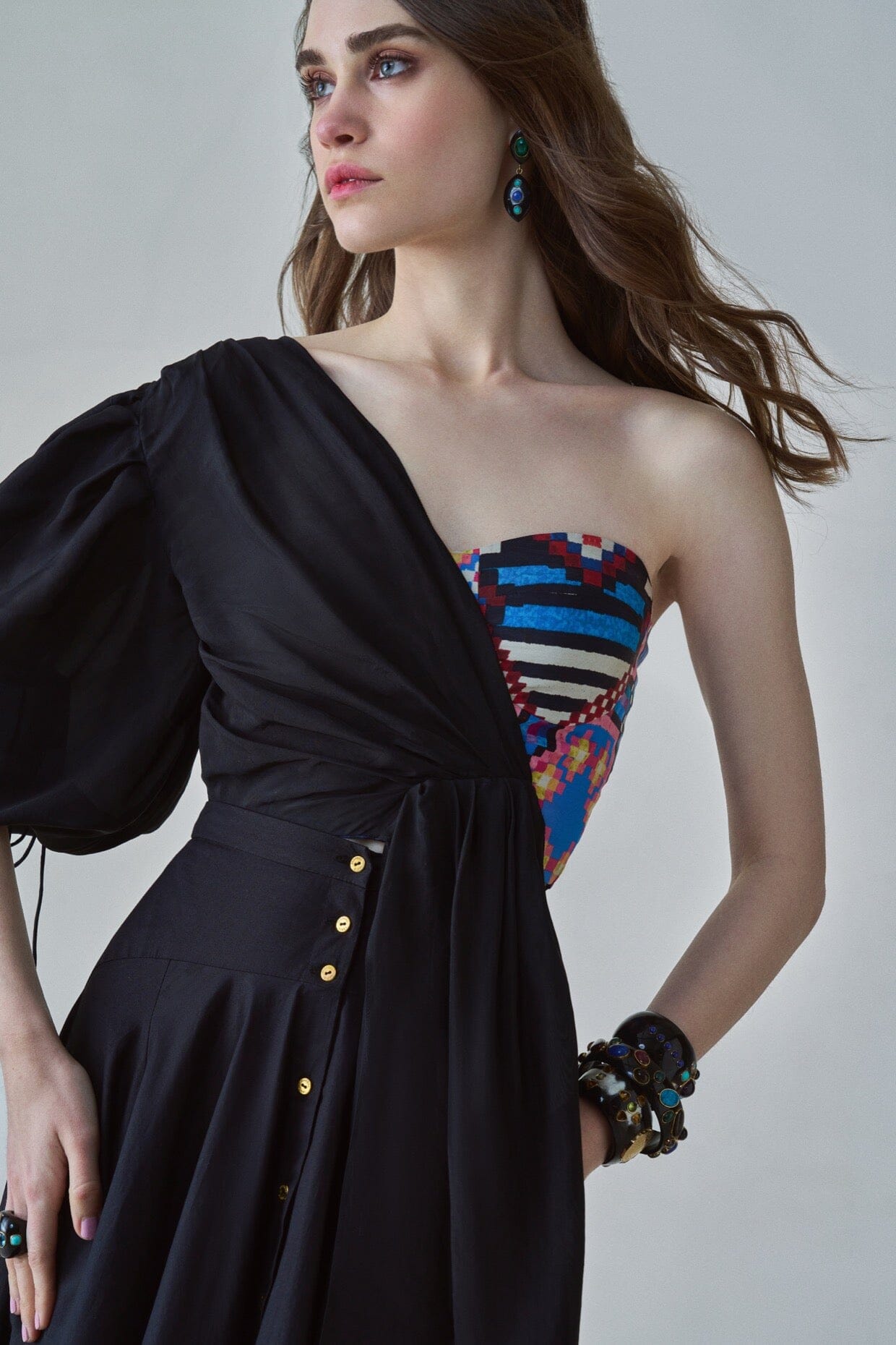 BLOUSE : DRAPE STYLE ONE SHOULDER BALLOON SLEEVE BLOUSE WITH PART PRINT BODICE AND HANGING DRAPERY