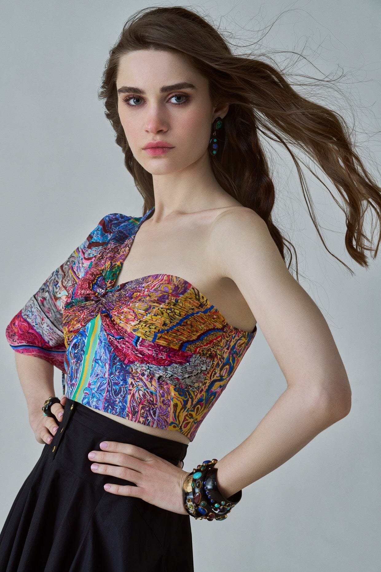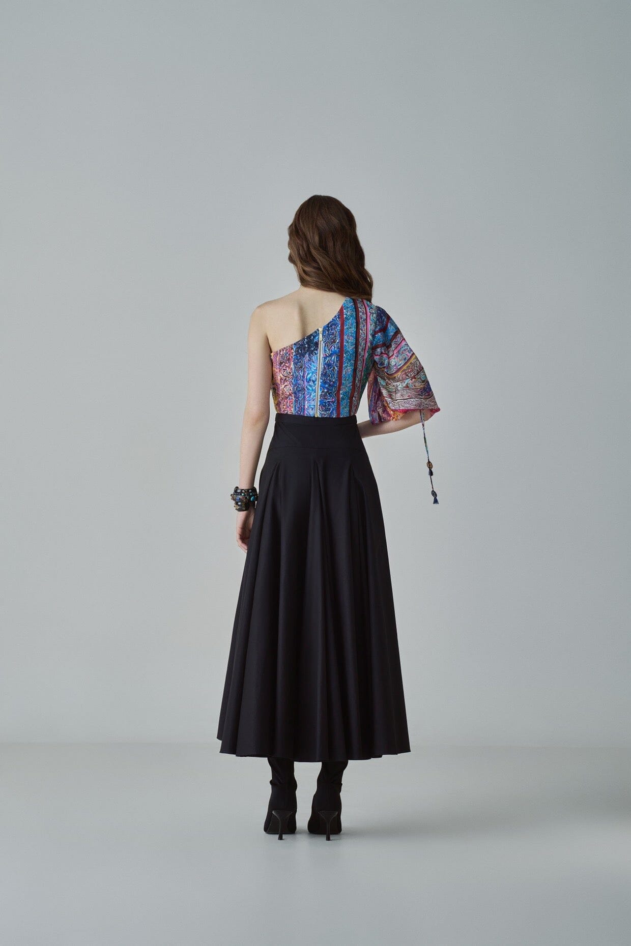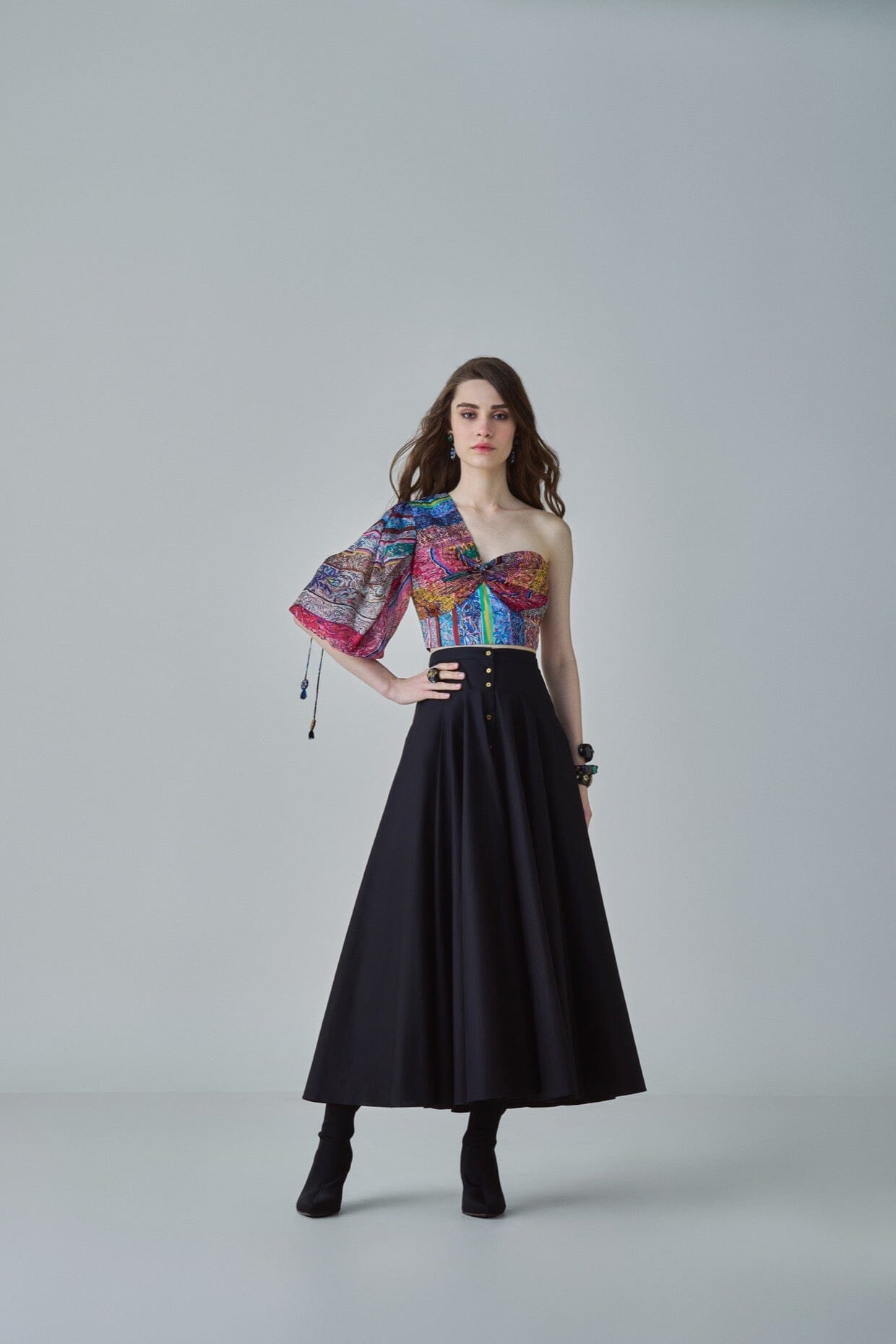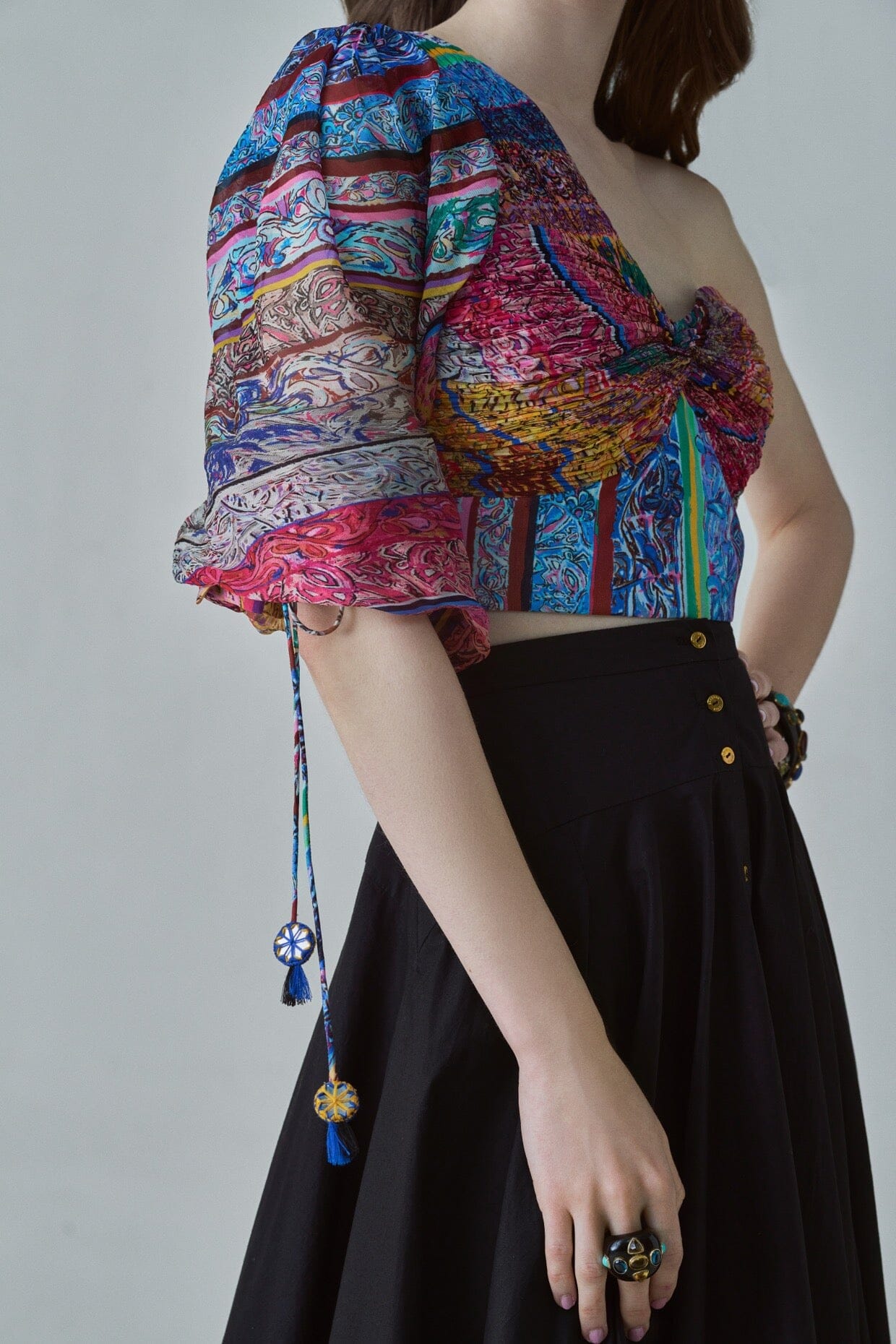 BLOUSE : BLOCK PRINT INSPIRED, PART HAND MICRO PLEAT ONE SHOULDER BLOUSE WITH BALLOON SLEEVE AND KNOT DETAILING