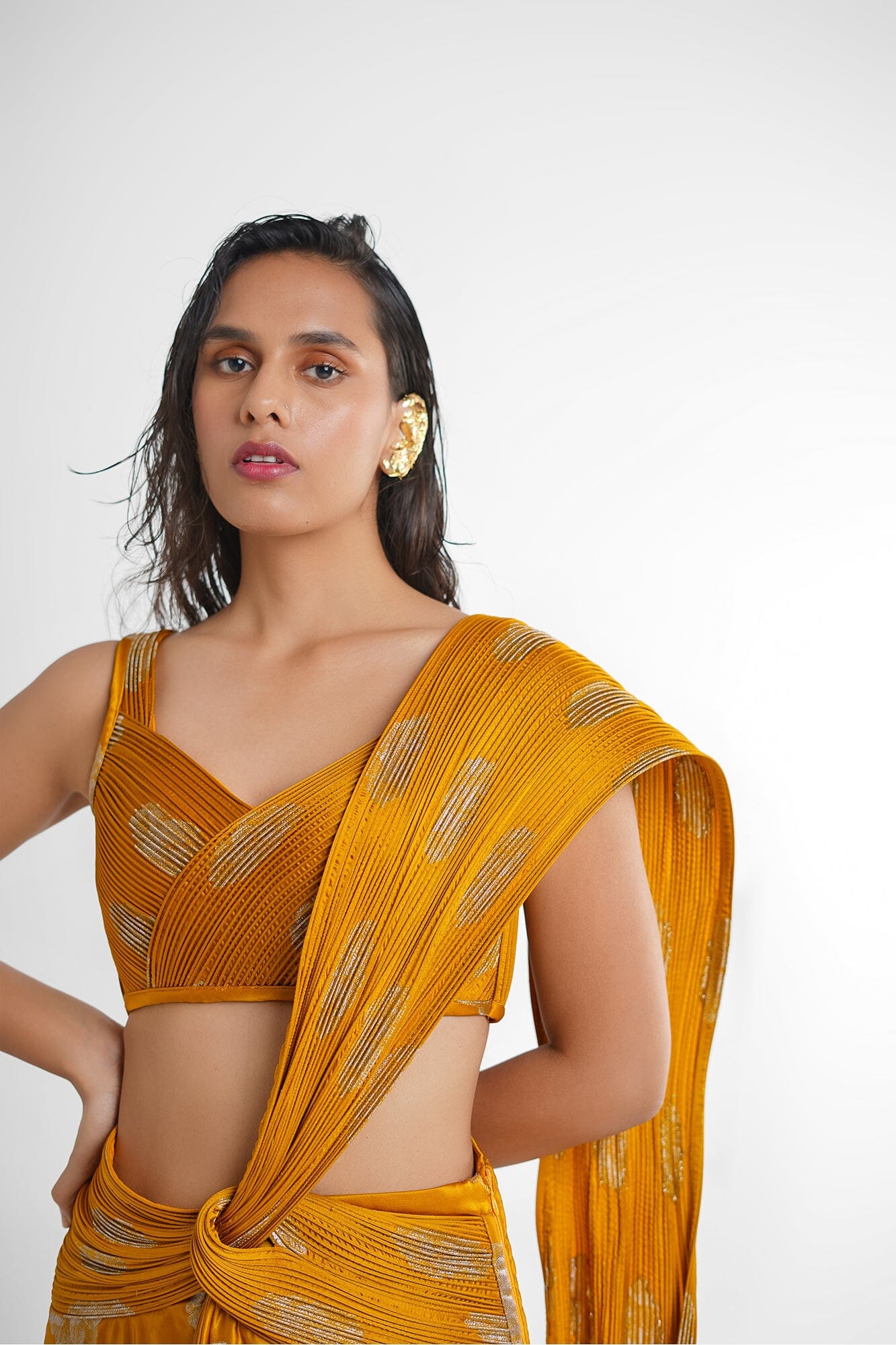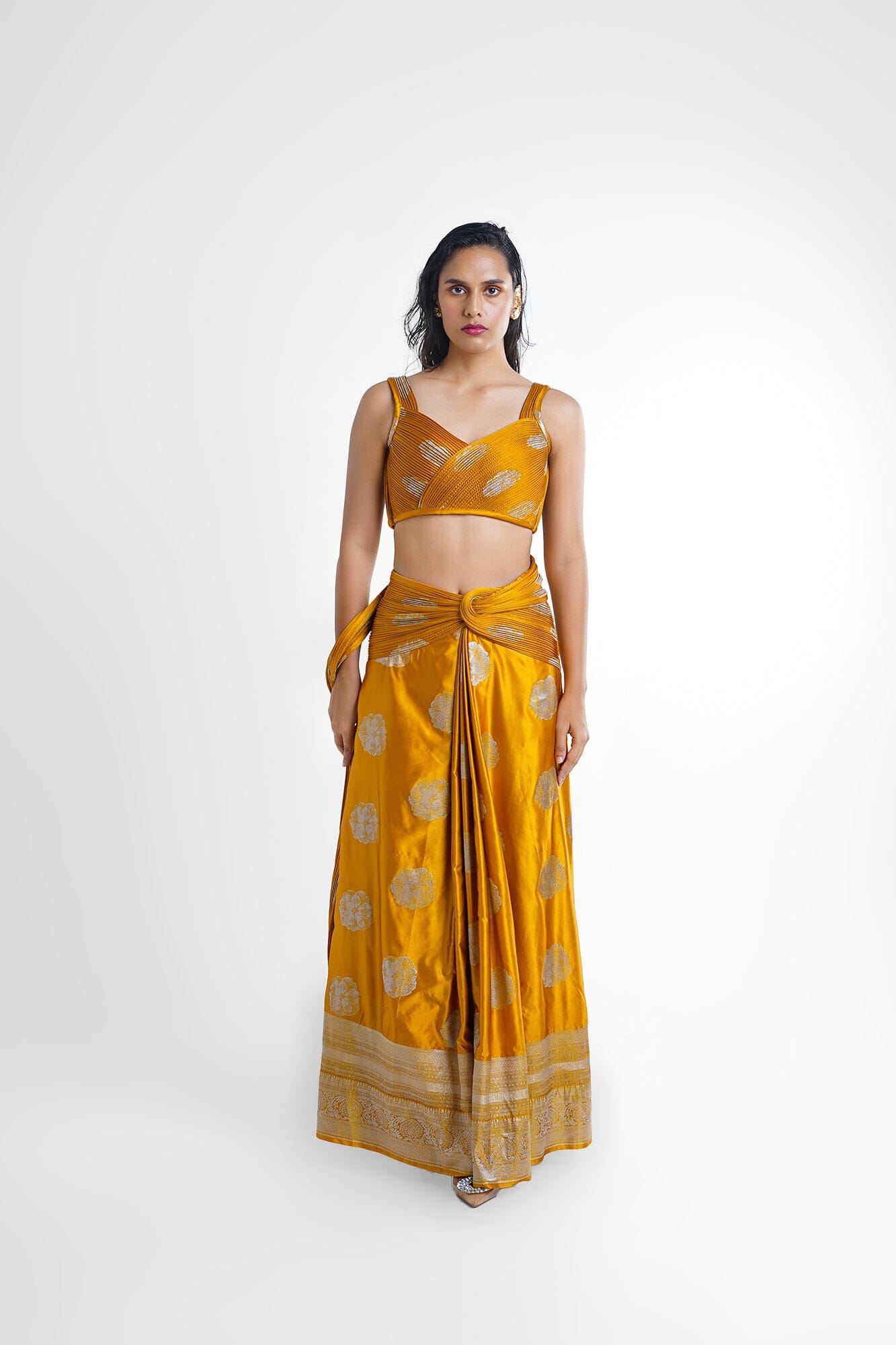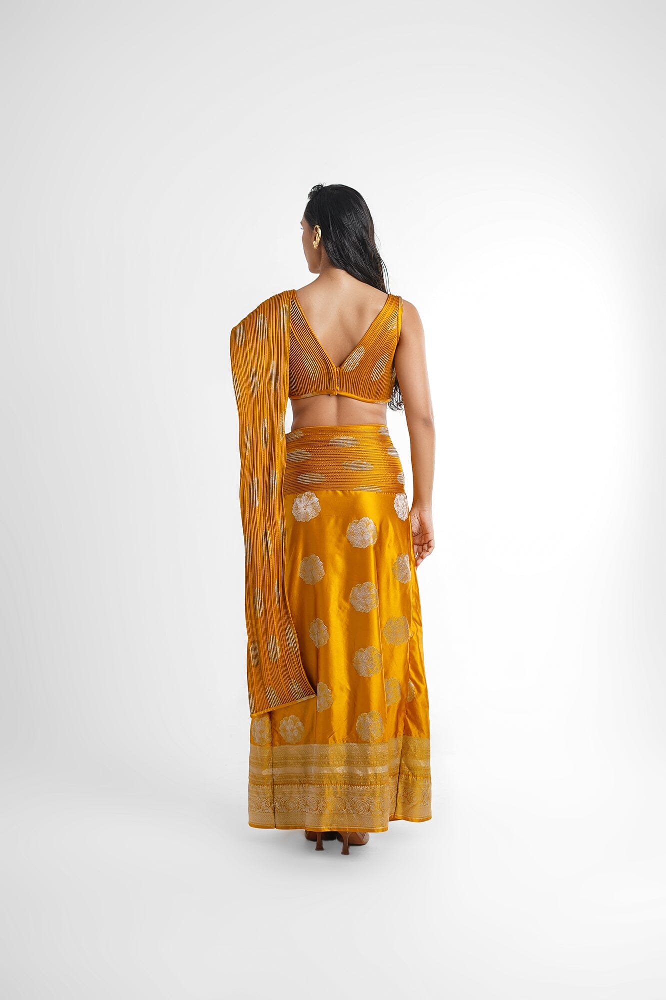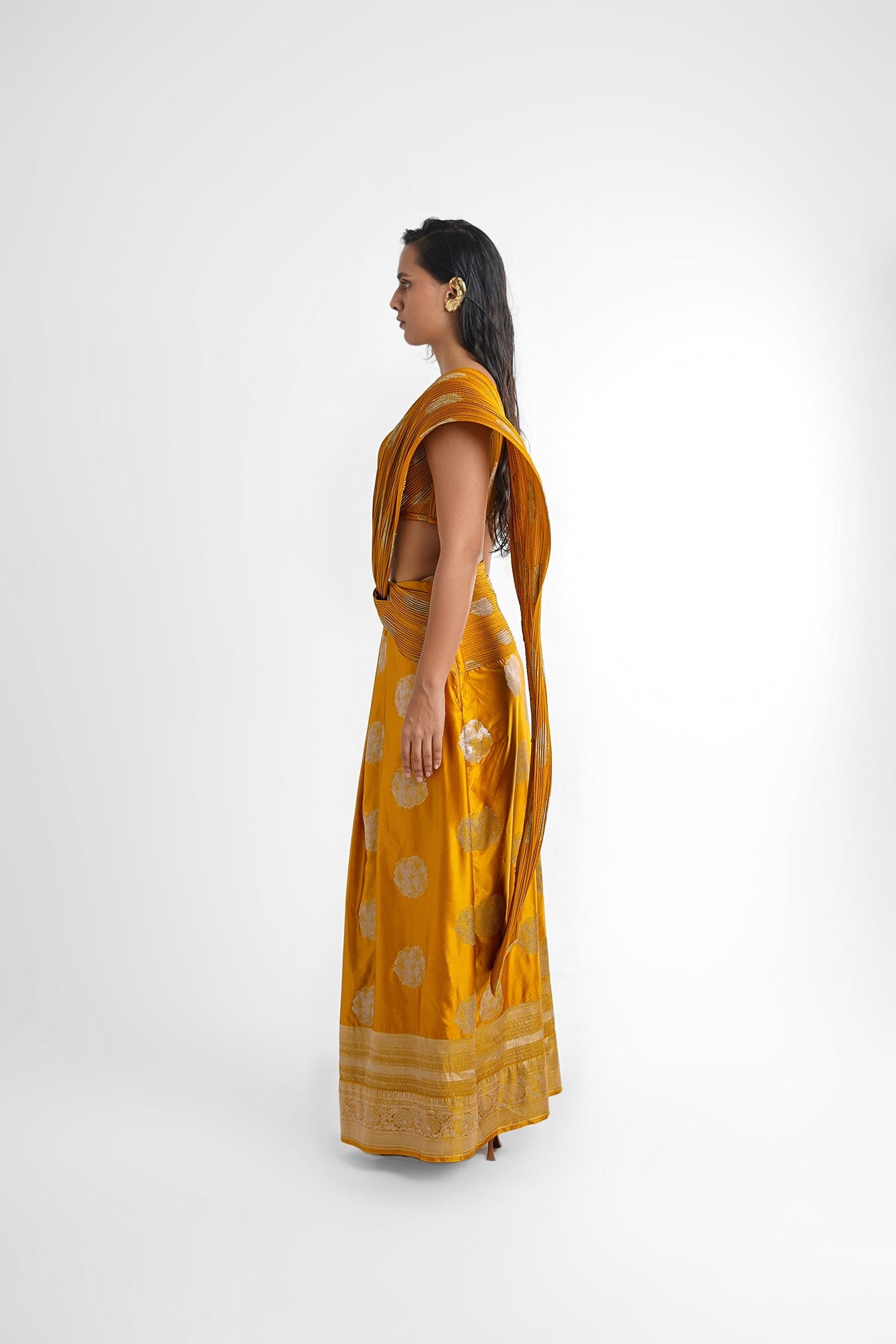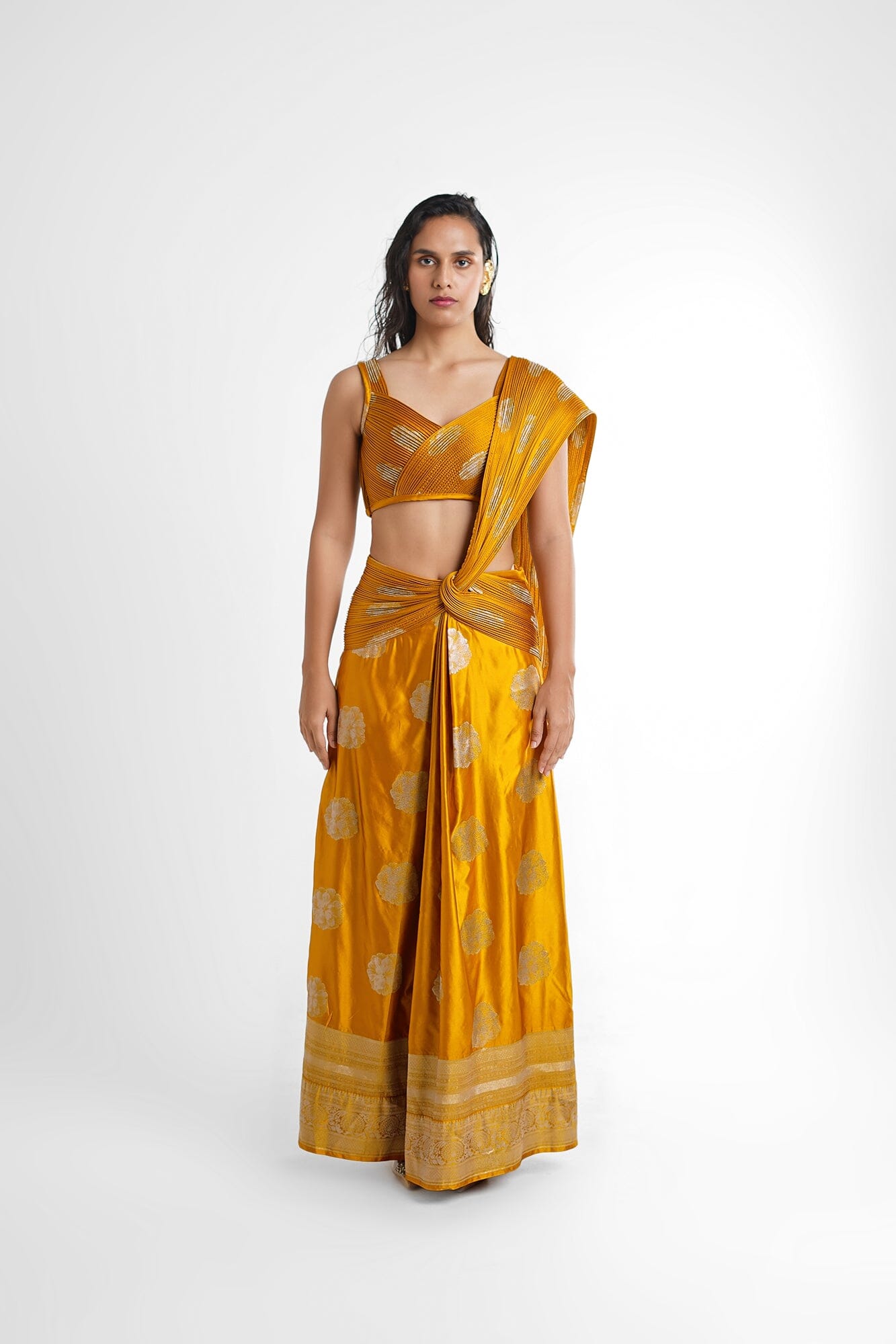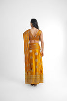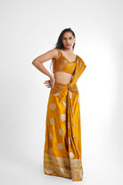 Alia Concept Saree in Mustard/ yellow, features a pre stitched saree attached with a hand sculpted banarasi palla and a v neck blouse achieved with a skilful technique. This saree is a perfect pick for your evening soiree, weddings.