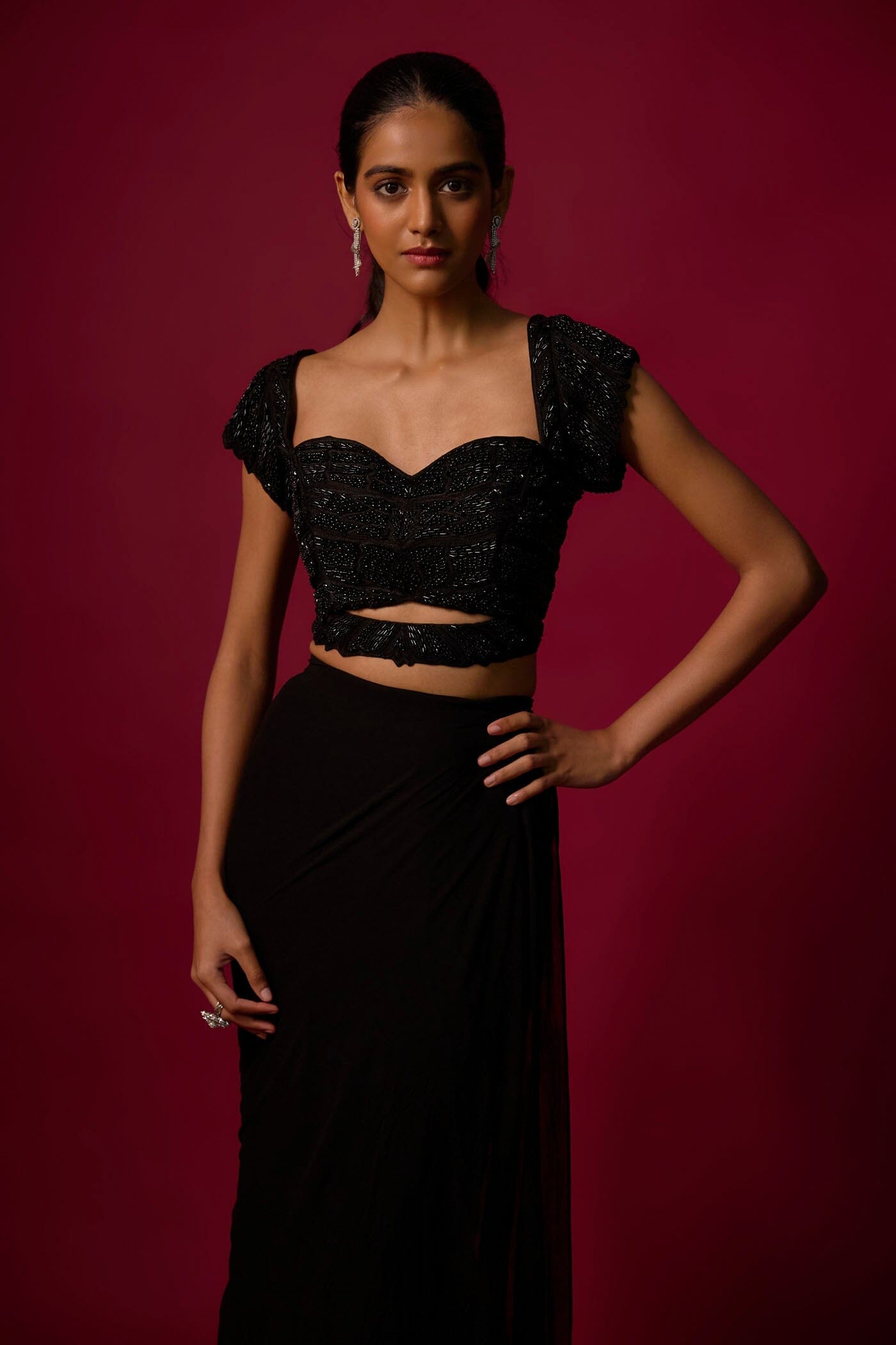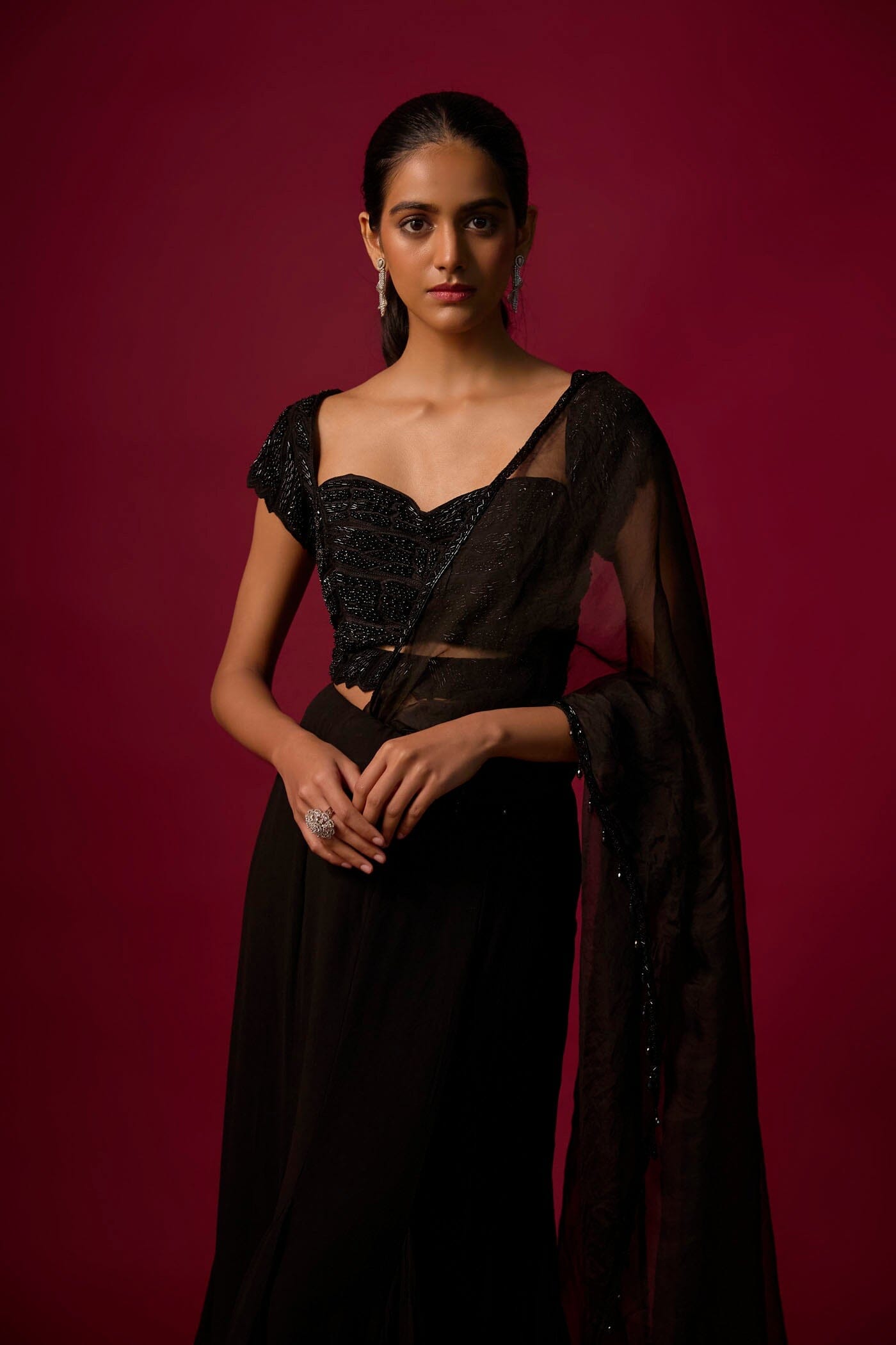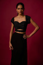 Elevate your style with a black georgette ruffle skirt paired with a cap-sleeve choli featuring a sexy under-bust peep cut and intricate tone-on-tone embroidery with tubes and sequins. A sheer organza pallu, edged with delicate embroidery and sprinkled with hanging crystals, completes this chic, classy, and fuss-free ensemble.